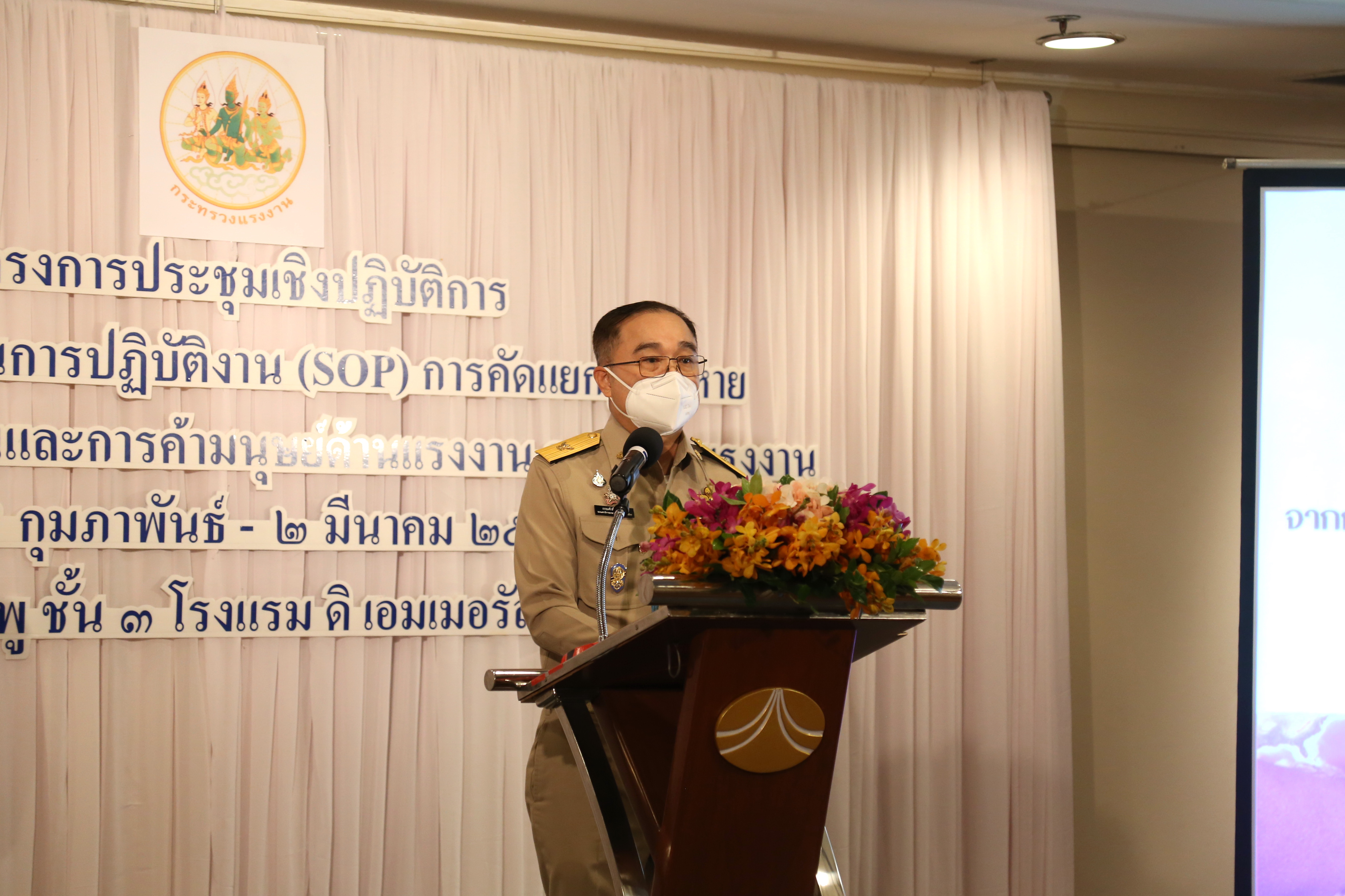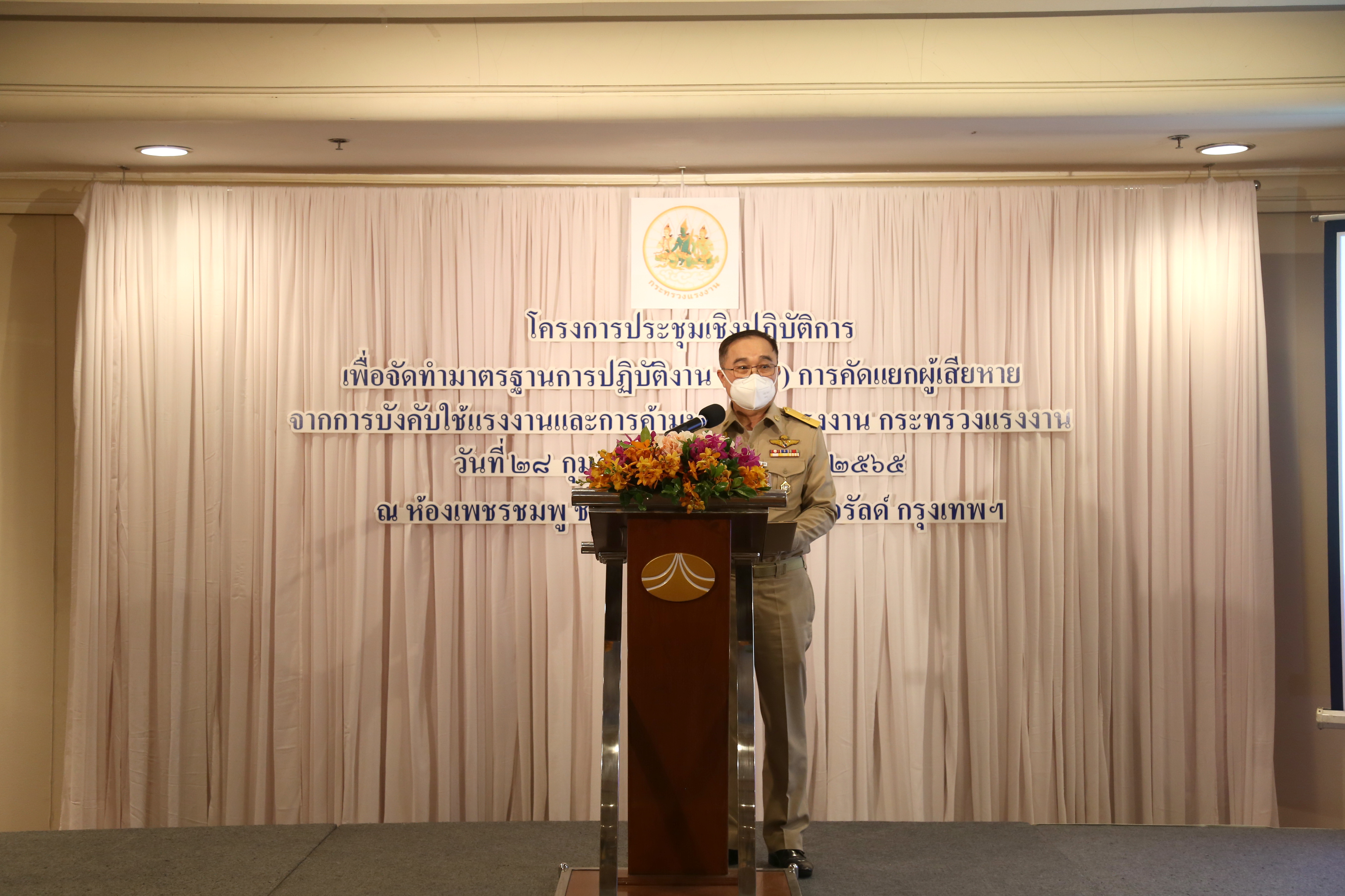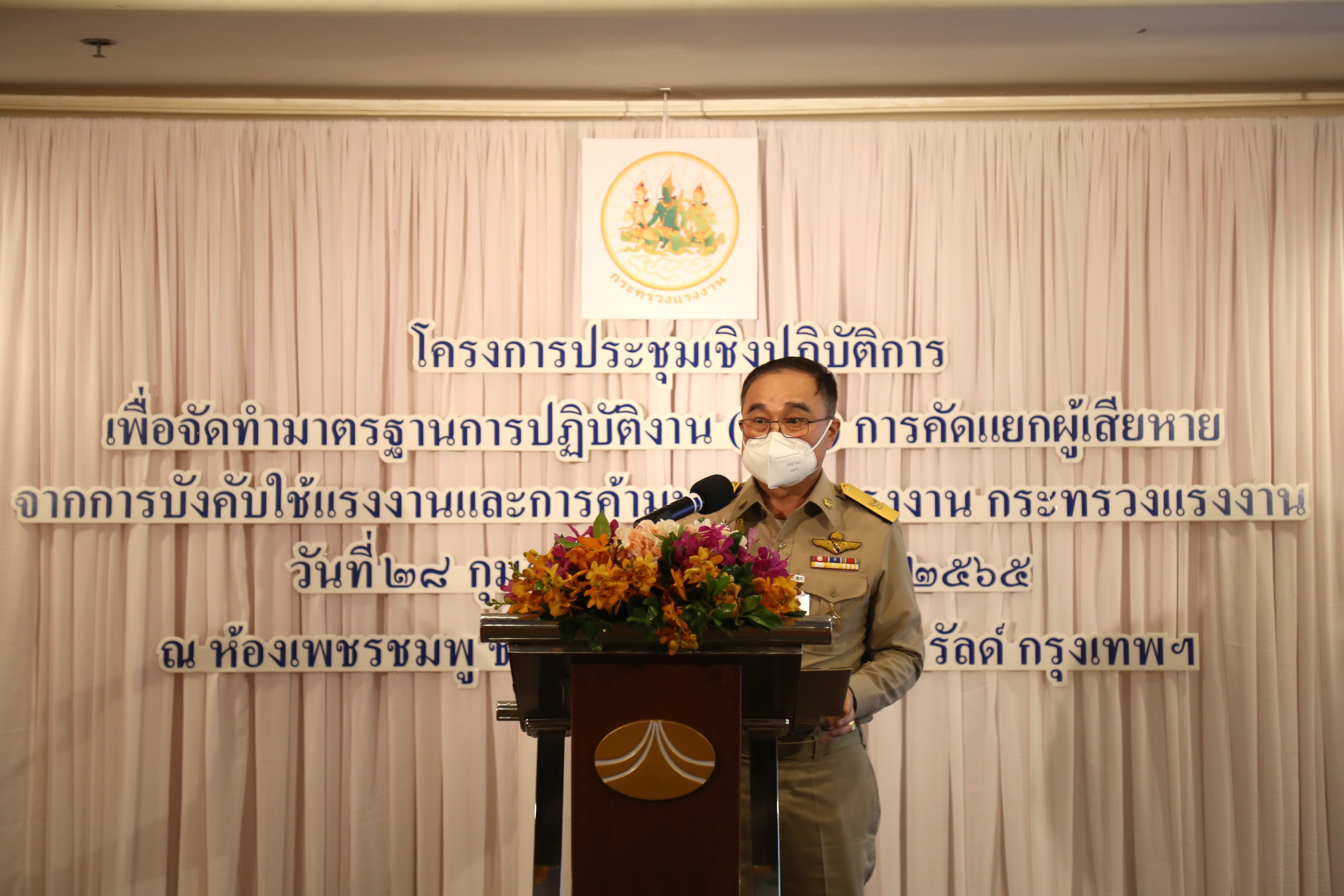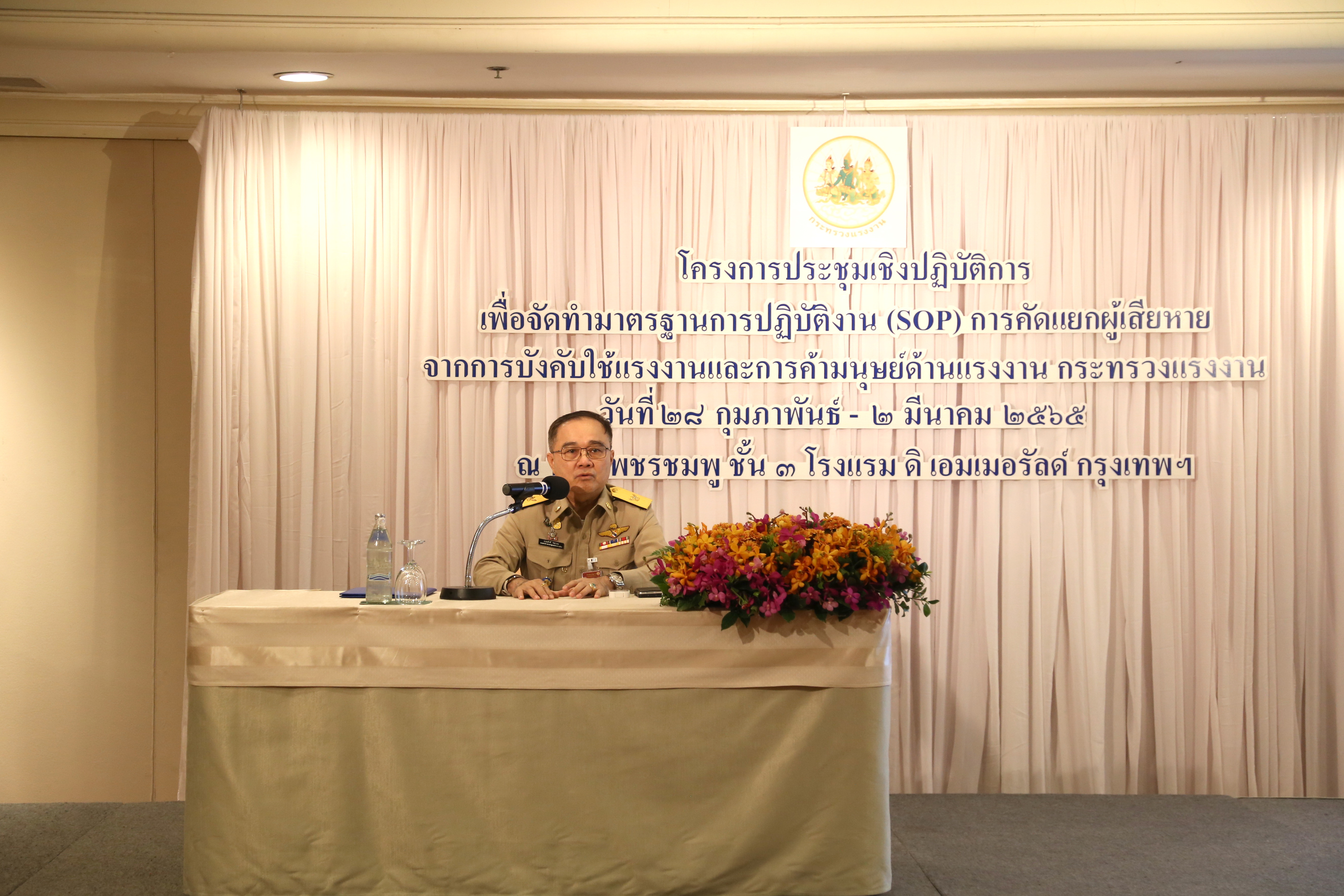 ได้มอบหมายให้สำนักเลขานุการศูนย์บัญชาการป้องกันการค้ามนุษย์ด้านแรงงาน ดำเนินการจัดโครงการประชุมเชิงปฏิบัติการในวันนี้ ซึ่งเป็นการจัดทำขั้นตอนและแนวทางปฏิบัติ ในการคัดแยกผู้เสียหายจากการค้ามนุษย์ด้านแรงงานและการบังคับใช้แรงงาน ซึ่งการมีขั้นตอนและแนวทางปฏิบัติ (SOP) จะเป็นกลไกสำคัญที่จะยกระดับมาตรฐานการปฏิบัติงานของเจ้าหน้าที่ผู้ปฏิบัติงานให้สามารถปฏิบัติงานได้อย่างมีประสิทธิภาพมากขึ้น สามารถคัดแยกผู้เสียหายจากการบังคับใช้แรงงานและการค้ามนุษย์ด้านแรงงาน และส่งต่อคดีที่อาจเกิดขึ้นไปยังหน่วยงานบังคับใช้กฎหมายต่อไปอย่างมีประสิทธิภาพ เทียบเท่ากับมาตรฐานขั้นต่ำในกฎหมายคุ้มครองผู้เสียหายจากการค้ามนุษย์ ค.ศ. 2000 (TVPA) ของประเทศสหรัฐอเมริกา เพื่อให้ประเทศไทยได้รับการจัดอันดับในรายงานการค้ามนุษย์เพื่อมุ่งสู่ระดับ Tier 2