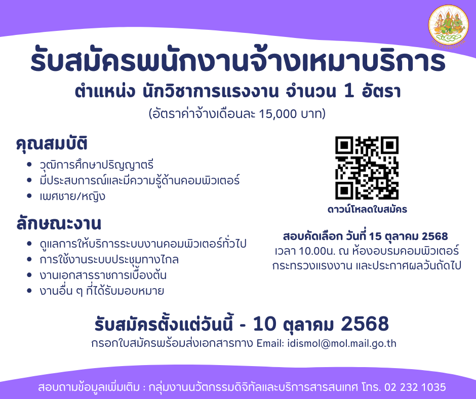 ประกาศรับสมัครพนักงานจ้างเหมาบริการ ตำแหน่ง นักวิชาการแรงงาน