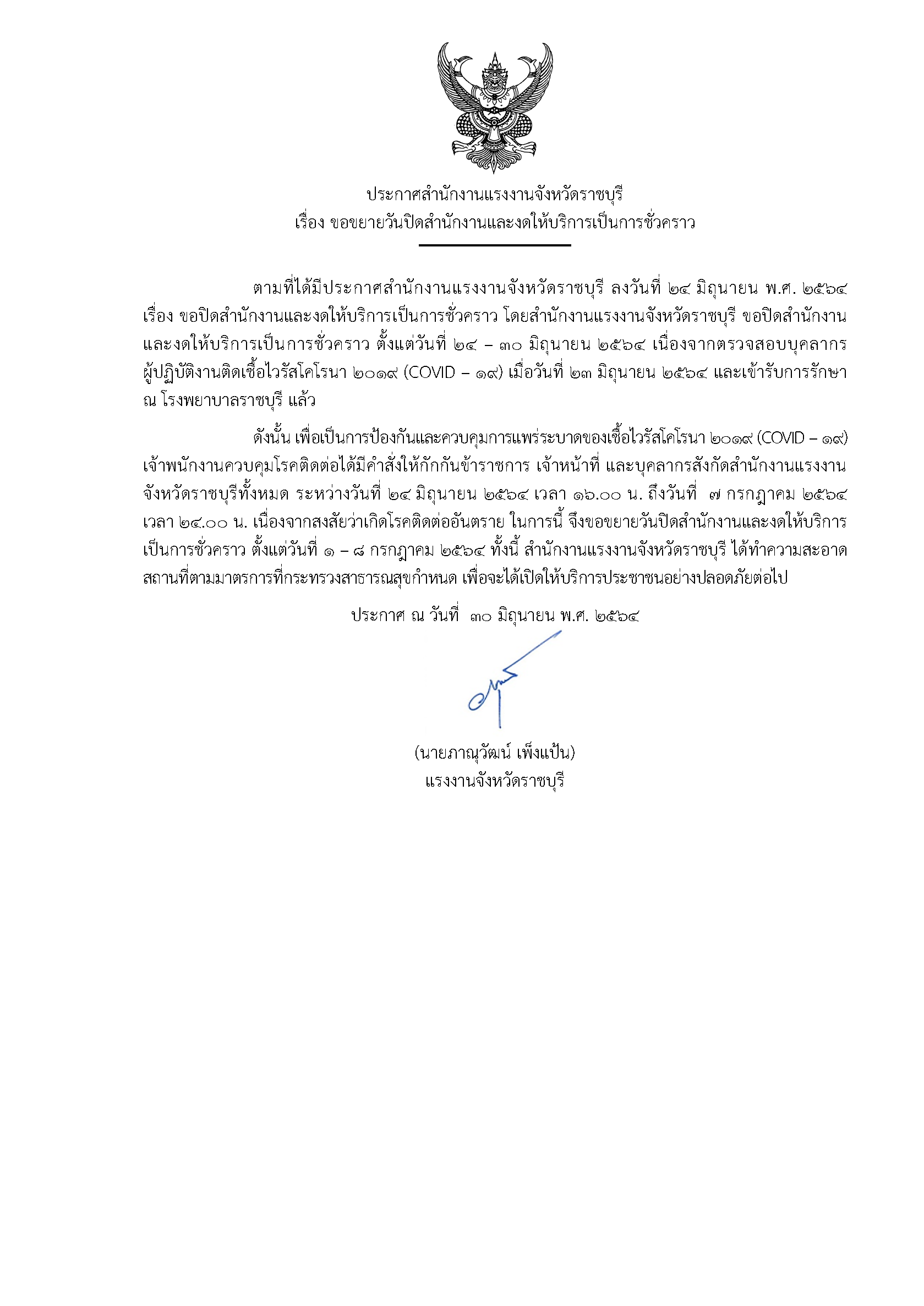 ประกาศสำนักงานแรงงานจังหวัดราชบุรี เรื่อง ขอขยายวันปิดสำนักงานและงดให้บริการเป็นการชั่วคราว ตั้งแต่วันที่ 1- 8 กรกฎาคม 2564
