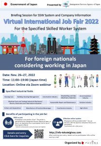 สำนักงานแรงงานในประเทศญี่ปุ่นขอประชาสัมพันธ์ การจัดงานเกี่ยวกับแรงงานทักษะเฉพาะ (Specified Skilled Worker: SSW) โดยสำนักงานตรวจคนเข้าเมืองญี่ปุ่นดังต่อไปนี้1. งาน Virtual International Job Fair 2022 ระหว่างวันที่ 26 – 27 พฤศจิกายน 2565 เวลา 11.00 – 19.00 น (ตามเวลาประเทศญี่ปุ่น) เพื่อให้ความรู้เรื่องแรงงานทักษะเฉพาะ สำหรับผู้สนใจที่อยู่ต่างประเทศ (นอกประเทศญี่ปุ่น) ซึ่งต้องทำการลงทะเบียนที่ลิ้งค์