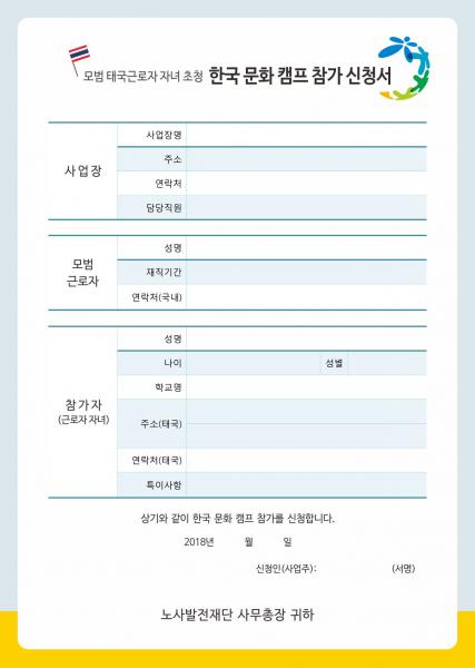 เปิดรับสมัครผู้เข้าร่วมค่ายเรียนรู้วัฒนธรรมเกาหลีใต้ มูลนิธิแรงงานแห่งสาธารณรัฐเกาหลีขอเชิญชวนบุตรของแรงงานต่างชาติที่เป็นตัวอย่างที่ดีมาเข้าร่วมค่ายเรียนรู้วัฒนธรรมเกาหลี เพื่อกระตุ้นกำลังใจให้แรงงานต่างชาติทำงานอย่างมีความสุขและชีวิตชีวา