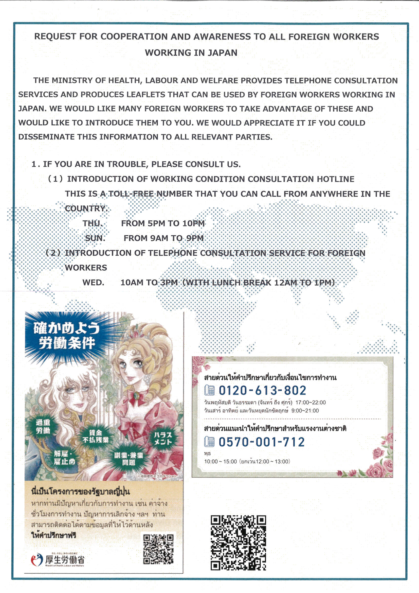 1. สายด่วนให้คำปรึกษาเกี่ยวกับเงื่อนไขการทำงาน หมายเลข 0120 – 613 – 802 (ไม่มีค่าใช้จ่าย โทร. ฟรีได้ทั่วประเทศญี่ปุ่น) โดยให้บริการวันจันทร์ – วันศุกร์ ระหว่างเวลา 17.00 – 22.00 น. วันเสาร์ อาทิตย์ และวันนักขัตฤกษ์ ระหว่างเวลา 09.00 – 21.00 น. สำหรับบริการภาษาไทยมีทุกวันพฤหัสบดี ระหว่างเวลา 17.00 – 22.00 น. และวันอาทิตย์ ระหว่างเวลา 09.00 – 21.00 น.