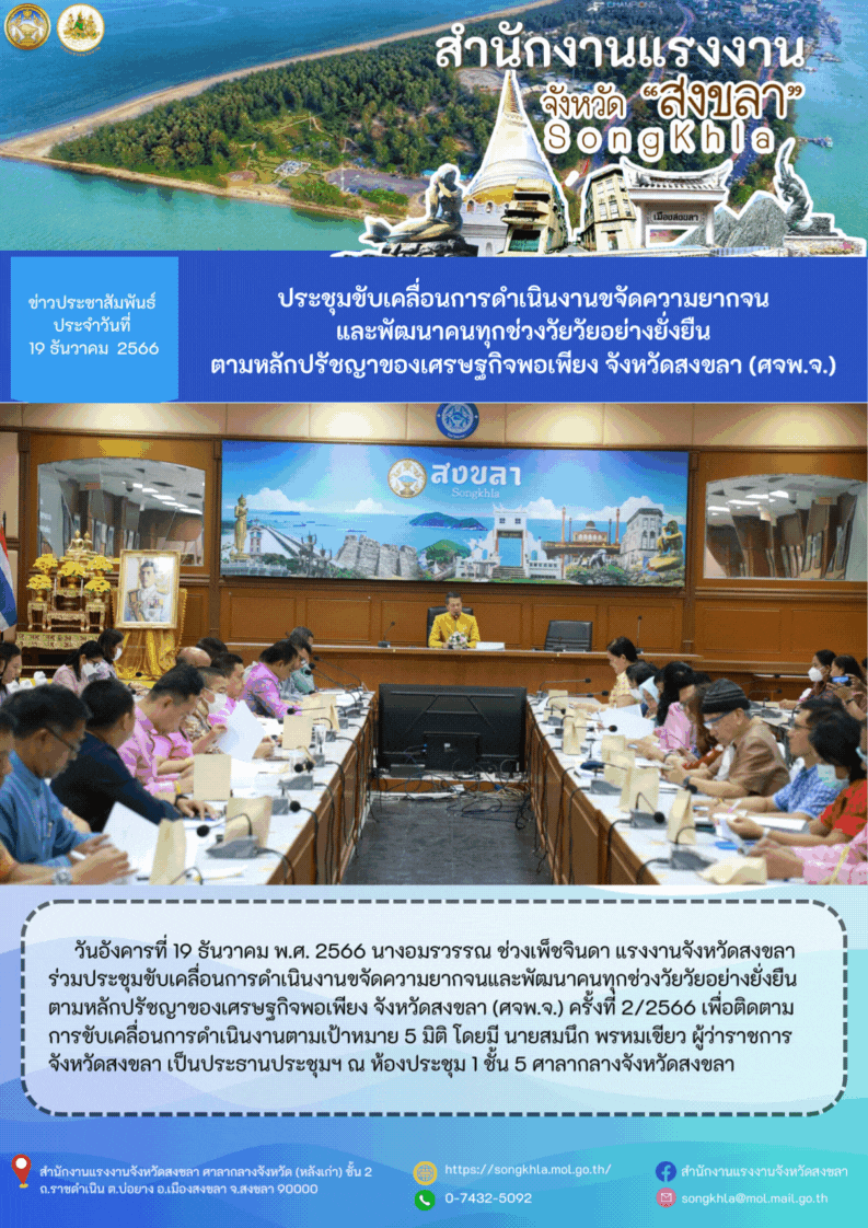วันอังคารที่ 19 ธันวาคม พ.ศ. 2566 นางอมรวรรณ ช่วงเพ็ชจินดา แรงงานจังหวัดสงขลา ร่วมประชุมขับเคลื่อนการดำเนินงานขจัดความยากจนและพัฒนาคนทุกช่วงวัยวัยอย่างยั่งยืน ตามหลักปรัชญาของเศรษฐกิจพอเพียง จังหวัดสงขลา (ศจพ.จ.) ครั้งที่ 2/2566 เพื่อติดตามการขับเคลื่อนการดำเนินงานตามเป้าหมาย 5 มิติ โดยมี นายสมนึก พรหมเขียว ผู้ว่าราชการจังหวัดสงขลา เป็นประธานประชุมฯ ณ ห้องประชุม 1 ชั้น 5 ศาลากลางจังหวัดสงขลา