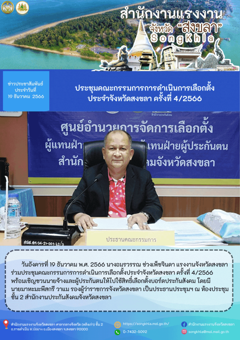วันอังคารที่ 19 ธันวาคม พ.ศ. 2566 นางอมรวรรณ ช่วงเพ็ชจินดา แรงงานจังหวัดสงขลา ร่วมประชุมคณะกรรมการการดำเนินการเลือกตั้งประจำจังหวัดสงขลา ครั้งที่ 4/2566 พร้อมเชิญชวนนายจ้างและผู้ประกันตนให้ไปใช้สิทธิ์เลือกตั้งบอร์ดประกันสังคม โดยมี นายมาหะมะพีสกรี วาแม รองผู้ว่าราชการจังหวัดสงขลา เป็นประธานประชุมฯ ณ ห้องประชุม ชั้น 2 สำนักงานประกันสังคมจังหวัดสงขลา