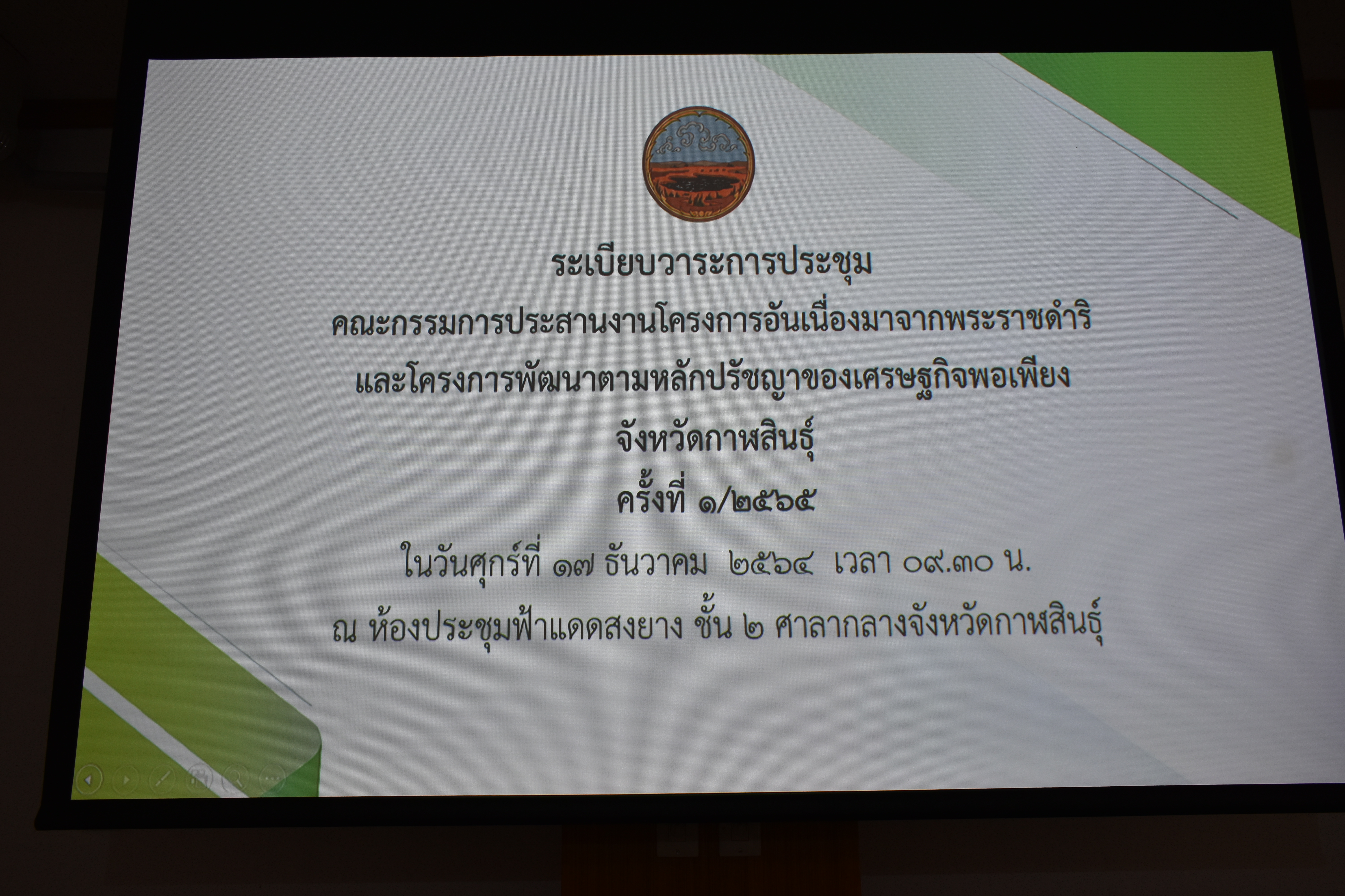 วันศุกร์ที่ 17 ธันวาคม 2564 เวลา 09.30 น. นายทรงพล ใจกริ่ม ผู้ว่าราชการจังหวัดกาฬสินธุ์ เป็นประธานการประชุม คณะกรรมการประสานงานโครงการอันเนื่องมาจากพระราชดำริและโครงการพัฒนาตามหลักปรัชญาของเศรษฐกิจพอเพียงจังหวัดกาฬสินธุ์ ครั้งที่ 1/2565