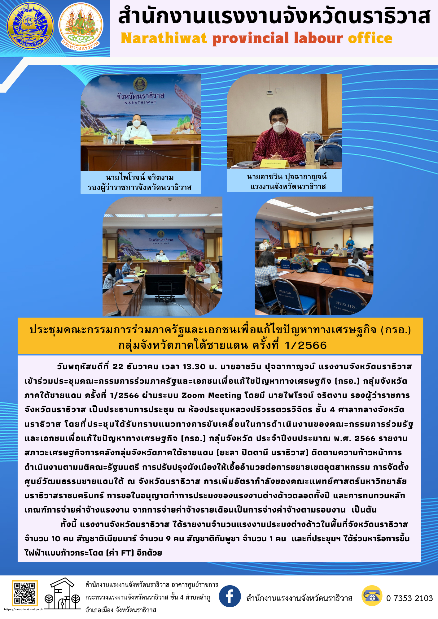วันพฤหัสบดีที่ 22 ธันวาคม เวลา 13.30 น. นายอาชวิน ปุจฉากาญจน์ แรงงานจังหวัดนราธิวาส เข้าร่วมประชุมคณะกรรมการร่วมภาครัฐและเอกชนเพื่อแก้ไขปัญหาทางเศรษฐกิจ (กรอ.) กลุ่มจังหวัดภาคใต้ชายแดน ครั้งที่ 1/2566 ผ่านระบบ Zoom Meeting โดยมี นายไพโรจน์ จริตงาม รองผู้ว่าราชการจังหวัดนราธิวาส เป็นประธานการประชุม ณ ห้องประชุมหลวงปริวรรตวรวิจิตร ชั้น 4 ศาลากลางจังหวัดนราธิวาส โดยที่ประชุมได้รับทราบแนวทางการขับเคลื่อนในการดำเนินงานของคณะกรรมการร่วมรัฐและเอกชนเพื่อแก้ไขปัญหาทางเศรษฐกิจ (กรอ.) กลุ่มจังหวัด ประจำปีงบประมาณ พ.ศ. 2566 รายงานสภาวะเศรษฐกิจการคลังกลุ่มจังหวัดภาคใต้ชายแดน (ยะลา ปัตตานี นราธิวาส) ติดตามความก้าวหน้าการดำเนินงานตามมติคณะรัฐมนตรี การปรับปรุงผังเมืองให้เอื้ออำนวยต่อการขยายเขตอุตสาหกรรม การจัดตั้งศูนย์วัฒนธรรมชายแดนใต้ ณ จังหวัดนราธิวาส การเพิ่มอัตรากำลังของคณะแพทย์ศาสตร์มหาวิทยาลัยนราธิวาสราชนครินทร์ การขอใบอนุญาตทำการประมงของแรงงานต่างด้าวตลอดทั้งปี และการทบทวนหลักเกณฑ์การจ่ายค่าจ้างแรงงาน จากการจ่ายค่าจ้างรายเดือนเป็นการจ่างค่าจ้างตามรอบงาน เป็นต้น