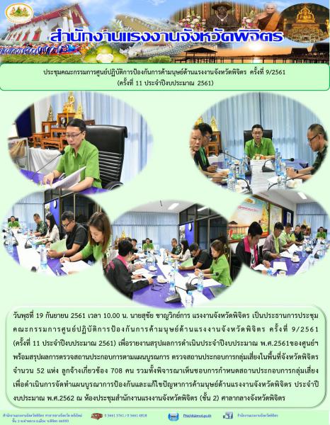 วันพุธที่ 19 กันยายน 2561 เวลา 10.00 น. นายสุชัย ชาญวิกย์การ แรงงานจังหวัดพิจิตร เป็นประธานการประชุมคณะกรรมการศูนย์ปฏิบัติการป้องกันการค้ามนุษย์ด้านแรงงานจังหวัดพิจิตร ครั้งที่ 9/2561 (ครั้งที่ 11 ประจำปีงบประมาณ 2561) เพื่อรายงานสรุปผลการดำเนินประจำปีงบประมาณ พ.ศ.2561ของศูนย์ฯ พร้อมสรุปผลการตรวจสถานประกอบการตามแผนบูรณการ ตรวจสถานประกอบการกลุ่มเสี่ยงในพื้นที่จังหวัดพิจิตร จำนวน 52 แห่ง ลูกจ้างเกี่ยวข้อง 708 คน รวมทั้งพิจารณาเห็นชอบการกำหนดสถานประกอบการกลุ่มเสี่ยงเพื่อดำเนินการจัดทำแผนบูรณาการป้องกันและแก้ไขปัญหาการค้ามนุษย์ด้านแรงงานจังหวัดพิจิตร ประจำปีงบประมาณ พ.ศ.2562 ณ ห้องประชุมสำนักงานแรงงานจังหวัดพิจิตร (ชั้น 2) ศาลากลางจังหวัดพิจิตร