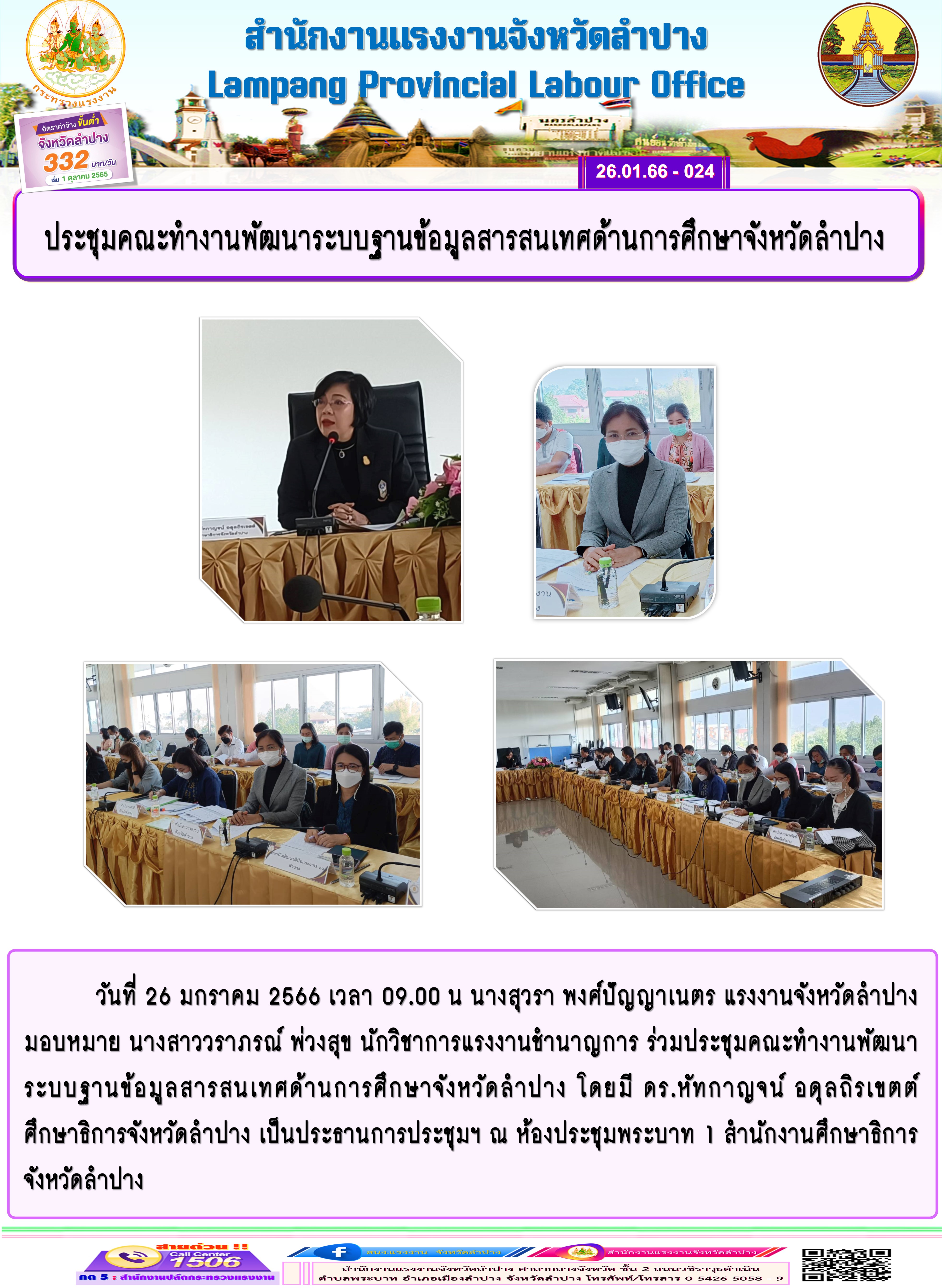 วันที่ 26 มกราคม 2566 เวลา 09.00 น นางสุวรา พงศ์ปัญญาเนตร แรงงานจังหวัดลำปาง มอบหมาย นางสาววราภรณ์ พ่วงสุข นักวิชาการแรงงานชำนาญการ ร่วมประชุมคณะทำงานพัฒนา ระบบฐานข้อมูลสารสนเทศด้านการศึกษาจังหวัดลำปาง โดยมี ดร.หัทกาญจน์ อดุลถิรเขตต์ ศึกษาธิการจังหวัดลำปาง เป็นประธานการประชุมฯ ณ ห้องประชุมพระบาท 1 สำนักงานศึกษาธิการจังหวัดลำปาง