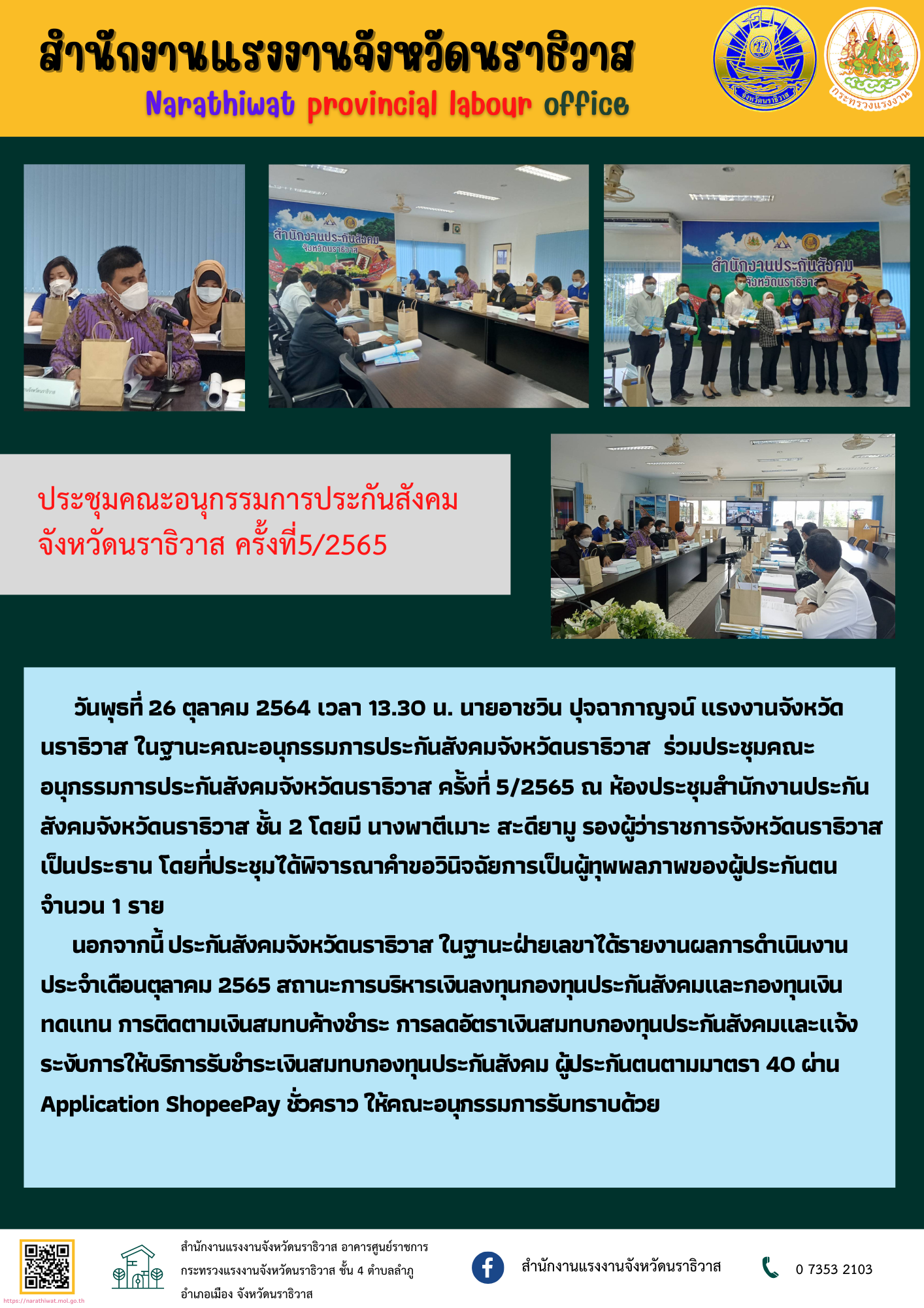 วันพุธที่ 26 ตุลาคม 2564 เวลา 13.30 น. นายอาชวิน ปุจฉากาญจน์ แรงงานจังหวัดนราธิวาส ในฐานะคณะอนุกรรมการประกันสังคมจังหวัดนราธิวาส ร่วมประชุมคณะอนุกรรมการประกันสังคมจังหวัดนราธิวาส ครั้งที่ 5/2565 ณ ห้องประชุมสำนักงานประกันสังคมจังหวัดนราธิวาส ชั้น 2 โดยมี นางพาตีเมาะ สะดียามู รองผู้ว่าราชการจังหวัดนราธิวาส เป็นประธาน โดยที่ประชุมได้พิจารณาคำขอวินิจฉัยการเป็นผู้ทุพพลภาพของผู้ประกันตน จำนวน 1 ราย