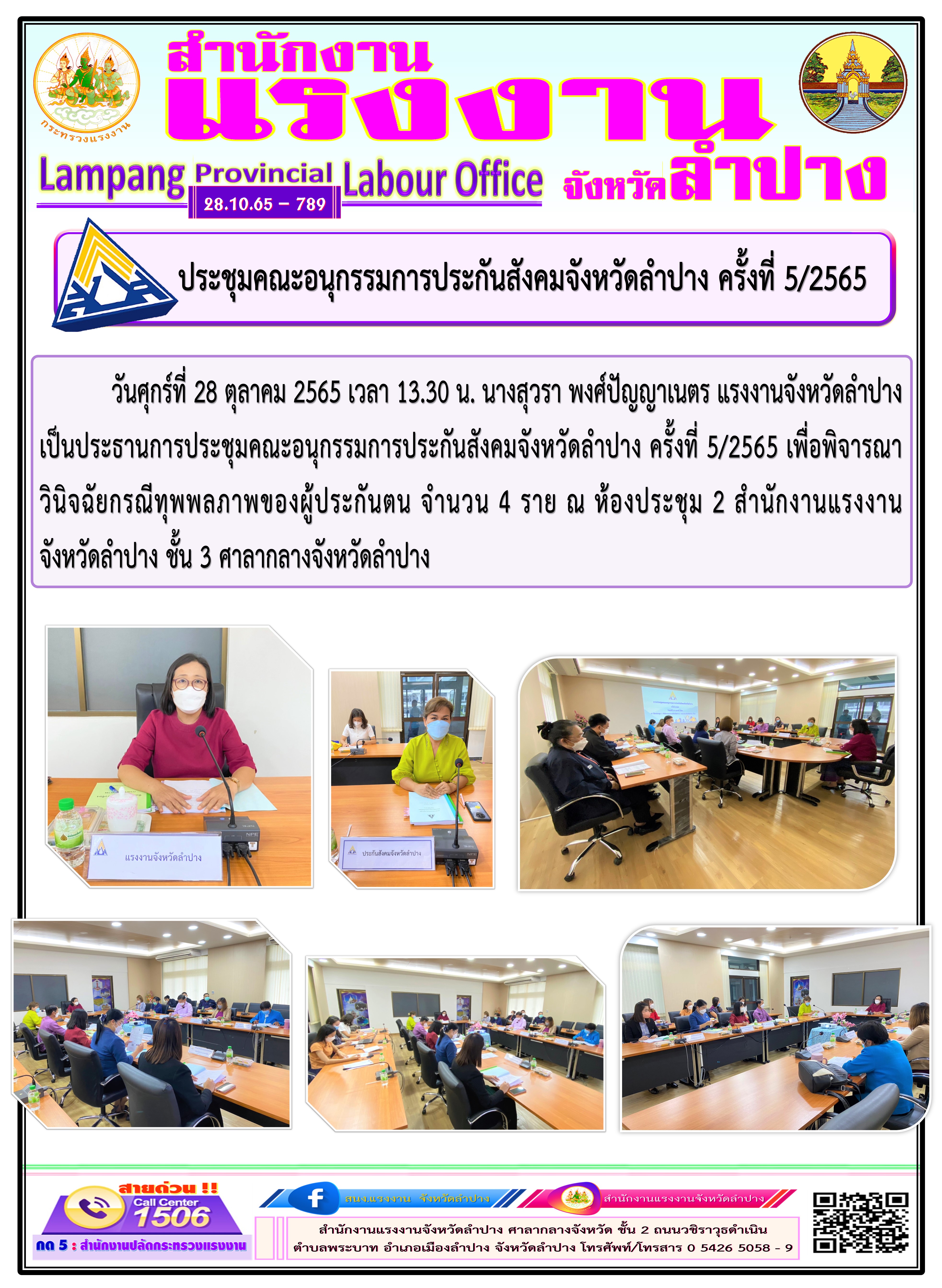 วันศุกร์ที่ 28 ตุลาคม 2565 เวลา 14.00 น. นางสุวรา พงศ์ปัญญาเนตร แรงงานจังหวัดลำปาง เป็นประธานการประชุมคณะอนุกรรมการประกันสังคมจังหวัดลำปาง ครั้งที่ 5/2565 เพื่อพิจารณาวินิจฉัยกรณีทุพพลภาพของผู้ประกันตน จำนวน 4 ราย ณ ห้องประชุม 2 สำนักงานแรงงานจังหวัดลำปาง ชั้น 3 ศาลากลางจังหวัดลำปาง