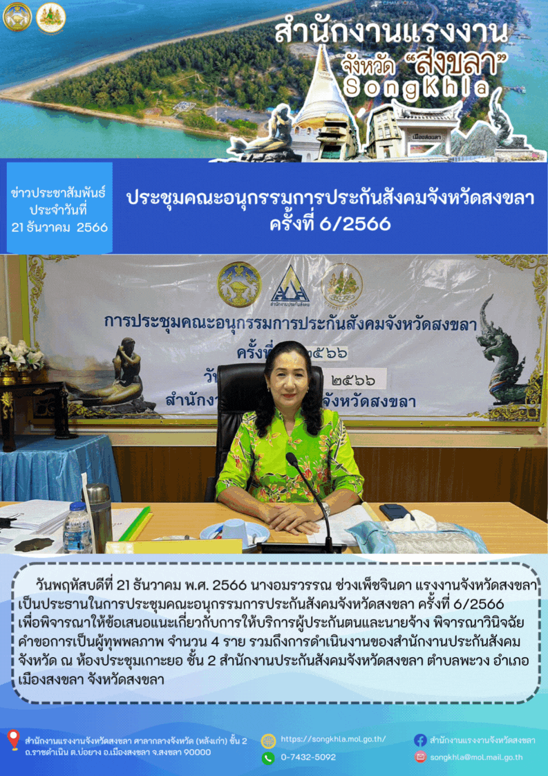 วันพฤหัสบดีที่ 21 ธันวาคม พ.ศ. 2566 นางอมรวรรณ ช่วงเพ็ชจินดา แรงงานจังหวัดสงขลา เป็นประธานในการประชุมคณะอนุกรรมการประกันสังคมจังหวัดสงขลา ครั้งที่ 6/2566 เพื่อพิจารณาให้ข้อเสนอแนะเกี่ยวกับการให้บริการผู้ประกันตนและนายจ้าง พิจารณาวินิจฉัยคำขอการเป็นผู้ทุพพลภาพ จำนวน 4 ราย รวมถึงการดำเนินงานของสำนักงานประกันสังคมจังหวัด ณ ห้องประชุมเกาะยอ ชั้น 2 สำนักงานประกันสังคมจังหวัดสงขลา ตำบลพะวง อำเภอเมืองสงขลา จังหวัดสงขลา