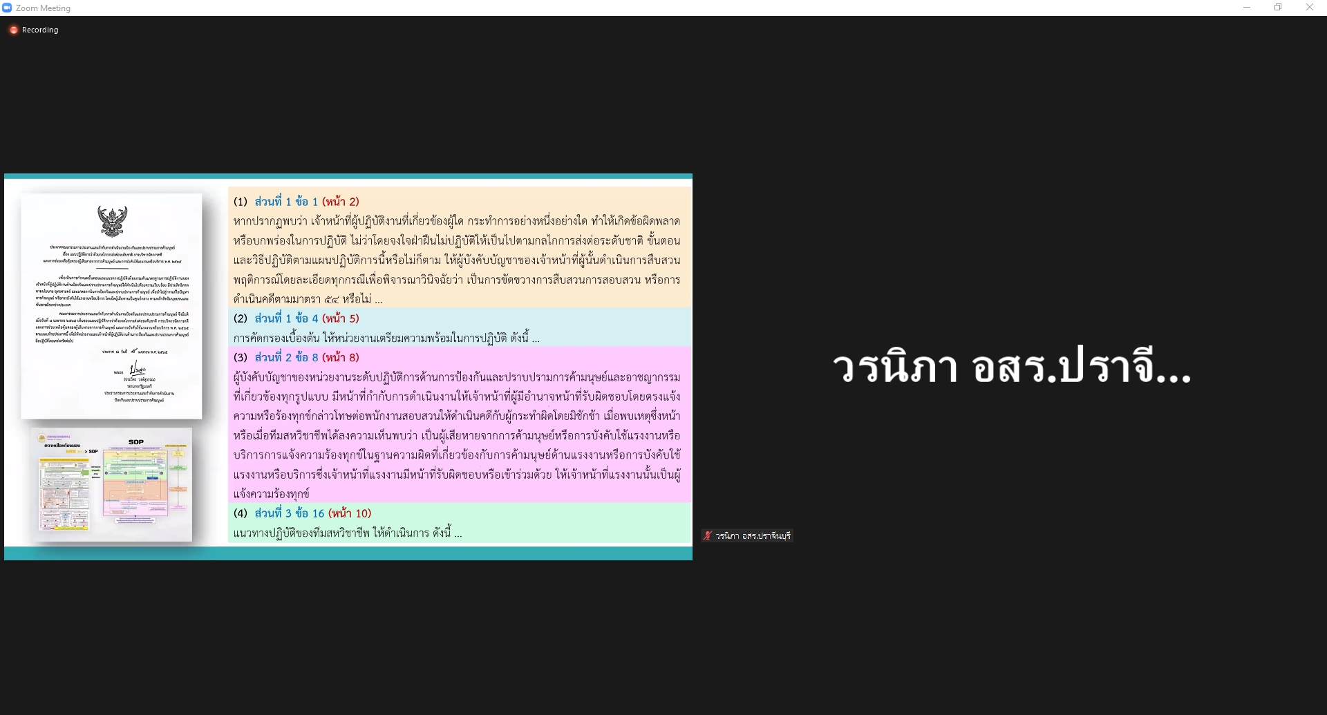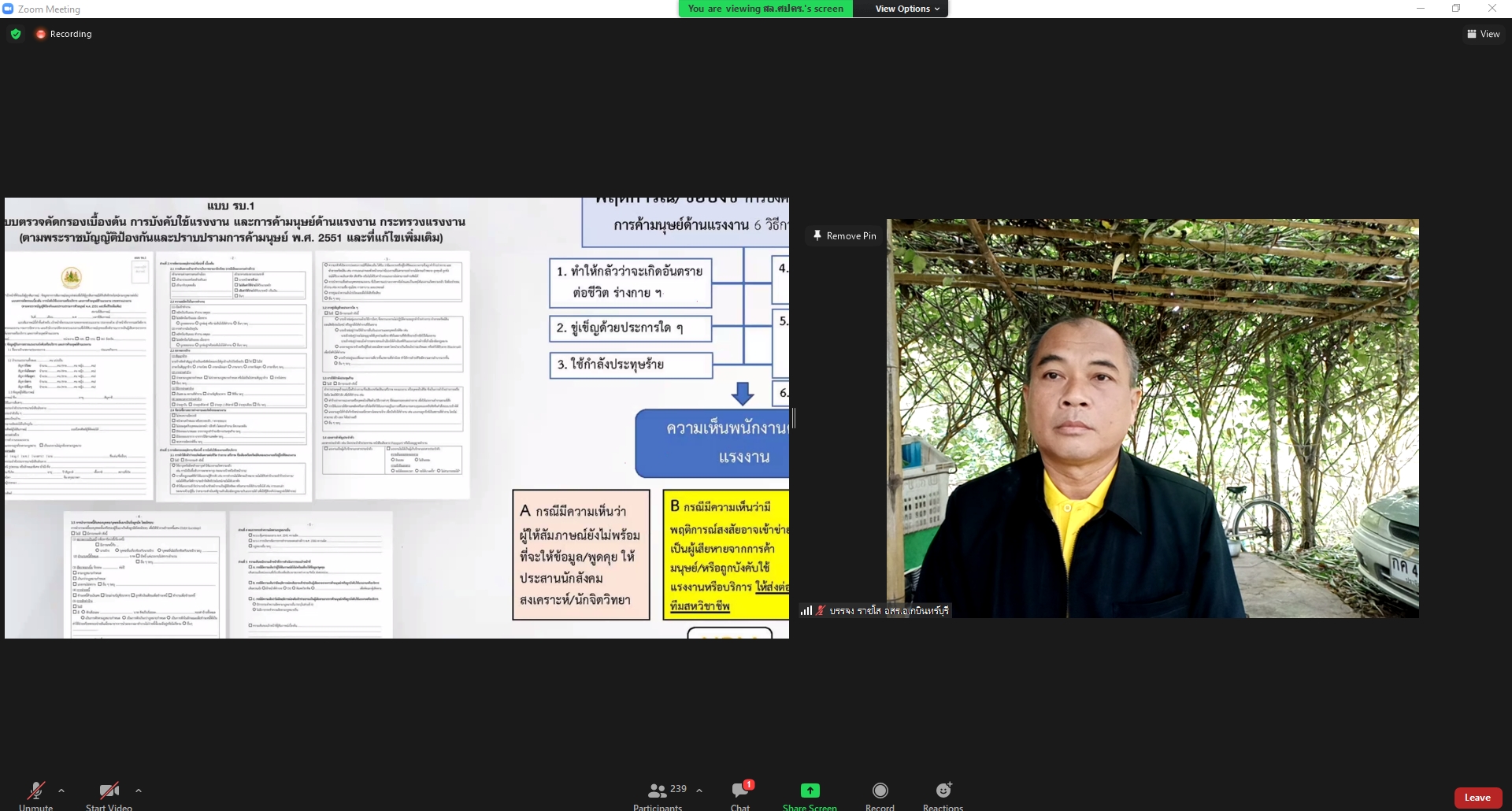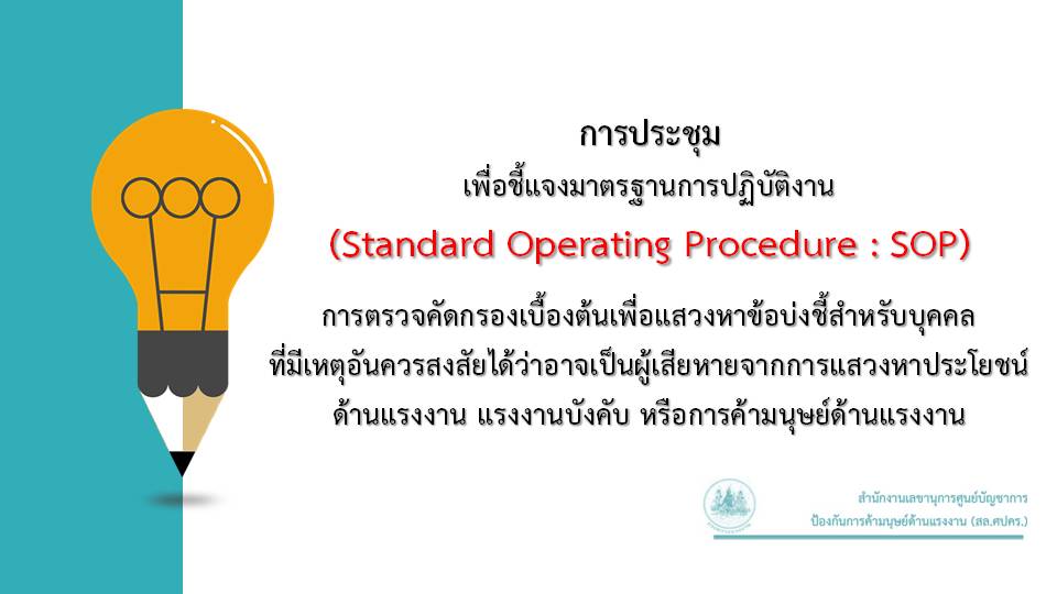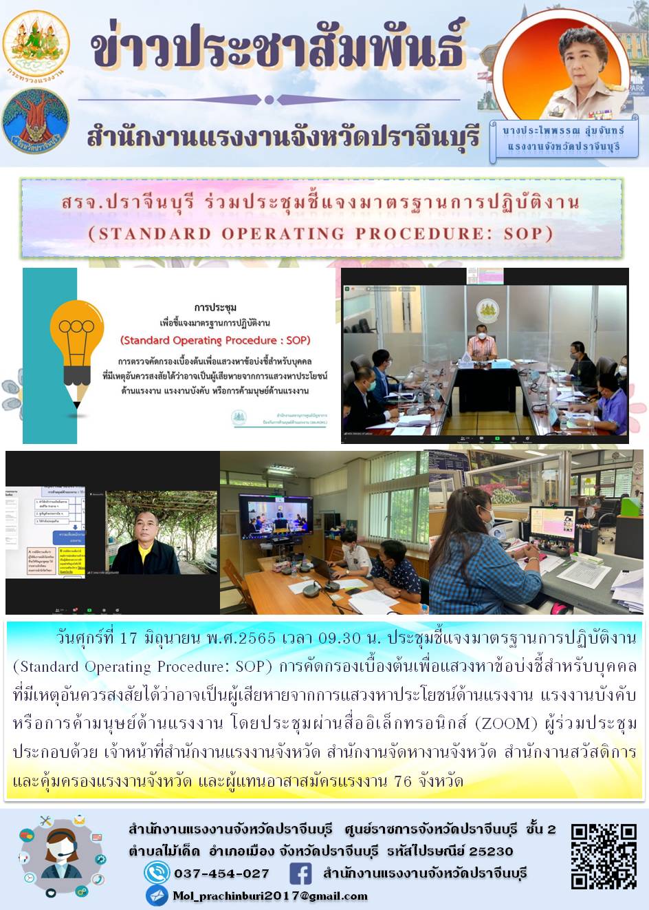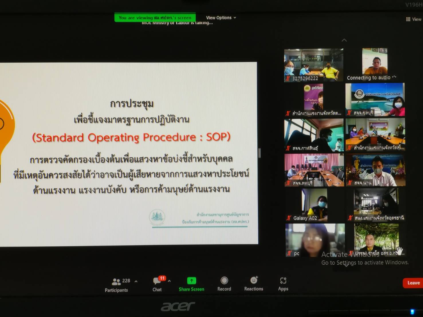 วันศุกร์ที่ 17 มิถุนายน พ.ศ.2565 เวลา 09.30 น. ประชุมชี้แจงมาตรฐานการปฏิบัติงาน (Standard Operating Procedure: SOP) การคัดกรองเบื้องต้นเพื่อแสวงหาข้อบ่งชี้สำหรับบุคคลที่มีเหตุอันควรสงสัยได้ว่าอาจเป็นผู้เสียหายจากการแสวงหาประโยชน์ด้านแรงงาน แรงงานบังคับ หรือการค้ามนุษย์ด้านแรงงาน โดยประชุมผ่านสื่ออิเล็กทรอนิกส์ (ZOOM) ผู้ร่วมประชุมประกอบด้วย เจ้าหน้าที่สำนักงานแรงงานจังหวัด สำนักงานจัดหางานจังหวัด สำนักงานสวัสดิการและคุ้มครองแรงงานจังหวัด และผู้แทนอาสาสมัครแรงงาน 76 จังหวัด