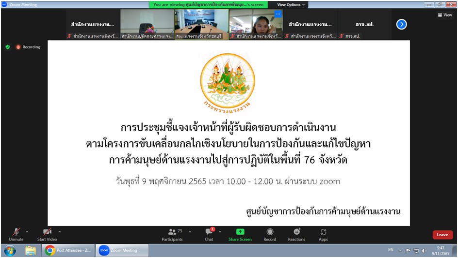 ประชุมชี้แจงเจ้าหน้าที่ผู้รับผิดชอบการดำเนินงานตามโครงการขับ เคลื่อนกลไกเชิงนโยบายในการป้องกัน และแก้ไขปัญหาการค้า มนุษย์ด้านแรงงานไปสู่การปฏิบัติในพื้นที่ ทั้ง 76 จังหวัด