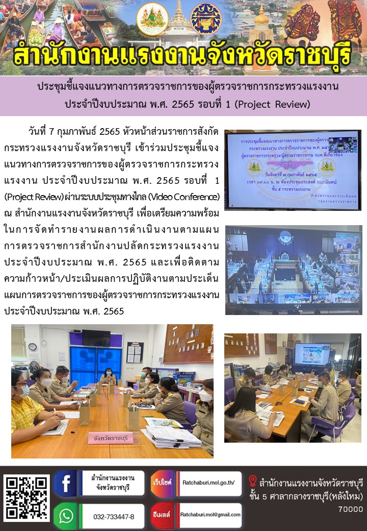 วันที่ 7 กุมภาพันธ์ 2565 หัวหน้าส่วนราชการสังกัดกระทรวงแรงงานจังหวัดราชบุรี เข้าร่วมประชุมชี้แจง แนวทางการตรวจราชการของผู้ตรวจราชการกระทรวงแรงงาน ประจำปีงบประมาณ พ.ศ. 2565 รอบที่ 1 (Project Review) ผ่านระบบประชุมทางไกล (Video Conference) ณ สำนักงานแรงงานจังหวัดราชบุรี เพื่อเตรียมความพร้อมในการจัดทำรายงานผลการดำเนินงานตามแผน การตรวจราชการสำนักงานปลัดกระทรวงแรงงาน ประจำปีงบประมาณ พ.ศ. 2565 และเพื่อติดตามความก้าวหน้า/ประเมินผลการปฏิบัติงานตามประเด็นแผนการตรวจราชการของผู้ตรวจราชการกระทรวงแรงงาน ประจำปีงบประมาณ พ.ศ. 2565
