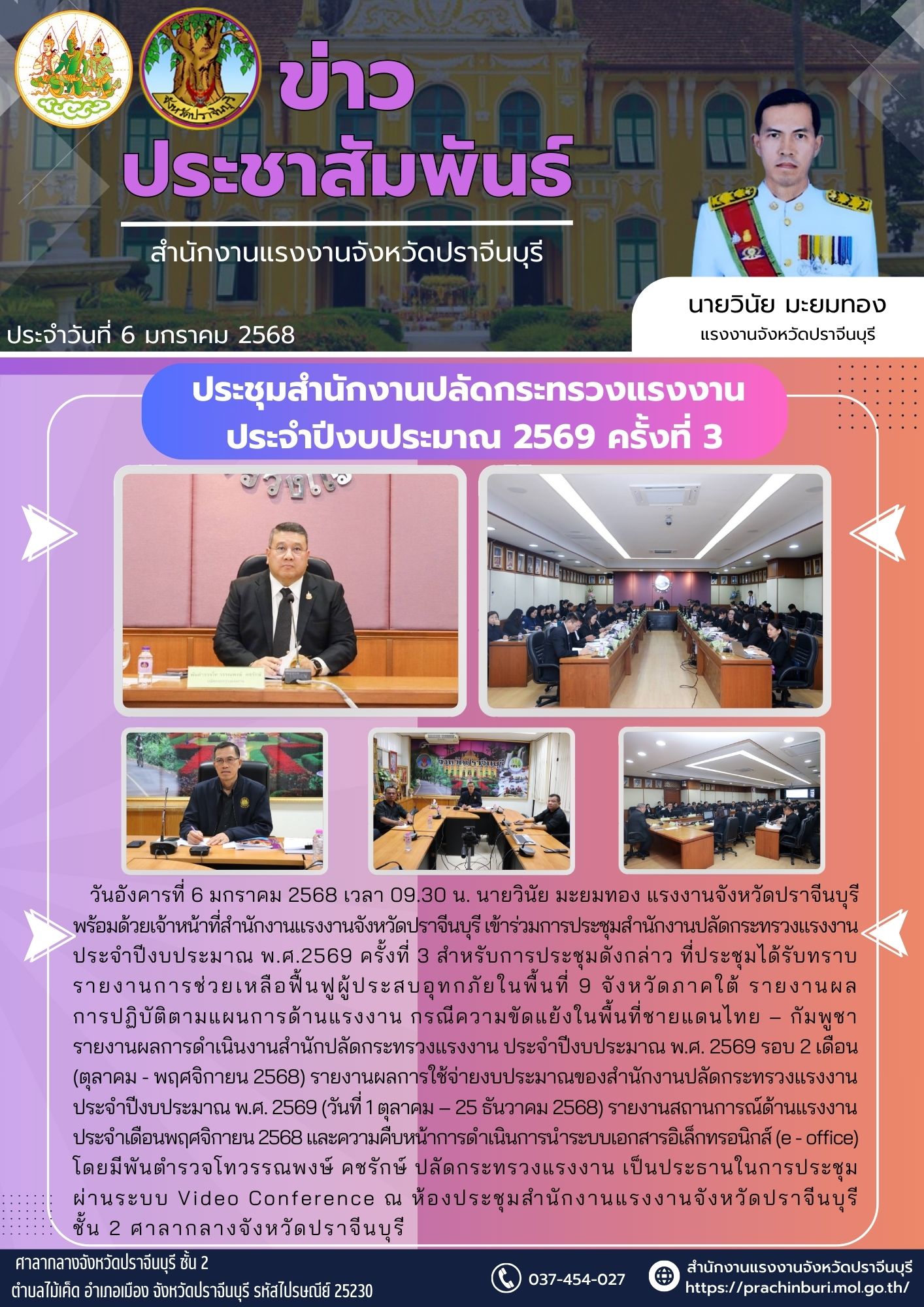 วันอังคารที่ 6 มกราคม 2568 เวลา 09.30 น. นายวินัย มะยมทอง แรงงานจังหวัดปราจีนบุรี พร้อมด้วยเจ้าหน้าที่สำนักงานแรงงานจังหวัดปราจีนบุรี เข้าร่วมการประชุมสำนักงานปลัดกระทรวงแรงงาน ประจำปีงบประมาณ พ.ศ.2569 ครั้งที่ 3 สำหรับการประชุมดังกล่าว ที่ประชุมได้รับทราบรายงานการช่วยเหลือฟื้นฟูผู้ประสบอุทกภัยในพื้นที่ 9 จังหวัดภาคใต้ รายงานผลการปฏิบัติตามแผนการด้านแรงงาน กรณีความขัดแย้งในพื้นที่ชายแดนไทย – กัมพูชา รายงานผลการดำเนินงานสำนักปลัดกระทรวงแรงงาน ประจำปีงบประมาณ พ.ศ. 2569 รอบ 2 เดือน (ตุลาคม – พฤศจิกายน 2568) รายงานผลการใช้จ่ายงบประมาณของสำนักงานปลัดกระทรวงแรงงานประจำปีงบประมาณ พ.ศ. 2569 (วันที่ 1 ตุลาคม – 25 ธันวาคม 2568) รายงานสถานการณ์ด้านแรงงาน ประจำเดือนพฤศจิกายน 2568 และความคืบหน้าการดำเนินการนำระบบเอกสารอิเล็กทรอนิกส์ (e – office) โดยมีพันตำรวจโทวรรณพงษ์ คชรักษ์ ปลัดกระทรวงแรงงาน เป็นประธานในการประชุมผ่านระบบ Video Conference ณ ห้องประชุมสำนักงานแรงงานจังหวัดปราจีนบุรี ชั้น 2 ศาลากลางจังหวัดปราจีนบุรี