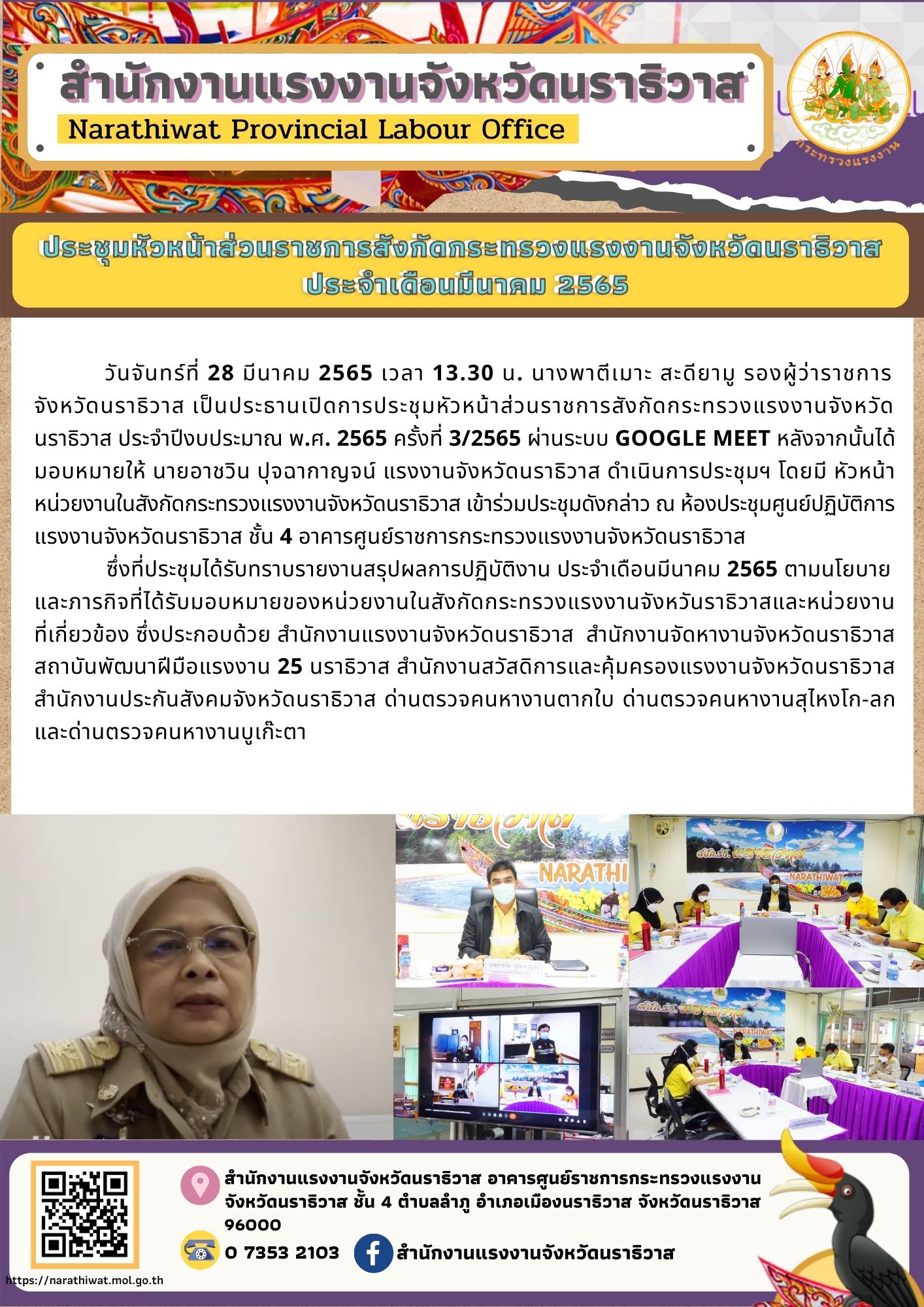 วันจันทร์ที่ 28 มีนาคม 2565 เวลา 13.30 น. นางพาตีเมาะ สะดียามู รองผู้ว่าราชการจังหวัดนราธิวาส เป็นประธานเปิดการประชุมหัวหน้าส่วนราชการสังกัดกระทรวงแรงงานจังหวัดนราธิวาส ประจำปีงบประมาณ พ.ศ. 2565 ครั้งที่ 3/2565 ผ่านระบบ GOOGLE MEET หลังจากนั้นได้มอบหมายให้ นายอาชวิน ปุจฉากาญจน์ แรงงานจังหวัดนราธิวาส ดำเนินการประชุมฯ โดยมี หัวหน้าหน่วยงานในสังกัดกระทรวงแรงงานจังหวัดนราธิวาส เข้าร่วมประชุมดังกล่าว ณ ห้องประชุมศูนย์ปฏิบัติการแรงงานจังหวัดนราธิวาส ชั้น 4 อาคารศูนย์ราชการกระทรวงแรงงานจังหวัดนราธิวาส