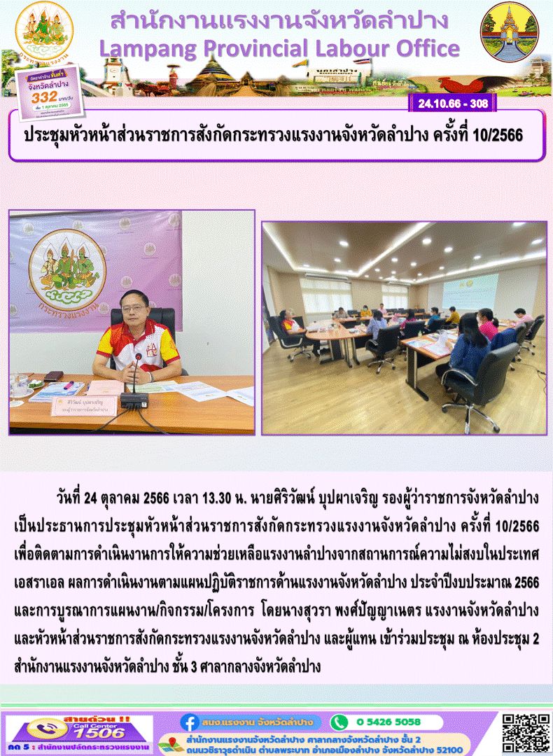 วันที่ 24 ตุลาคม 2566 เวลา 13.30 น. นายศิริวัฒน์ บุปผาเจริญ รองผู้ว่าราชการจังหวัดลำปาง เป็นประธานการประชุมหัวหน้าส่วนราชการสังกัดกระทรวงแรงงานจังหวัดลำปาง ครั้งที่ 10/2566 เพื่อติดตามการดำเนินงานการให้ความช่วยเหลือแรงงานลำปางจากสถานการณ์ความไม่สงบในประเทศเอสราเอล ผลการดำเนินงานตามแผนปฏิบัติราชการด้านแรงงานจังหวัดลำปาง ประจำปีงบประมาณ 2566 และการบูรณาการแผนงาน/กิจกรรม/โครงการ โดยนางสุวรา พงศ์ปัญญาเนตร แรงงานจังหวัดลำปาง และหัวหน้าส่วนราชการสังกัดกระทรวงแรงงานจังหวัดลำปาง และผู้แทน เข้าร่วมประชุม ณ ห้องประชุม 2 สำนักงานแรงงานจังหวัดลำปาง ชั้น 3 ศาลากลางจังหวัดลำปาง