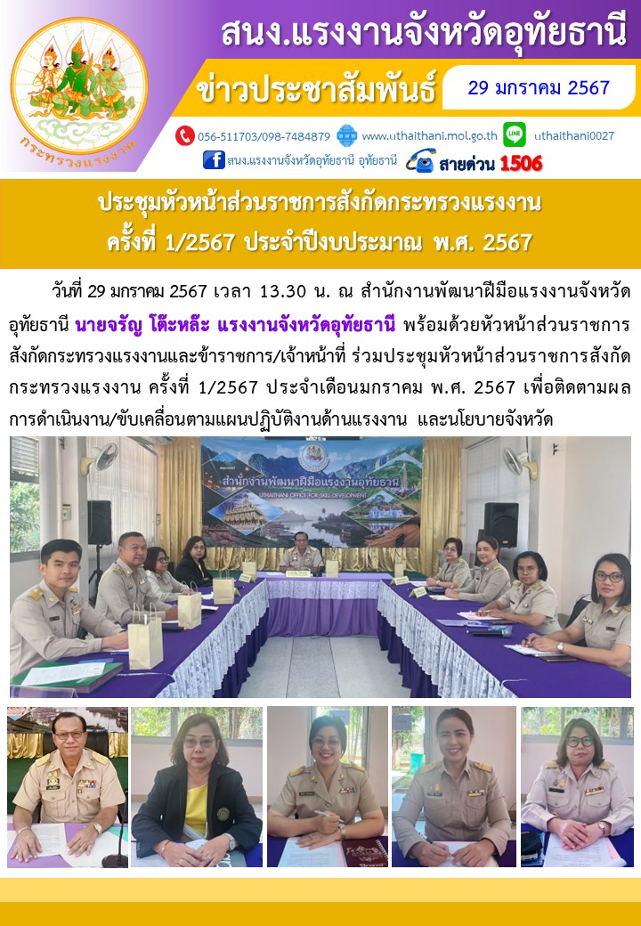 สรจ.อุดรธานี ประชุมหัวหน้าส่วนราชการสังกัดกระทรวงแรงงาน ครั้งที่ 1/2567 ประจำปีงบประมาณ พ.ศ. 2567
