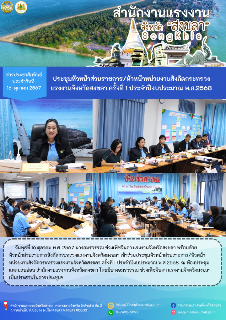 สรจ.สงขลา ประชุมหัวหน้าส่วนราชการ/หัวหน้าหน่วยงานในสังกัดกระทรวงแรงงานจังหวัดสงขลา ครั้งที่1 ประจำปีงบประมาณ พ.ศ.2568
