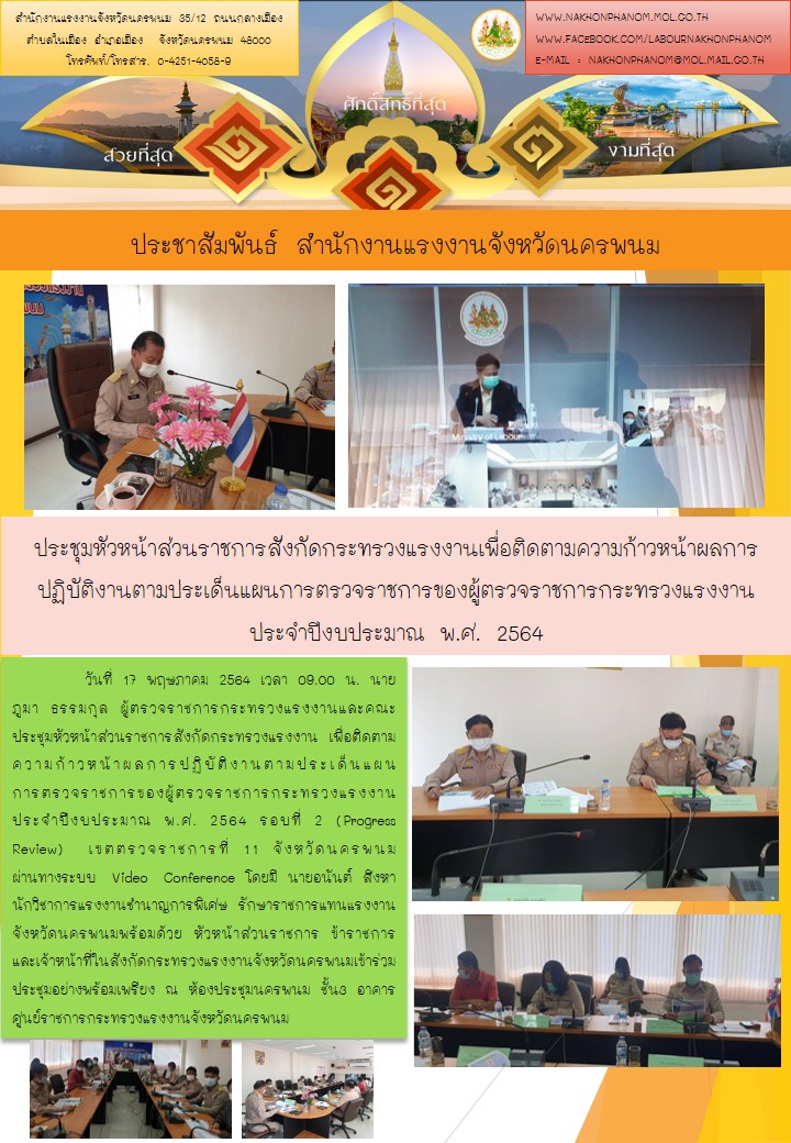 นายภูมา ธรรมกุล ผู้ตรวจราชการกระทรวงแรงงานและคณะ ประชุมหัวหน้าส่วนราชการสังกัดกระทรวงแรงงาน เพื่อติดตามความก้าวหน้าผลการปฏิบัติงานตามประเด็นแผน การตรวจราชการของผู้ตรวจราชการกระทรวงแรงงาน ประจำปีงบประมาณ พ.ศ. 2564 รอบที่ 2 (Progress Review) เขตตรวจราชการที่ 11 จังหวัดนครพนม ผ่านทางระบบ Video Conference โดยมี นายอนันต์ สิงหา นักวิชาการแรงงานชำนาญการพิเศษ รักษาราชการแทนแรงงานจังหวัดนครพนมพร้อมด้วย หัวหน้าส่วนราชการ ข้าราชการ และเจ้าหน้าที่ในสังกัดกระทรวงแรงงานจังหวัดนครพนมเข้าร่วมประชุมอย่างพร้อมเพรียง ณ ห้องประชุมนครพนม ชั้น3 อาคารศูนย์ราชการกระทรวงแรงงานจังหวัดนครพนม