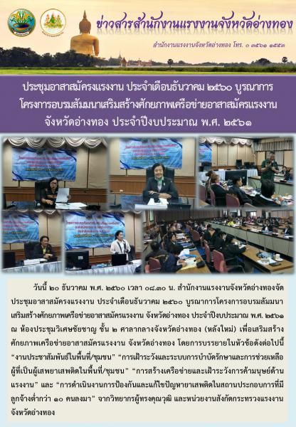 ประชุมอาสาสมัครงแรงงาน ประจำเดือนธันวาคม 2560 บูรณาการโครงการอบรมสัมมนาเสริมสร้างศักยภาพเครือข่ายอาสาสมัครแรงงาน จังหวัดอ่างทอง ประจำปีงบประมาณ พ.ศ. 2561