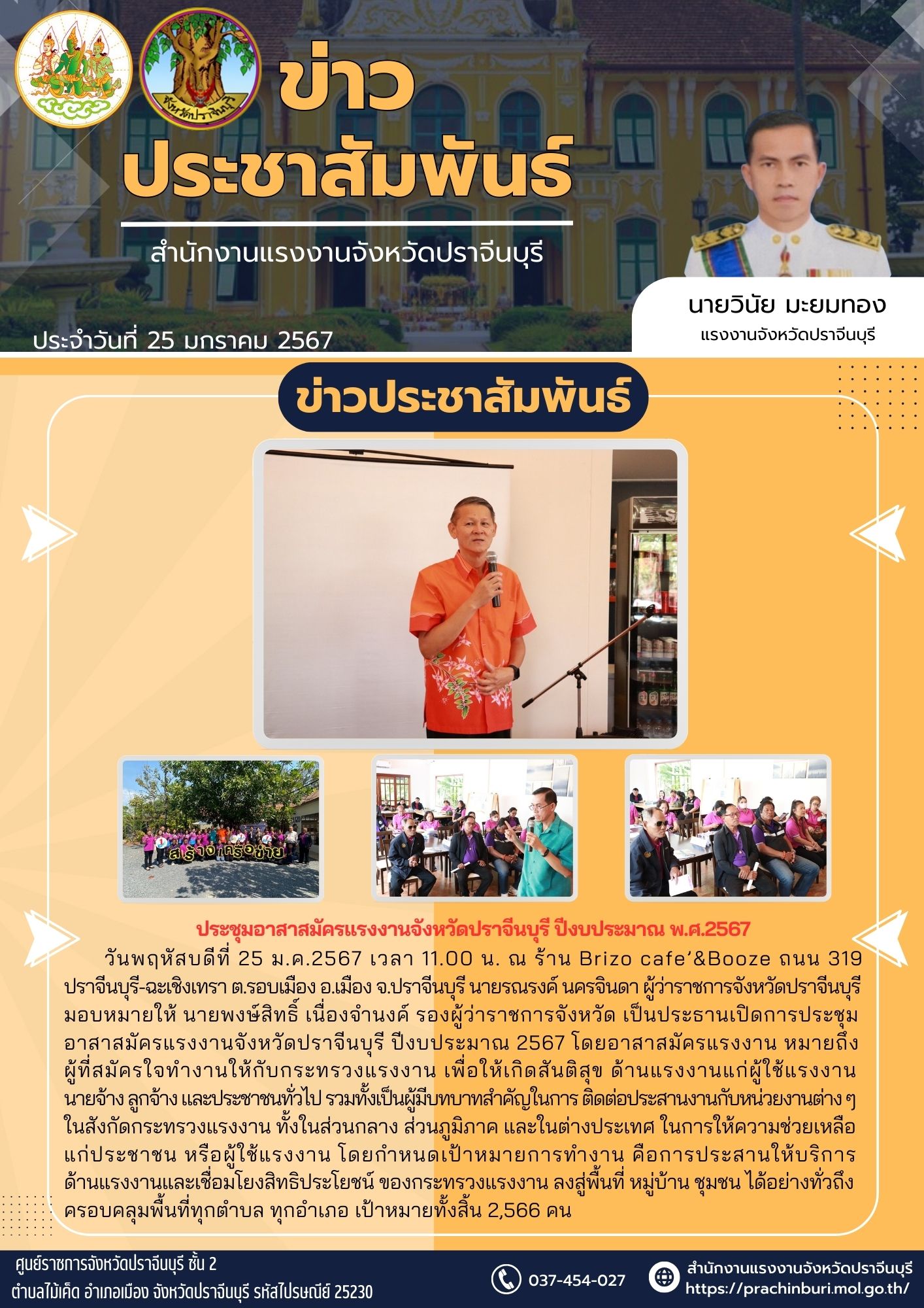 วันพฤหัสบดีที่ 25 ม.ค.2567 เวลา 11.00 น. ณ ร้าน Brizo cafe’&Booze ถนน 319 ปราจีนบุรี-ฉะเชิงเทรา ต.รอบเมือง อ.เมือง จ.ปราจีนบุรี นายรณรงค์ นครจินดา ผู้ว่าราชการจังหวัดปราจีนบุรี มอบหมายให้ นายพงษ์สิทธิ์ เนื่องจำนงค์ รองผู้ว่าราชการจังหวัด เป็นประธานเปิดการประชุมอาสาสมัครแรงงานจังหวัดปราจีนบุรี ปีงบประมาณ 2567 โดยอาสาสมัครแรงงาน หมายถึง ผู้ที่สมัครใจทํางานให้กับกระทรวงแรงงาน เพื่อให้เกิดสันติสุข ด้านแรงงานแก่ผู้ใช้แรงงาน นายจ้าง ลูกจ้าง และประชาชนทั่วไป รวมทั้งเป็นผู้มีบทบาทสําคัญในการ ติดต่อประสานงานกับหน่วยงานต่างๆ ในสังกัดกระทรวงแรงงาน ทั้งในส่วนกลาง ส่วนภูมิภาค และในต่างประเทศ ในการให้ความช่วยเหลือแก่ประชาชน หรือผู้ใช้แรงงาน โดยกำหนดเป้าหมายการทำงาน คือการประสานให้บริการด้านแรงงานและเชื่อมโยงสิทธิประโยชน์ ของกระทรวงแรงงาน ลงสู่พื้นที่ หมู่บ้าน ชุมชน ได้อย่างทั่วถึงครอบคลุมพื้นที่ทุกตำบล ทุกอำเภอ เป้าหมายทั้งสิ้น 2,566 คน