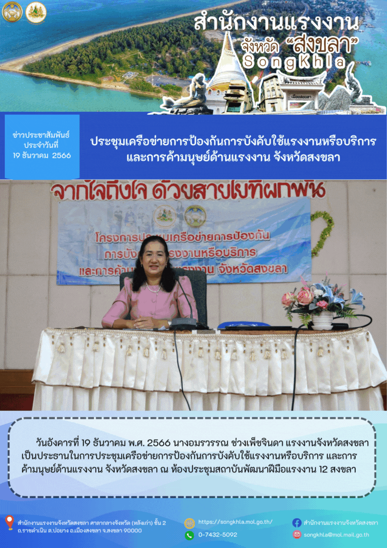 วันอังคารที่ 19 ธันวาคม พ.ศ. 2566 นางอมรวรรณ ช่วงเพ็ชจินดา แรงงานจังหวัดสงขลา เป็นประธานในการประชุมเครือข่ายการป้องกันการบังคับใช้แรงงานหรือบริการ และการค้ามนุษย์ด้านแรงงาน จังหวัดสงขลา ณ ห้องประชุมสถาบันพัฒนาฝีมือแรงงาน 12 สงขลา