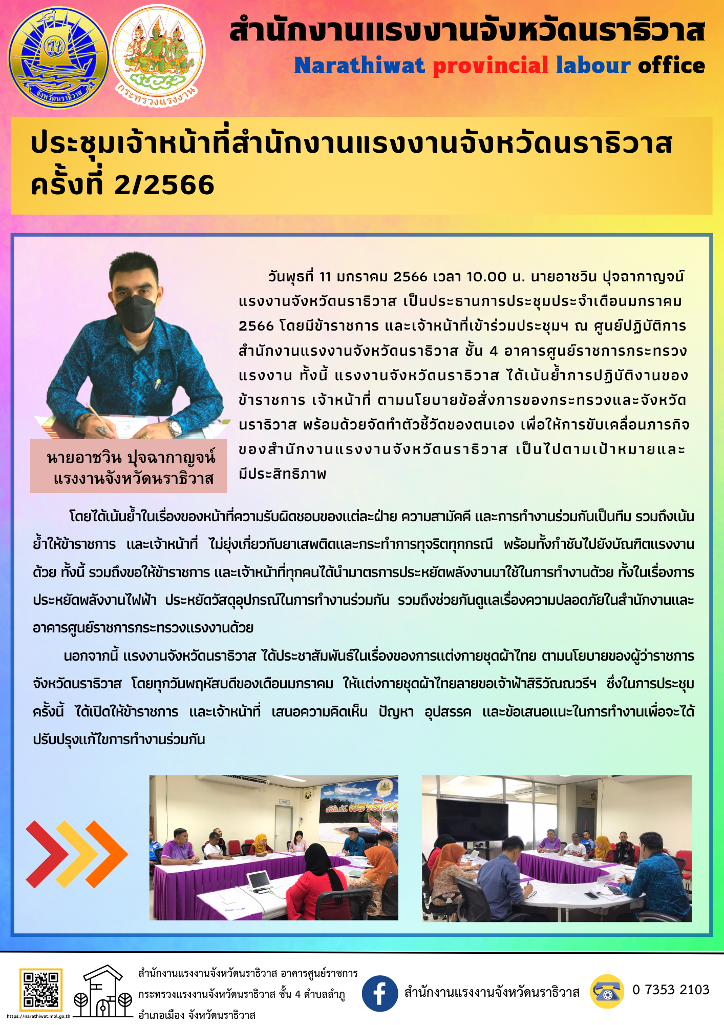 นอกจากนี้ แรงงานจังหวัดนราธิวาส ได้ประชาสัมพันธ์ในเรื่องของการแต่งกายชุดผ้าไทย ตามนโยบายของผู้ว่าราชการจังหวัดนราธิวาส โดยทุกวันพฤหัสบดีของเดือนมกราคม ให้แต่งกายชุดผ้าไทยลายขอเจ้าฟ้าสิริวัณณวรีฯ ซึ่งในการประชุมครั้งนี้ ได้เปิดให้ข้าราชการ และเจ้าหน้าที่ เสนอความคิดเห็น ปัญหา อุปสรรค และข้อเสนอแนะในการทำงานเพื่อจะได้ปรับปรุงแก้ไขการทำงานร่วมกัน