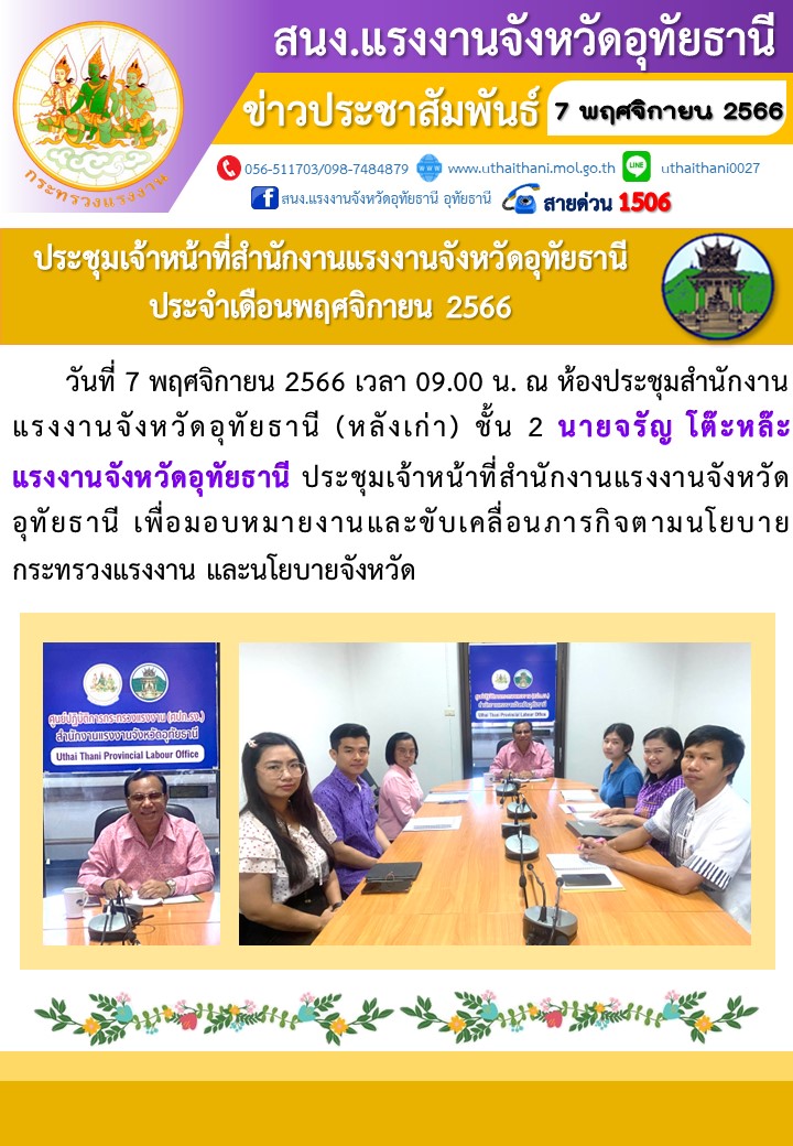 สรจ.อุทัยธานี ประชุมเจ้าหน้าที่สำนักงานแรงงานจังหวัดอุทัยธานี ประจำเดือนพฤศจิกายน 2566