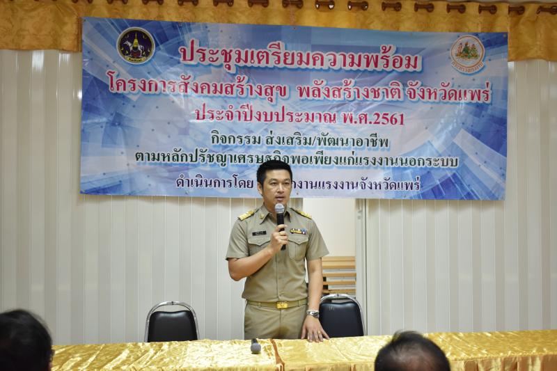 เมื่อวันที่ 4 ธันวาคม 2560 เวลา 09.00 น. สำนักงานแรงงานจังหวัดแพร่ ประชุมเตรียมความพร้อมโครงการสังคมสร้างสุข พลังสร้างชาติ จังหวัดแพร่ ประจำปีงบประมาณ พ.ศ.2561 กิจกรรม ส่งเสริม/พัฒนาอาชีพตามหลักปรัชญาเศรษฐกิจพอเพียงแก่แรงงานนอกระบบ โดยเป็นการประชุมชี้แจงการดำเนินกิจกรรมฝึกอาชีพช่างไฟฟ้าชุมชน (เบื้องต้น) แก่ประชาชนในพื้นที่ตำบลต้าผามอก ที่สนใจเข้ารับการฝึกฯ ณ องค์การบริหารส่วนตำบลต้าผามอก อำเภอลอง จังหวัดแพร่