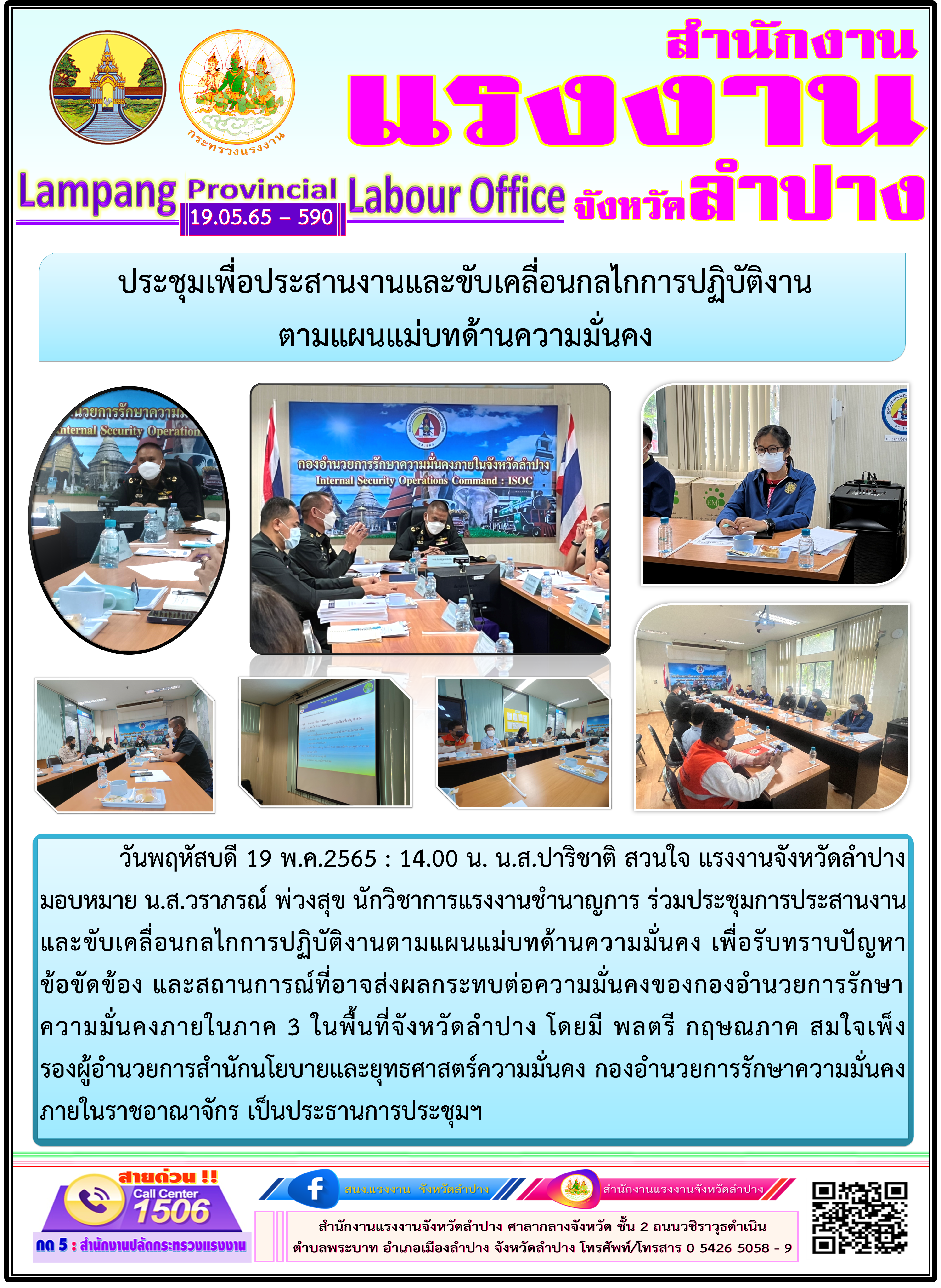 วันพฤหัสบดี 19 พ.ค.2565 : 14.00 น. น.ส.ปาริชาติ สวนใจ แรงงานจังหวัดลำปาง มอบหมาย น.ส.วราภรณ์ พ่วงสุข นักวิชาการแรงงานชำนาญการ ร่วมประชุมการประสานงานและขับเคลื่อนกลไกการปฏิบัติงานตามแผนแม่บทด้านความมั่นคง เพื่อรับทราบปัญหาข้อขัดข้อง และสถานการณ์ที่อาจส่งผลกระทบต่อความมั่นคงของ กองอำนวยการรักษาความมั่นคงภายในภาค 3 ในพื้นที่จังหวัดลำปาง โดยมี พลตรี กฤษณภาค สมใจเพ็งรองผู้อำนวยการสำนักนโยบายและยุทธศาสตร์ความมั่นคง กองอำนวยการรักษาความมั่นคงภายในราชอาณาจักร เป็นประธานการประชุมฯ