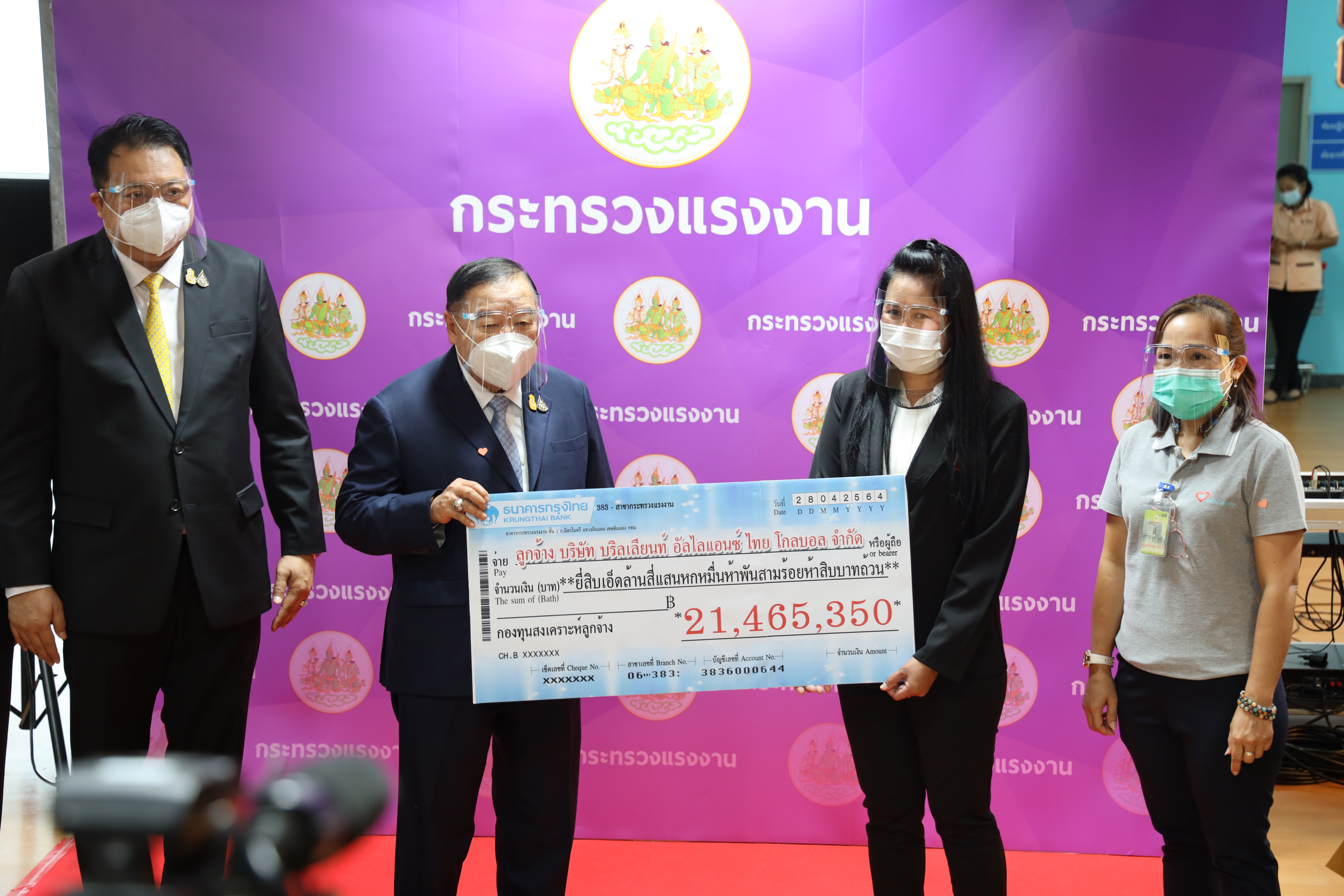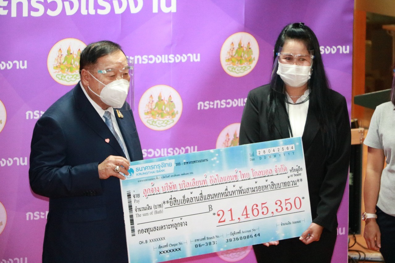 นายสุชาติ ชมกลิ่น รัฐมนตรีว่าการกระทรวงแรงงาน กล่าวว่า กระทรวงแรงงานได้อนุมัติเงินกองทุนสงเคราะห์ลูกจ้างจำนวน 21,465,350 บาท ให้กับสำนักงานสวัสดิการและคุ้มครองแรงงานจังหวัดสมุทรปราการ นำไปจ่ายให้กับลูกจ้าง บริษัท บริลเลียนท์อัลไลแอนซ์ ไทย โกลบอล จำกัด อำเภอบางเสาธง จังหวัดสมุทรปราการ ประกอบกิจการผลิตชุดชั้นในสตรี จำนวน 1,161 คน ที่ได้ยื่นคำขอรับเงินสงเคราะห์จากกองทุนสงเคราะห์ลูกจ้าง เมื่อวันที่ 27 เมษายน 2564 เพื่อเป็นการบรรเทาความเดือดร้อนกรณีที่นายจ้างเลิกจ้างและยังไม่จ่ายค่าชดเชย โดยมีตัวแทนลูกจ้างเข้าร่วมพิธีรับมอบเงิน ซึ่งบริษัทฯ ได้ปิดกิจการตั้งแต่วันที่ 11 มีนาคม ที่ผ่านมา เนื่องจากได้รับผลกระทบจากโควิด-19 และสภาพเศรษฐกิจ ซึ่งพนักงานตรวจแรงงาน สำนักงานสวัสดิการและคุ้มครองแรงงานจังหวัดสมุทรปราการ ได้มีคำสั่งเมื่อวันที่ 23 มีนาคม 2564 สั่งให้ บริษัทฯ จ่ายค่าจ้างสำหรับวันหยุดพักผ่อนประจำปี 2564 ที่นายจ้างสั่งให้หยุดเป็นเงิน 774,897.24 บาท จ่ายค่าจ้างแทนการบอกกล่าวล่วงหน้าเป็นเงิน 27,004,038.02 บาท ค่าชดเชยเป็นเงิน 212,900,746.87 บาท และค่าจ้างสำหรับวันหยุดพักผ่อนประจำปีสะสมเป็นเงิน 2,010,180.57 บาท ให้กับลูกจ้างจำนวน 1,237 คน รวมเป็นเงินทั้งสิ้น 242,689,862.71 บาท (สองร้อยสี่สิบสองล้านหกแสนแปดหมื่นเก้าพันแปดร้อยหกสิบสองบาทเจ็ดสิบเอ็ดสตางค์) พร้อมดอกเบี้ย ในระหว่างเวลาผิดนัดร้อยละสิบห้าต่อปีจนกว่าจะชำระเสร็จสิ้น ซึ่งทั้งนายจ้างและลูกจ้างได้รับทราบคำสั่งดังกล่าวเมื่อวันที่ 26 มีนาคม 2564 เมื่อครบกำหนดตามคำสั่งที่นายจ้างต้องปฏิบัติ นายจ้างไม่ปฏิบัติ ลูกจ้างจึงได้ยื่นคำขอรับเงินสงเคราะห์จากกองทุนสงเคราะห์ลูกจ้าง