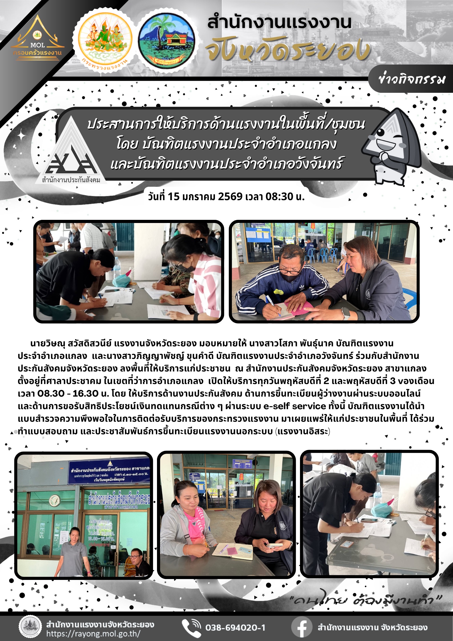 นายวิษณุ สวัสดิสวนีย์ แรงงานจังหวัดระยอง มอบหมายให้ นางสาวโสภา พันธุ์นาค บัณฑิตแรงงานประจำอำเภอแกลง และ นางสาวภิญญาพัชญ์ ขุนคำดี บัณฑิตแรงงานประจำอำเภอวังจันทร์ ร่วมกับสำนักงานประกันสังคมจังหวัดระยอง ลงพื้นที่ให้บริการแก่ประชาชน ณ สำนักงานประกันสังคมจังหวัดระยอง สาขาแกลง ตั้งอยู่ที่ศาลาประชาคมในเขตที่ว่าการอำเภอแกลง