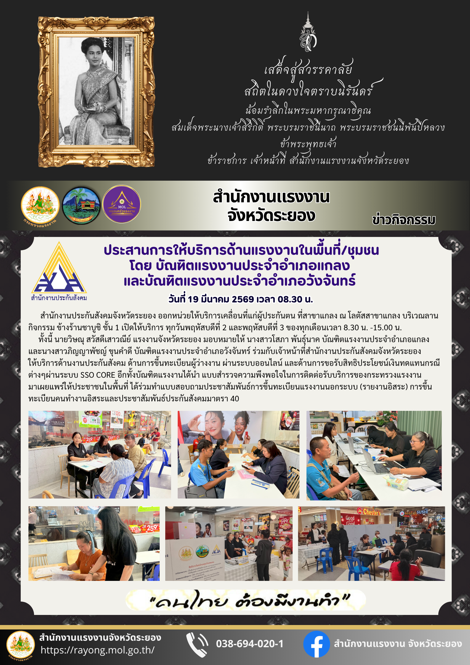 ทั้งนี้ นายวิษณุ สวัสดีเสาวณีย์ แรงงานจังหวัดระยอง มอบหมายให้ นางสาวโสภา พันธ์ุนาค บัณฑิตแรงงานประจำอำเภอแกลง และนางสาวภิญญาพัชญ์ ขุนคำดี บัณฑิตแรงงานประจำอำเภอวังจันทร์ ร่วมกับเจ้าหน้าที่สำนักงานประกันสังคมจังหวัดระยอง ให้บริการด้านงานประกันสังคม ด้านการขึ้นทะเบียนผู้ว่างงาน ผ่านระบบออนไลน์ และด้านการขอรับสิทธิประโยชน์เงินทดแทนกรณีต่างๆผ่านระบบ SSO CORE อีกทั้งบัณฑิตแรงงานได้นำ แบบสำรวจความพึงพอใจในการติดต่อรับบริการของกระทรวงแรงงาน มาเผยแพร่ให้ประชาชนในพื้นที่ ได้ร่วมทำแบบสอบถามประชาสัมพันธ์การขึ้นทะเบียนแรงงานนอกระบบ (รายงานอิสระ) การขึ้นทะเบียนคนทำงานอิสระและประชาสัมพันธ์ประกันสังคมมาตรา 40