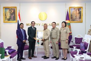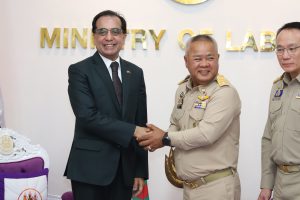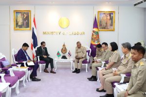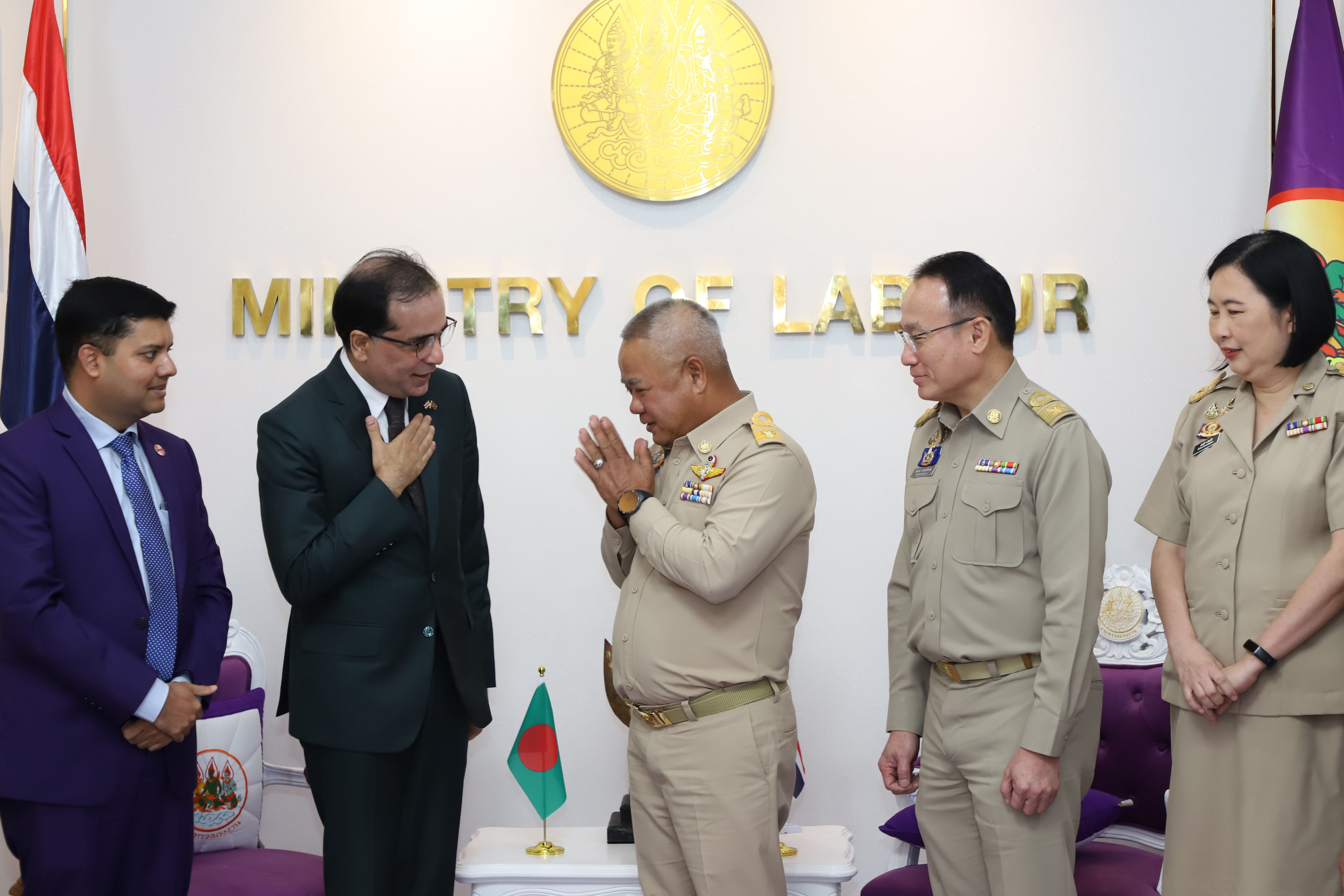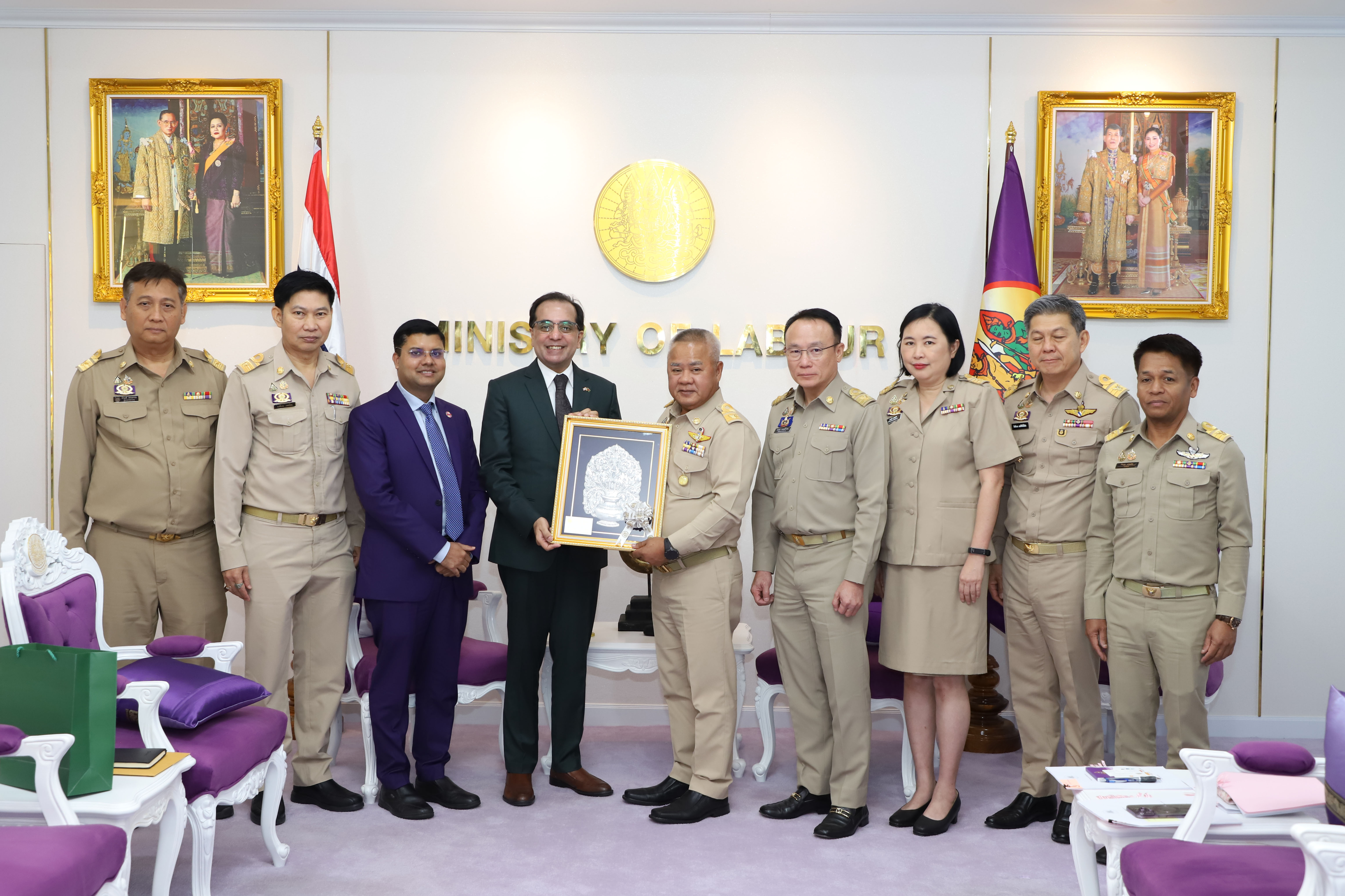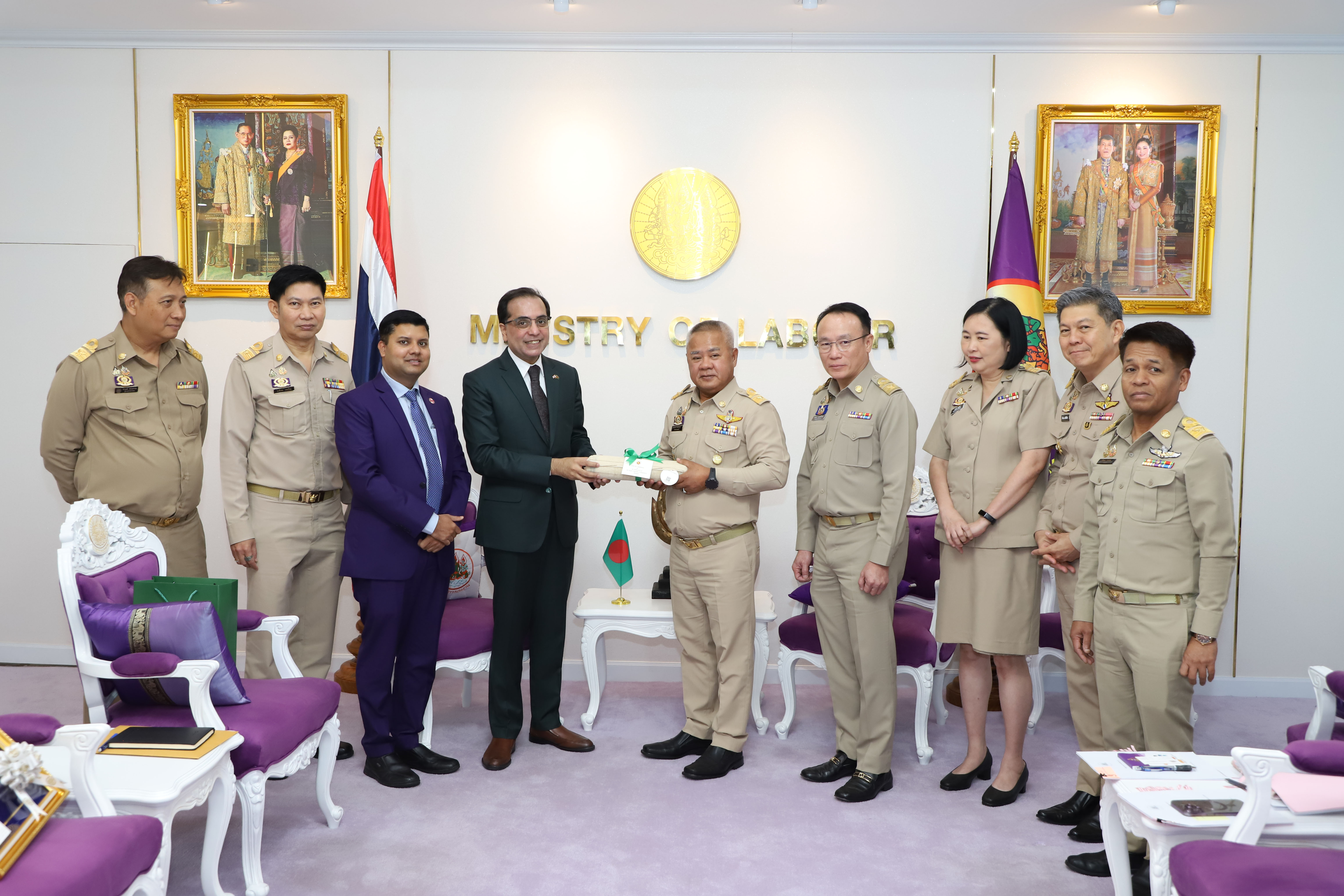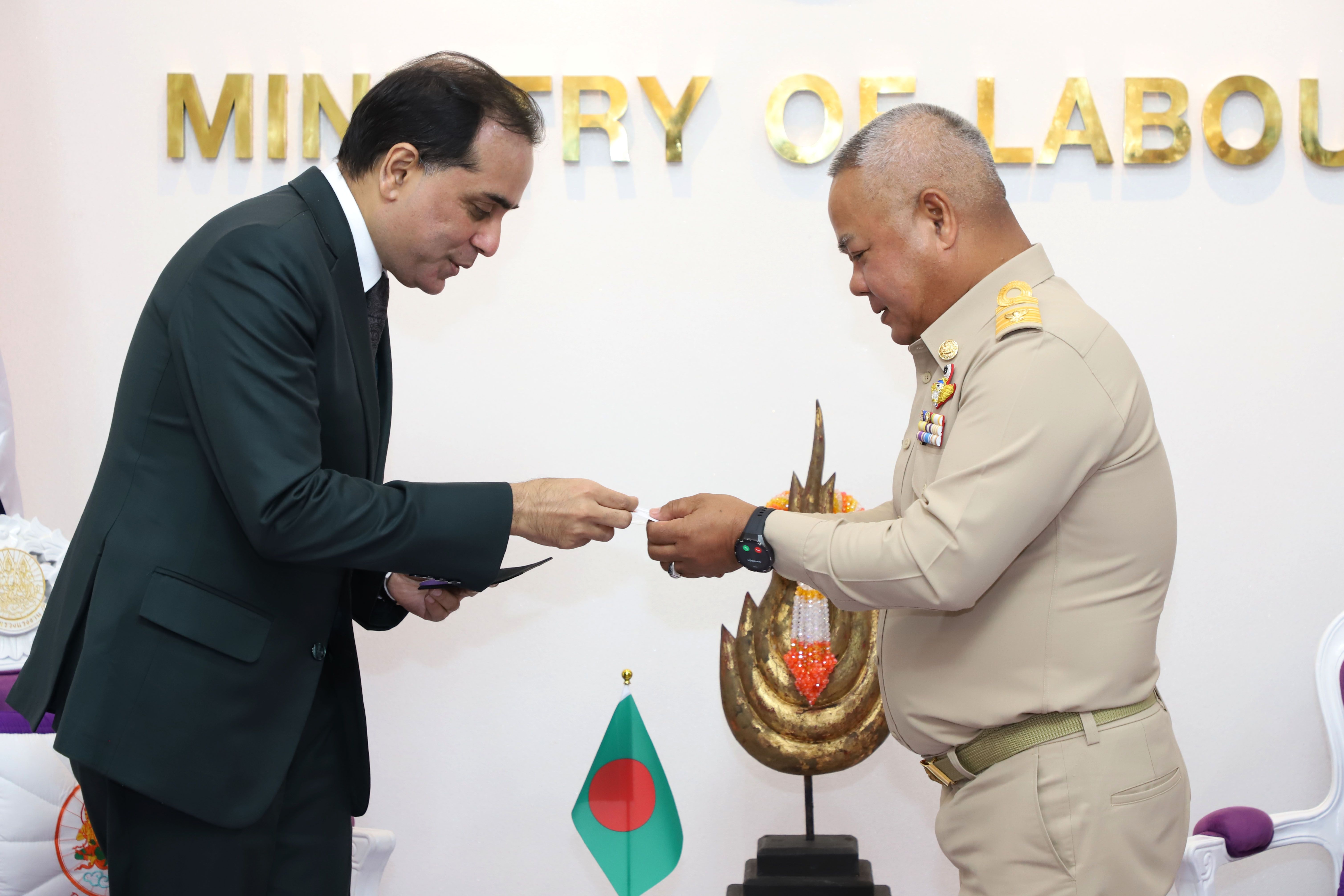 วันที่ 3 มีนาคม 2568 เวลา 13.00 น. นายบุญสงค์ ทัพชัยยุทธ์ ปลัดกระทรวงแรงงาน ให้การต้อนรับ นายฟัยยาซ มูรชิด กาซี (H.E. Mr. Faiyaz Murshid Kazi) เอกอัครราชทูตวิสามัญผู้มีอำนาจเต็มแห่งสาธารณรัฐประชาชนบังกลาเทศประจำประเทศไทย และคณะ ในโอกาสเข้าพบเพื่อเยี่ยมคารวะและหารือข้อราชการด้านแรงงานในประเด็น โอกาสสำหรับแรงงานบังกลาเทศในการทำงานในประเทศไทย และ โอกาสสำหรับความร่วมมือไทย – บังกลาเทศ ในด้านต่าง ๆ เช่น การพัฒนาทักษะ การคุ้มครองแรงงาน การประกันสังคม และแรงงานสัมพันธ์ โดยมี นายสมชาย มรกตศรีวรรณ อธิบดีกรมการจัดหางาน นางสาวนันทินี ทรัพย์ศิริ ที่ปรึกษาด้านประสิทธิภาพ สำนักงานประกันสังคม นายศักดินาถ สนธิศักดิ์โยธิน ผู้ช่วยปลัดกระทรวงแรงงาน นายภัทรวุธ เภอแสละ รองอธิบดีกรมพัฒนาฝีมือแรงงาน นายพงศ์เทพ เพชรโสม รองอธิบดีกรมสวัสดิการและคุ้มครองแรงงาน และนายจำนงค์ ทรงเคารพ ผู้ตรวจราชการกรม กรมการจัดหางาน พร้อมด้วยเจ้าหน้าที่กระทรวงแรงงาน เข้าร่วมเยี่ยมคารวะ ณ ห้องรับรองปลัดกระทรวงแรงงาน ชั้น 7 อาคารกระทรวงแรงงาน