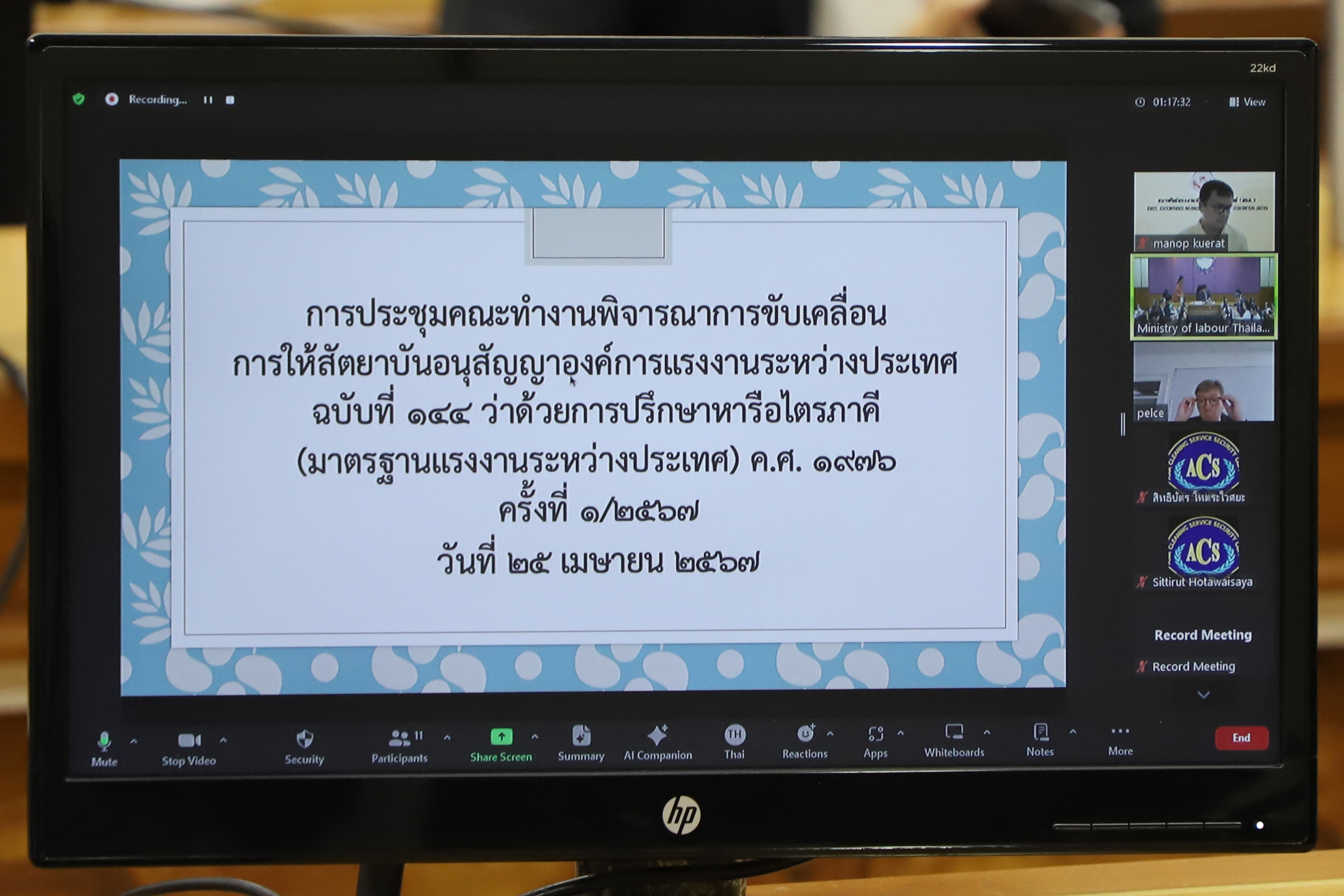 ทั้งนี้ การประชุมดังกล่าว จัดขึ้นเพื่อทบทวนความเข้าใจของหน่วยงานไตรภาคี ทั้งภาครัฐ นายจ้าง และลูกจ้างเกี่ยวกับบทบัญญัติของอนุสัญญา รวมถึงพิจารณาเกี่ยวกับรูปแบบของวิธีการปรึกษาหารือและกลไกที่เกี่ยวข้อง และการกำหนดรูปแบบการปรึกษาหารือที่เหมาะสมก่อนเพื่อเป็นข้อมูลประกอบการเสนอคณะรัฐมนตรีเพื่อโปรดพิจารณาต่อไป โดยที่ประชุมได้พิจารณา เกี่ยวกับการให้สัตยาบันอนุสัญญาองค์การแรงงานระหว่างประเทศฉบับที่ 144 ว่าด้วย การปรึกษาหารือไตรภาคี (มาตรฐานแรงงานระหว่างประเทศ) ค.ศ. 1976 และกำหนดรูปแบบของการปรึกษาหารือที่จะดำเนินการภายหลังการให้สัตยาบัน