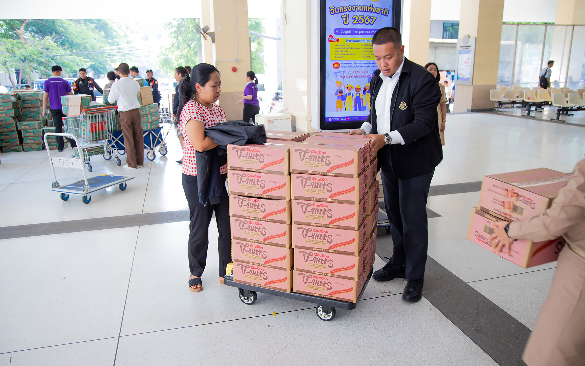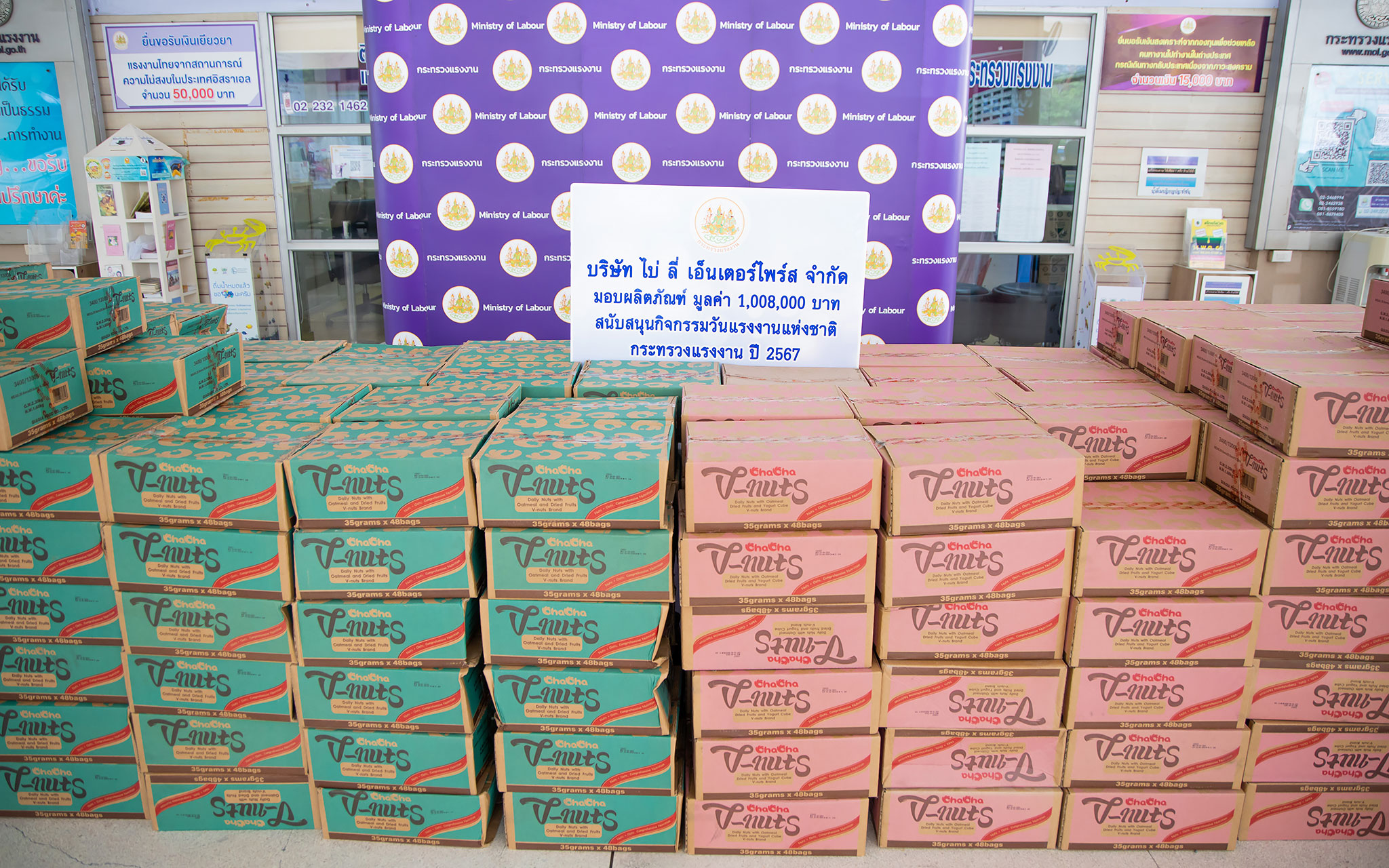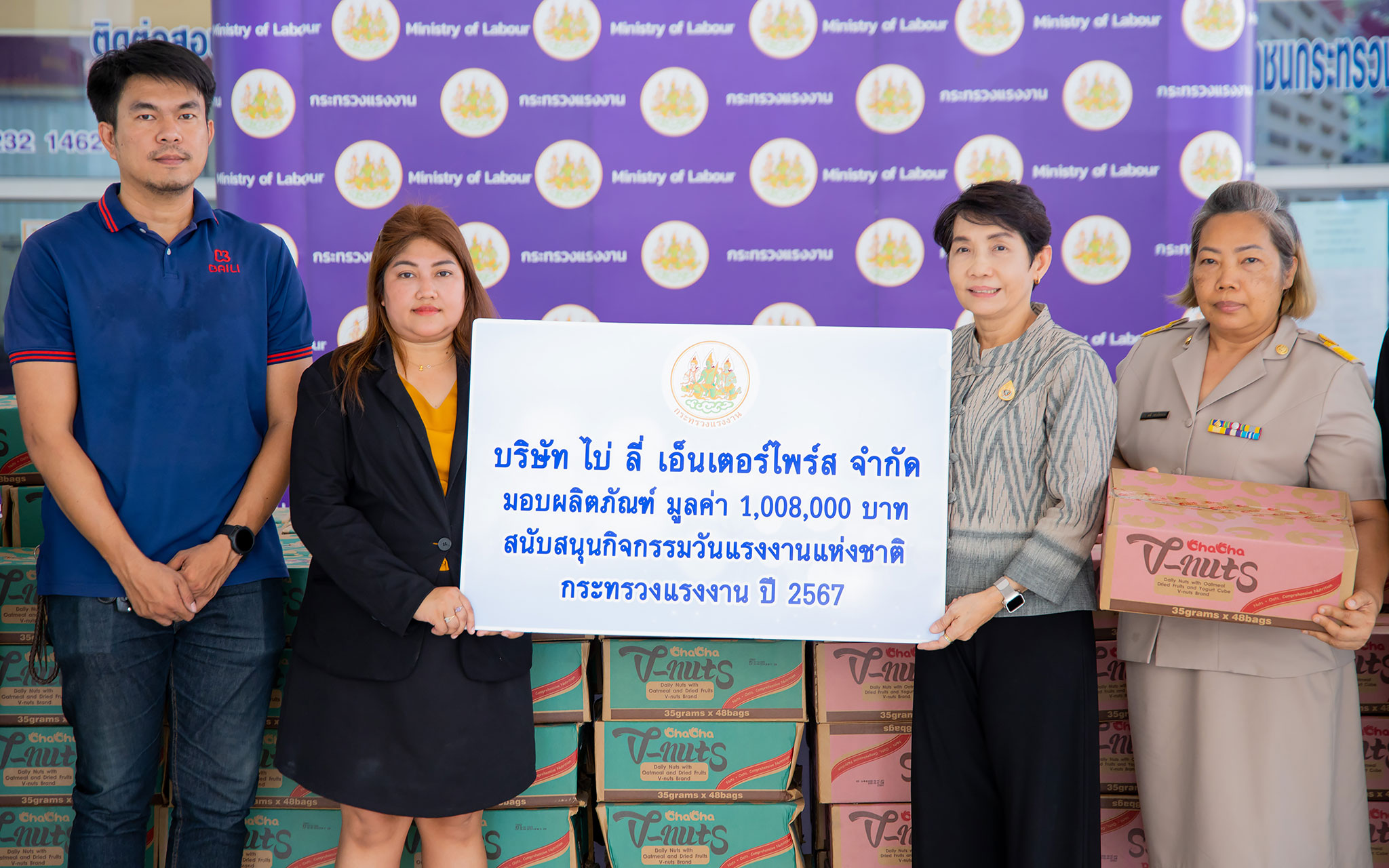 วันที่ 30 เมษายน 2567 เวลา 15.00 น. นายไพโรจน์ โชติกเสถียร ปลัดกระทรวงแรงงาน มอบหมายให้ นางสาวกรจิรัฏฐ์ พงจันทร์ศธร ผู้ช่วยปลัดกระทรวงแรงงาน เป็นผู้แทนรับมอบผลิตภัณฑ์ของบริษัท ไบ่ ลี่ เอ็นเตอร์ไพร์ส จำกัด ซึ่งเป็นขนมอบกรอบชาช่าวีนัสโอ๊ตมีล ออรอจินัล และชาช่าวีนัสโอ๊ตมีล โยเกิร์ต รวมจำนวนทั้งสิ้น 700 ลัง 33,600 ห่อ มูลค่า 1,008,000 บาท เพื่อสนับสนุนให้กระทรวงแรงงานนำไปส่งมอบแก่เจ้าหน้าที่ผู้ปฏิบัติงาน พี่น้องผู้ใช้แรงงาน และประชาชนที่มาร่วมกิจกรรมเนื่องในวันแรงงานแห่งชาติ ประจำปี 2567 โดยมีผู้แทนหน่วยงานในสังกัดกระทรวงแรงงาน ร่วมรับมอบ ณ บริเวณโถงด้านล่าง อาคารกระทรวงแรงงาน