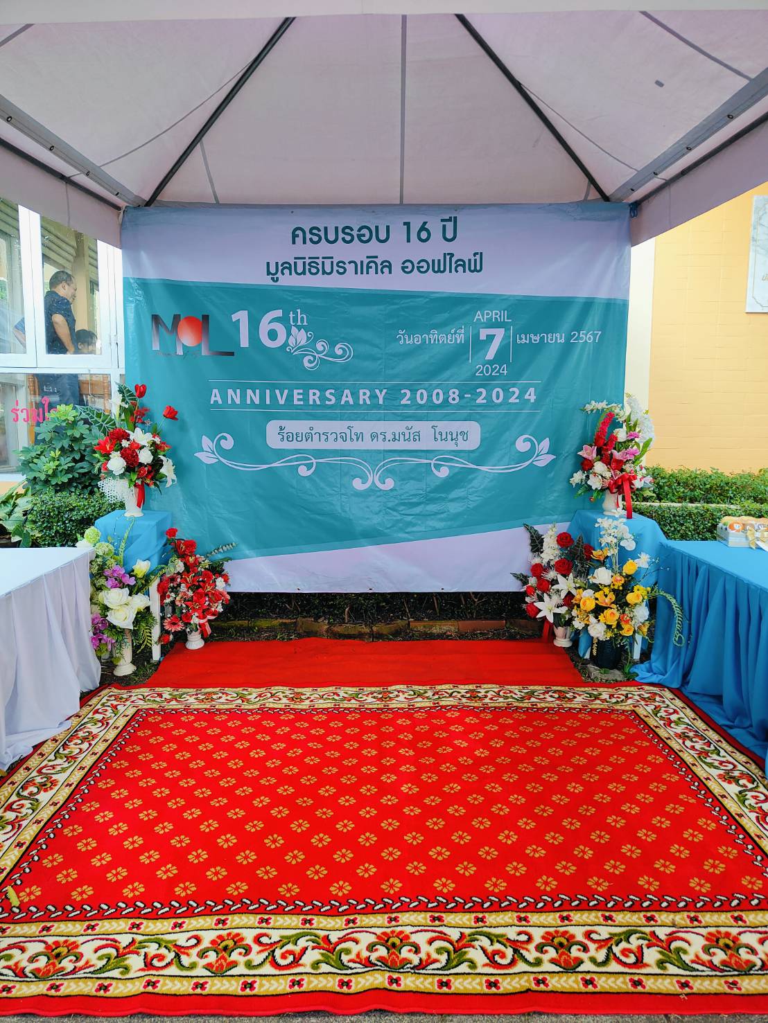 On April 7, 2024, at 07.00 hours, the Permanent Secretary of Labour, Mr. Pairoj Chotikasathien, assigned the Assistant to the Permanent Secretary of Labour, Mr. Sakdinart Sonthisakyotin, as a representative to present a basket of flowers as congratulations on the occasion of the Miracle of Life Foundation’s 16th anniversary. Police Lieutenant Dr. Manat Nonuch, Chairman of the Miracle of Life Foundation, received the flowers at the Miracle of Life Foundation Building, Railway Training Center Road, Chatuchak, Chatuchak District, Bangkok.