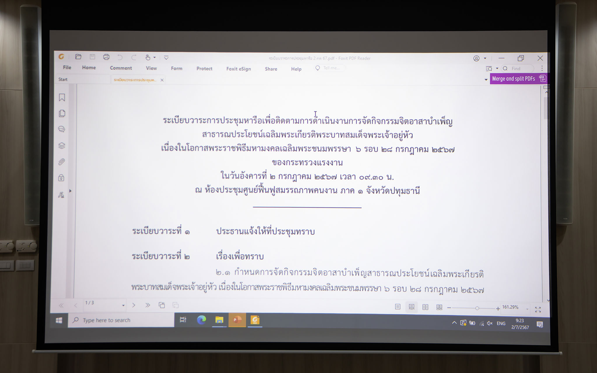 วันที่ 2 กรกฎาคม 2567 เวลา 09.30 น. นายไพโรจน์ โชติกเสถียร ปลัดกระทรวงแรงงาน มอบหมายให้ นางสาวกรจิรัฏฐ์ พงจันทร์ศธร ผู้ช่วยปลัดกระทรวงแรงงาน เป็นประธานการประชุมหารือเพื่อติดตามการดำเนินงานการจัดกิจกรรมจิตอาสาบำเพ็ญสาธารณประโยชน์ เฉลิมพระเกียรติพระบาทสมเด็จพระเจ้าอยู่หัว เนื่องในโอกาสมหามงคลเฉลิมพระชนมพรรษา 6 รอบ 28 กรกฎาคม 2567 ของกระทรวงแรงงาน โดยมี หน่วยงานในสังกัดกระทรวงแรงงานจังหวัดปทุมธานี และหน่วยงานที่เกี่ยวข้องร่วมประชุมด้วย ณ ห้องประชุมศูนย์ฟื้นฟูสมรรถภาพคนงาน ภาค 1 จังหวัดปทุมธานี อำเภอเมือง จังหวัดปทุมธานี