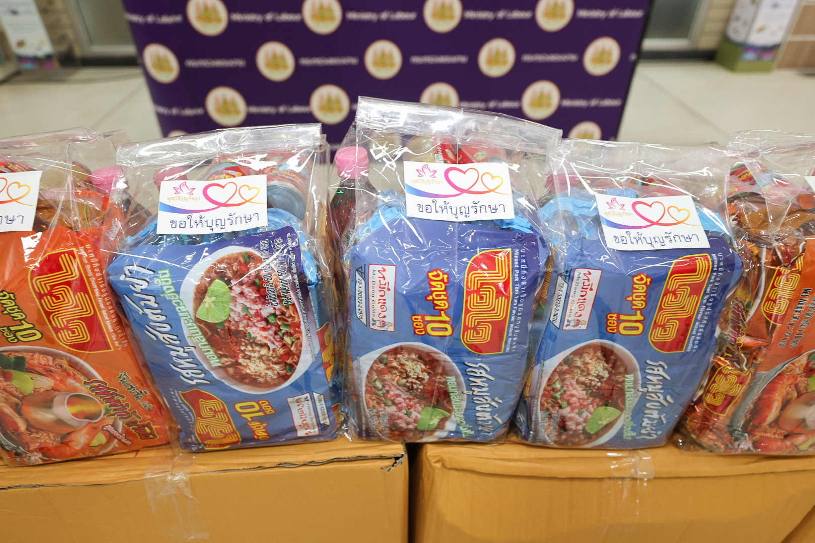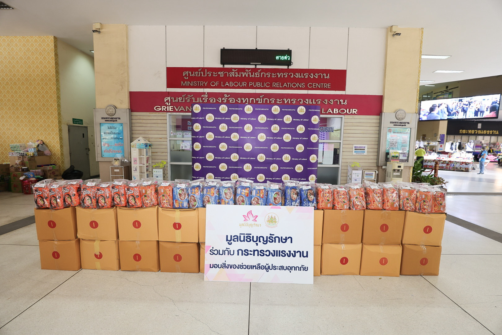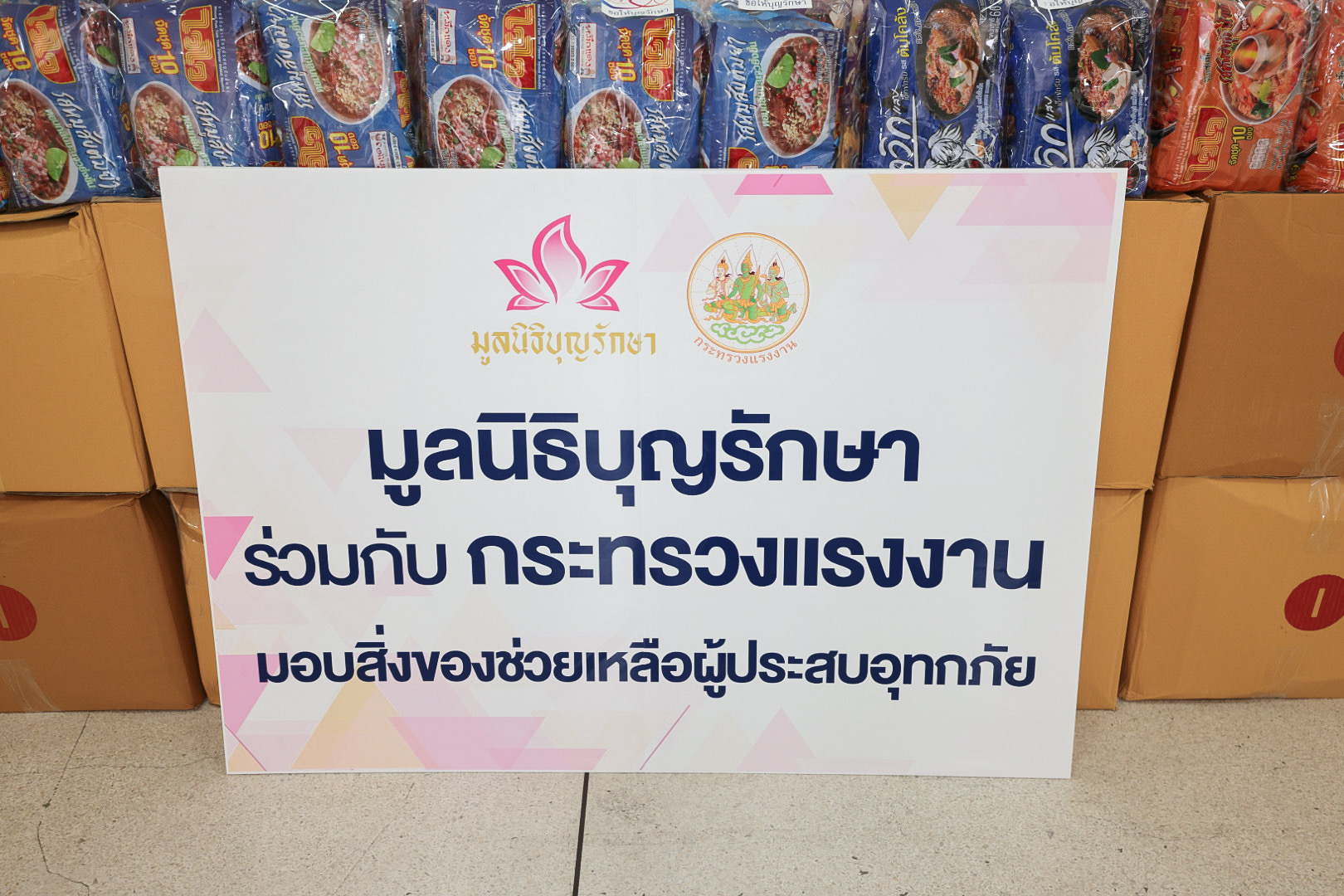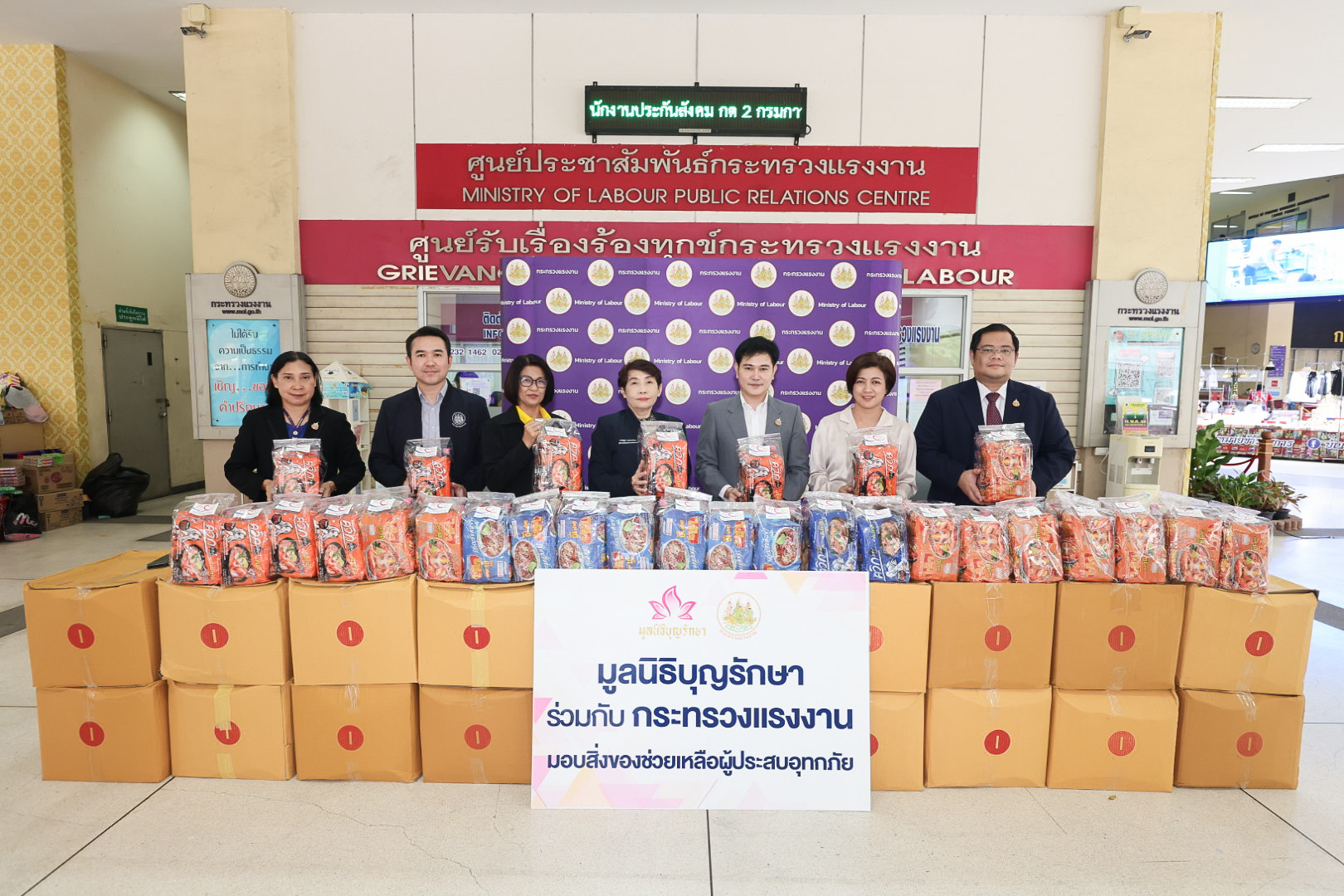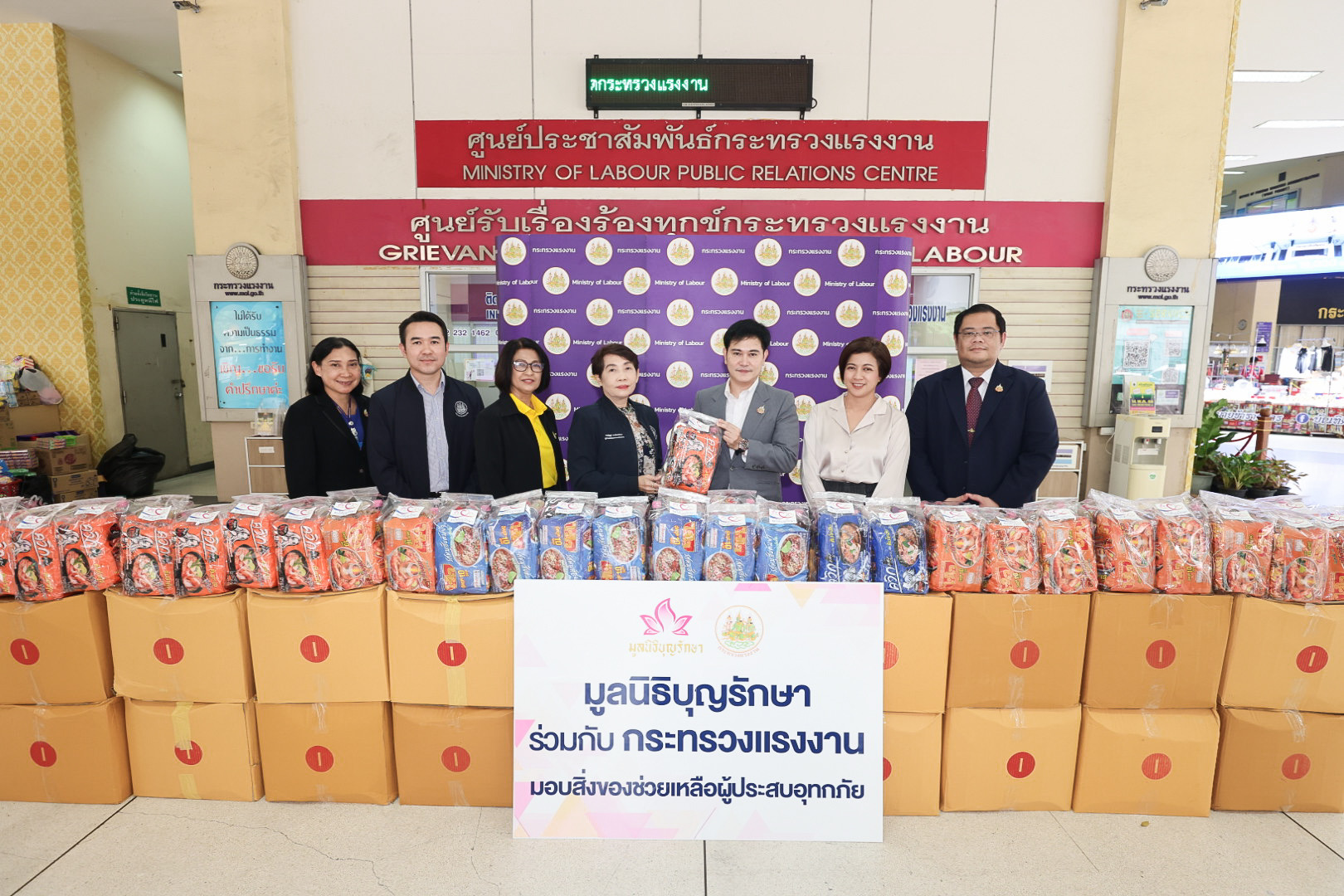 วันที่ 18 กันยายน 2567 เวลา 14.30 น. นายไพโรจน์ โชติกเสถียร ปลัดกระทรวงแรงงาน มอบหมาย นางสาวกรจิรัฏฐ์ พงจันทร์ศธร ผู้ช่วยปลัดกระทรวงแรงงาน เป็นผู้แทนรับมอบบะหมี่กึ่งสำเร็จรูป ปลากระป๋อง และ น้ำปลา จำนวน 1,000 ชุด จากมูลนิธิบุญรักษา เพื่อให้กระทรวงแรงงานนำไปช่วยเหลือผู้ประสบภัยน้ำท่วมในพื้นที่จังหวัดทางภาคเหนือ ณ บริเวณโถงชั้นล่าง อาคารกระทรวงแรงงาน