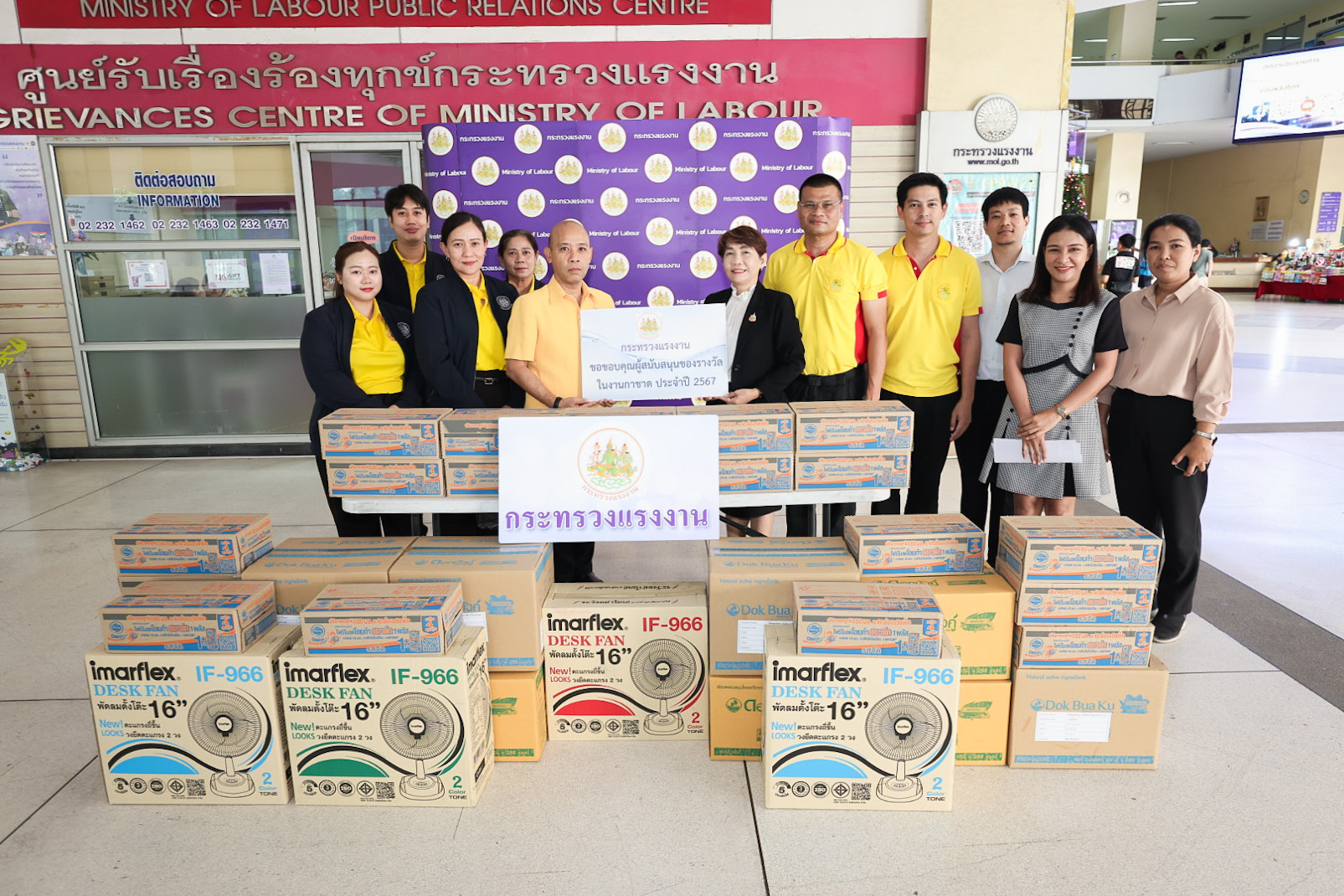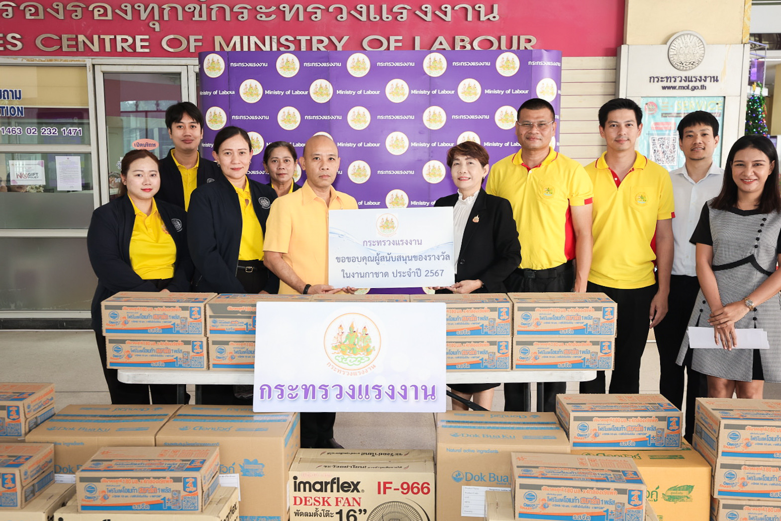 วันที่ 12 ธันวาคม 2567 เวลา 09.30 น. นายบุญสงค์ ทัพชัยยุทธ์ ปลัดกระทรวงแรงงาน มอบหมายให้ นางสาวกรจิรัฏฐ์ พงจันทร์ศธร ผู้ช่วยปลัดกระทรวงแรงงาน รับมอบเครื่องอุปโภคบริโภค เครื่องใช้ไฟฟ้า ซึ่งได้รับการสนับสนุนจากสถานประกอบการในพื้นที่จังหวัดสมุทรปราการ ในการนี้ สำนักงานแรงงานจังหวัดสมุทรปราการเป็นผู้แทนส่งมอบ ประกอบด้วย พัดลม นมจืด และยาสีฟัน เพื่อร่วมสนับสนุนของช่วยเหลือผู้ประสบภัยน้ำท่วมและรางวัลกิจกรรมการออกร้านกาชาดกระทรวงแรงงาน ในงานกาชาด ประจำปี 2567 ณ บริเวณโถงชั้นล่าง อาคารกระทรวงแรงงาน