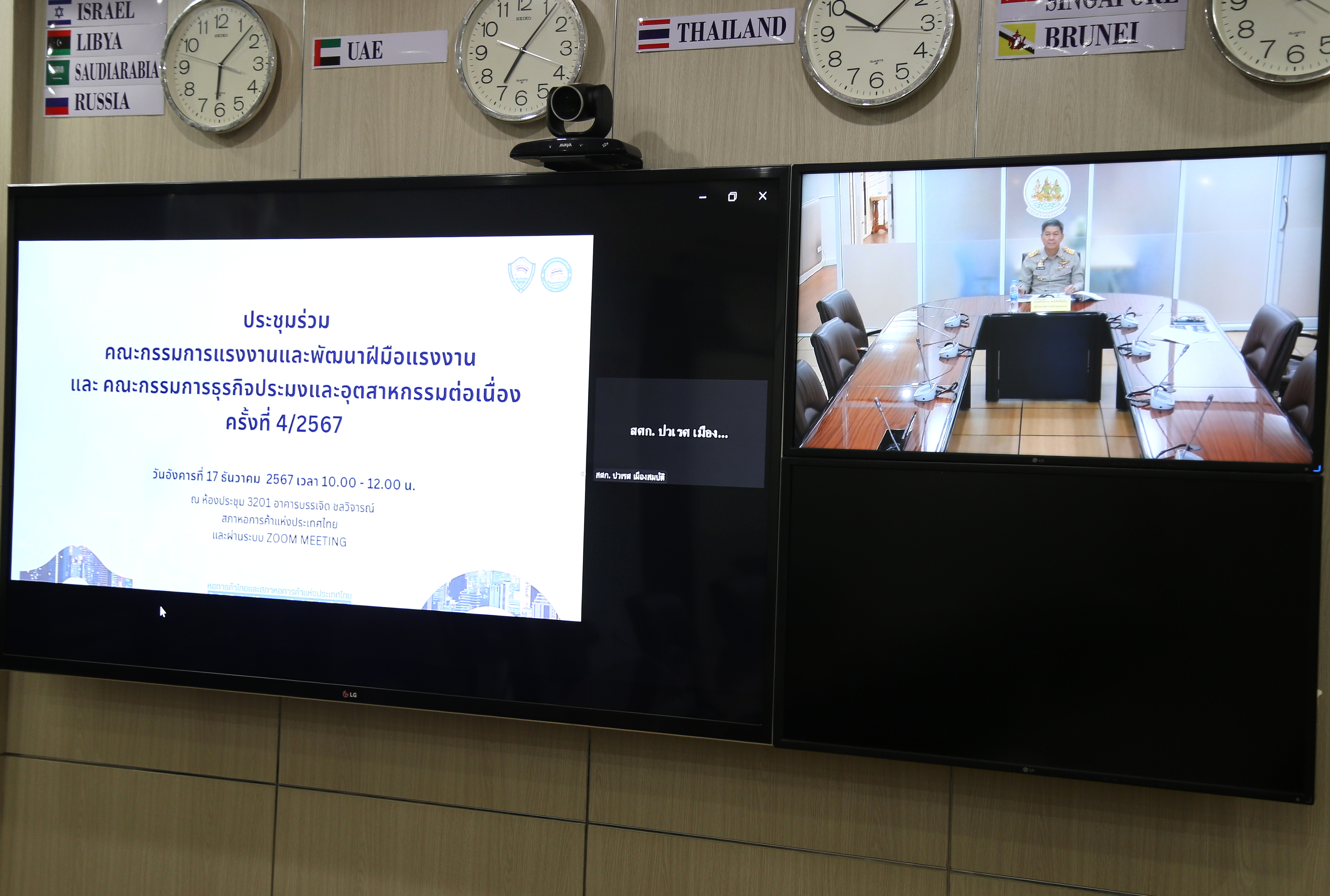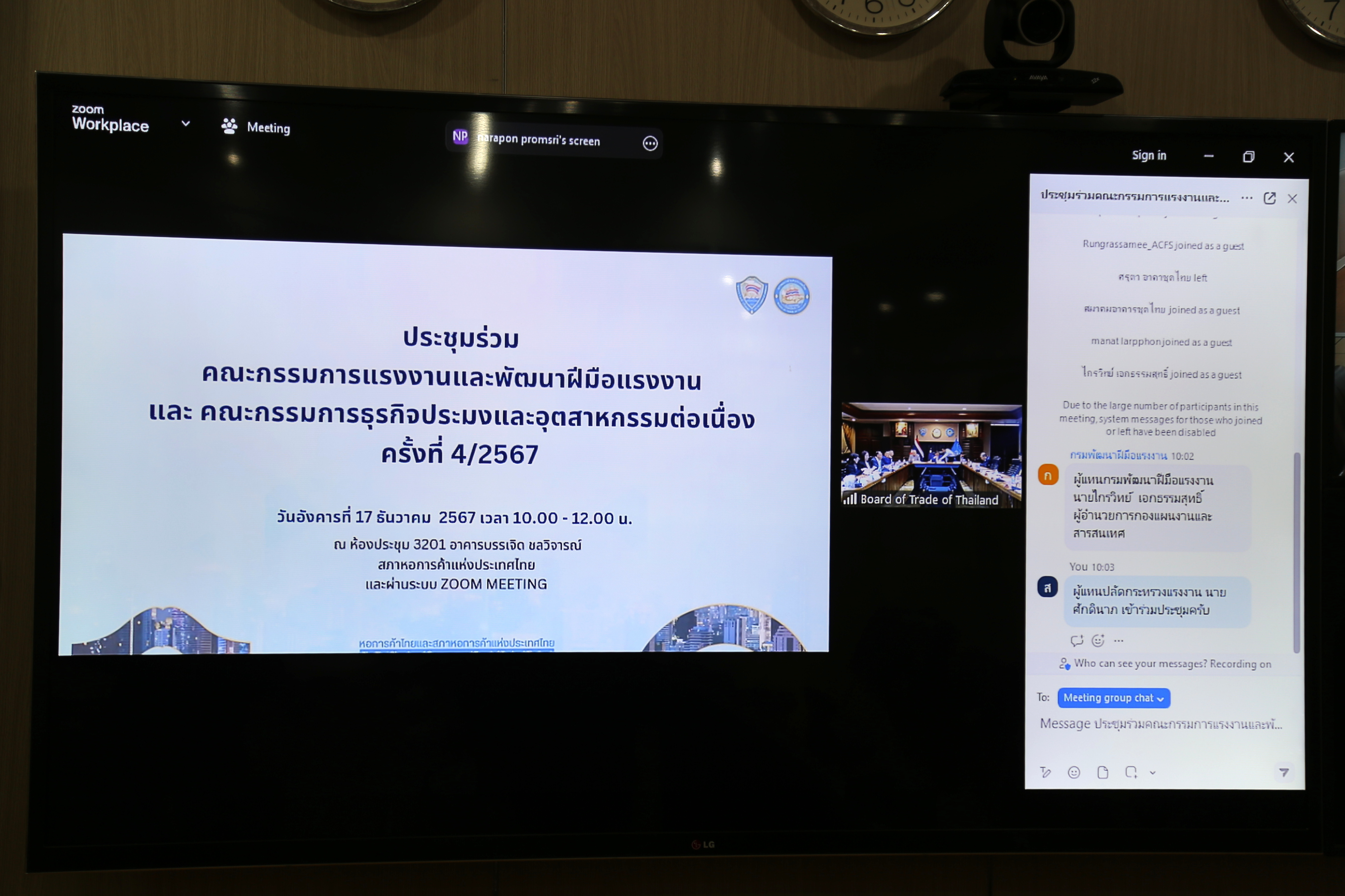 วันที่ 17 ธันวาคม 2567 เวลา 10.00 น. นายบุญสงค์ ทัพชัยยุทธ์ ปลัดกระทรวงแรงงาน มอบหมายให้ นายศักดินาถ สนธิศักดิ์โยธิน ผู้ช่วยปลัดกระทรวงแรงงาน ร่วมการประชุมคณะกรรมการแรงงานและพัฒนาฝีมือ และคณะกรรมการธุรกิจประมงและอุตสาหกรรมต่อเนื่อง ครั้งที่ 4/2567 ผ่านระบบออนไลน์โปรแกรม Zoom Meeting โดยมี ดร.พจน์ อร่ามวัฒนานนท์ รองประธานกรรมการหอการค้าไทย ประธานคณะกรรมการแรงงานและพัฒนาฝีมือแรงงาน เป็นประธานการประชุม ณ ห้องประชุมแสงสิงแก้ว ชั้น 5 อาคารกระทรวงแรงงาน