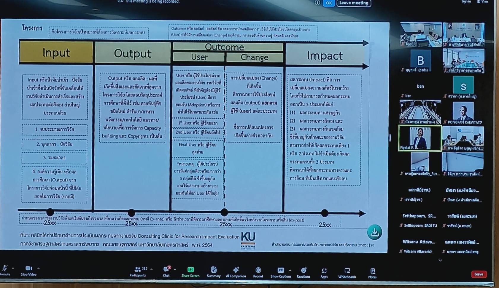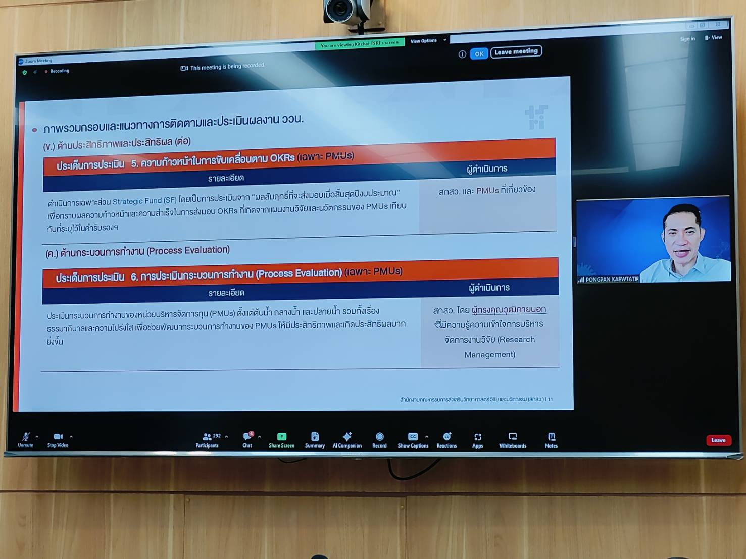 โอกาสนี้ได้รับเกียรติจาก รศ.ดร.พงศ์พันธ์ แก้วตาทิพย์ เลขานุการคณะกรรมการติดตามและประเมินผลการสนับสนุนวิทยาศาสตร์ การวิจัยและนวัตกรรม รองผู้อำนวยการสำนักงานคณะกรรมการส่งเสริมวิทยาศาสตร์ วิจัยและนวัตกรรม (สกสว.) กล่าวรายงานวัตถุประสงค์พร้อมเปิดการประชุม และบรรยายทบทวนในหัวข้อ “หลักเกณฑ์การประเมินผลลัพธ์และผลกระทบสำหรับแผนงานขนาดเล็ก กรณีงบประมาณน้อยกว่า 100 ล้านบาท” และ ดร.ปิยะทัศน์ พาฬอนุรักษ์ ผู้อำนวยการสำนักติดตามและประเมิน สกสว. นำเสนอในหัวข้อ “กระบวนการในการประเมินผลลัพธ์และผลกระทบสำหรับแผนงานวิจัยและนวัตกรรม และแนวทางการดำเนินการ” สำหรับการประชุมดังกล่าว มีวัตถุประสงค์เพื่อทบทวนความเข้าใจหลักเกณฑ์และแนวทางการประเมินผลลัพธ์และผลกระทบของงานวิจัย ตลอดจนกระบวนการที่เกี่ยวข้องกับการประเมิน ประกอบด้วย การสังเคราะห์สถานภาพของแผนงานวิจัย การเคราะห์ผลประโยชน์ทางวิชาการ รวมถึงการจัดเตรียมข้อมูลและการคัดเลือกโครงการกรณีศึกษาเบื้องต้น โครงการที่มีการนำผลงานวิจัยใช้ประโยชน์อย่างเป็นรูปธรรม