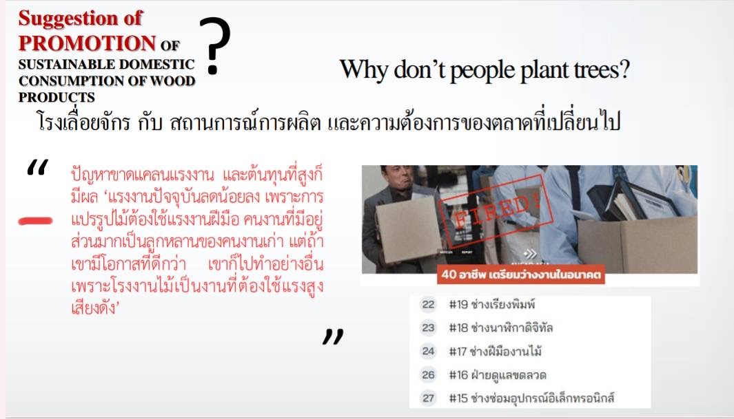 ในส่วนของกระทรวงแรงงานที่ดูแลรับผิดชอบเกี่ยวกับการพัฒนากำลังแรงงานให้เป็นแรงงานศักยภาพสูง ส่งเสริมการมีงานทำให้กับกำลังแรงงานทุกกลุ่ม ตลอดจนสร้างหลักประกันทางสังคม คุ้มครองแรงงาน และความปลอดภัยในการทำงาน ซึ่งมีประเด็นสำคัญที่เกี่ยวข้อง คือ การพัฒนาทักษะฝีมือแรงงานที่เกี่ยวข้องกับการใช้ไม้ ในโอกาสนี้ กระทรวงแรงงานพร้อมสนับสนุนการพัฒนาทักษะฝีมือแรงงานให้มีศักยภาพสูงให้เป็นที่ต้องการของตลาดแรงงานต่อไป