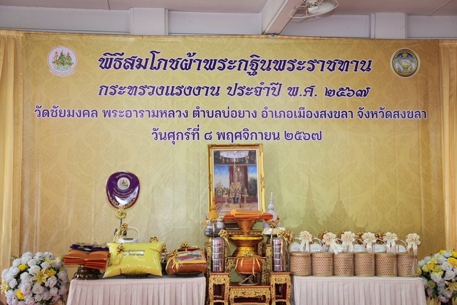 ทั้งนี้ การจัดงานพิธีถวายผ้าพระกฐินพระราชทานของกระทรวงแรงงาน ประจำปี 2567 กำหนดจัดขึ้นในวันที่ 9 พฤศจิกายน 2567 เวลา 10.00 น. โดยมี นายพิพัฒน์ รัชกิจประการ รัฐมนตรีว่าการกระทรวงแรงงาน เป็นประธานในพิธี ณ วัดชัยมงคล พระอารามหลวง ตำบลบ่อยาง อำเภอเมืองสงขลา จังหวัดสงขลา