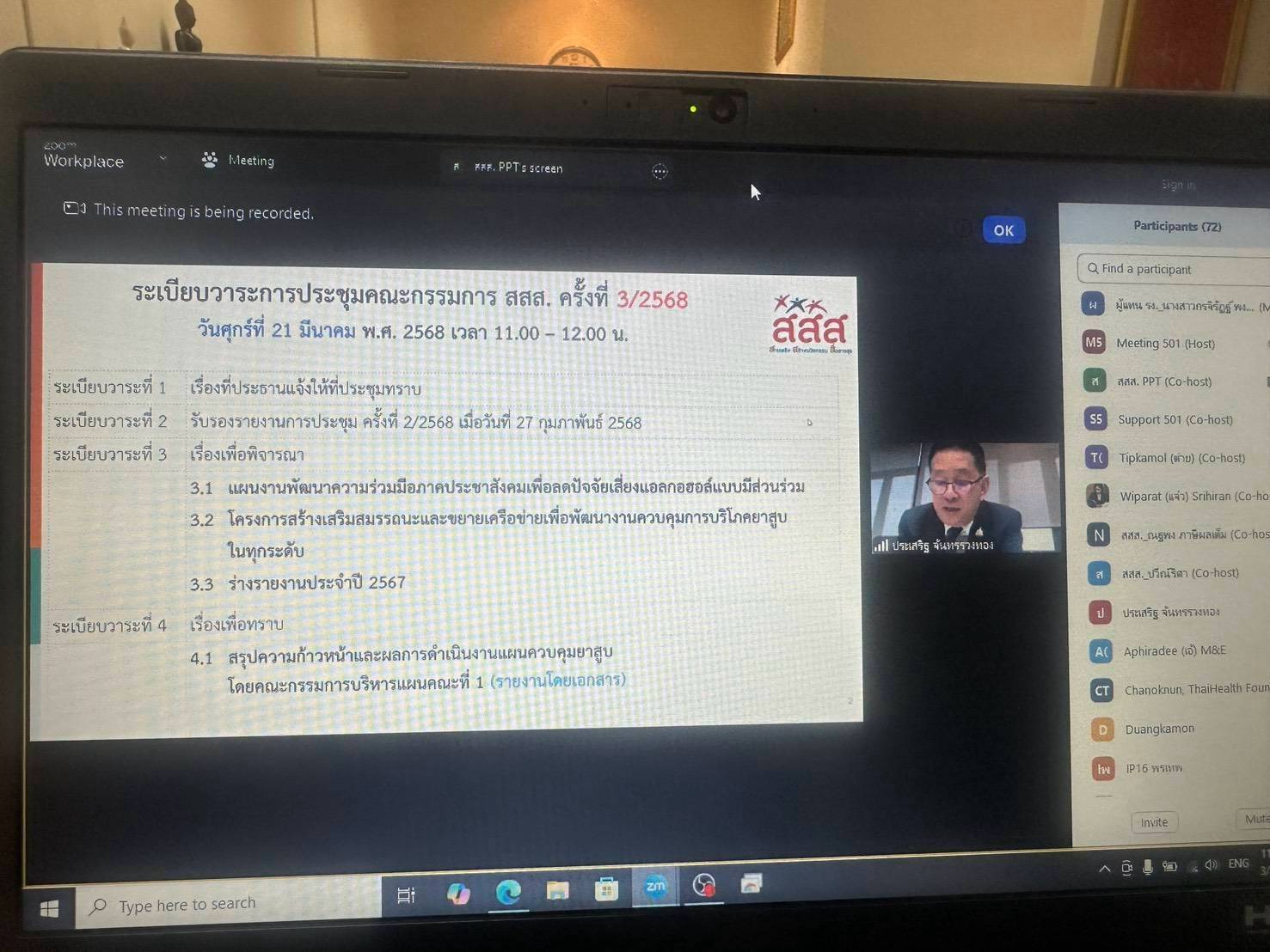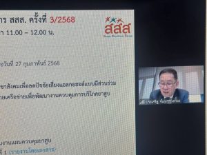 วันที่ 21 มีนาคม 2568 เวลา 11.00 น.นายบุญสงค์ ทัพชัยยุทธ์ ปลัดกระทรวงแรงงาน มอบหมายให้ นางสาวกรจิรัฏฐ์ พงจันทร์ศธร ผู้ช่วยปลัดกระทรวงแรงงาน ร่วมการประชุมคณะกรรมการสนับสนุนการสร้างเสริมสุขภาพ ครั้งที่ 3/2568 ผ่านระบบอิเล็กทรอนิกส์ โดยมี นายประเสริฐ จันทรรวงทอง รองนายกรัฐมนตรีและรัฐมนตรีว่าการกระทรวงดิจิทัลเพื่อเศรษฐกิจและสังคม เป็นประธานการประชุม หน่วยงานที่เกี่ยวข้องเข้าร่วม ณ ห้องปฏิบัติราชการผู้ช่วยปลัดกระทรวงแรงงาน ชั้น 7 อาคารกระทรวงแรงงาน