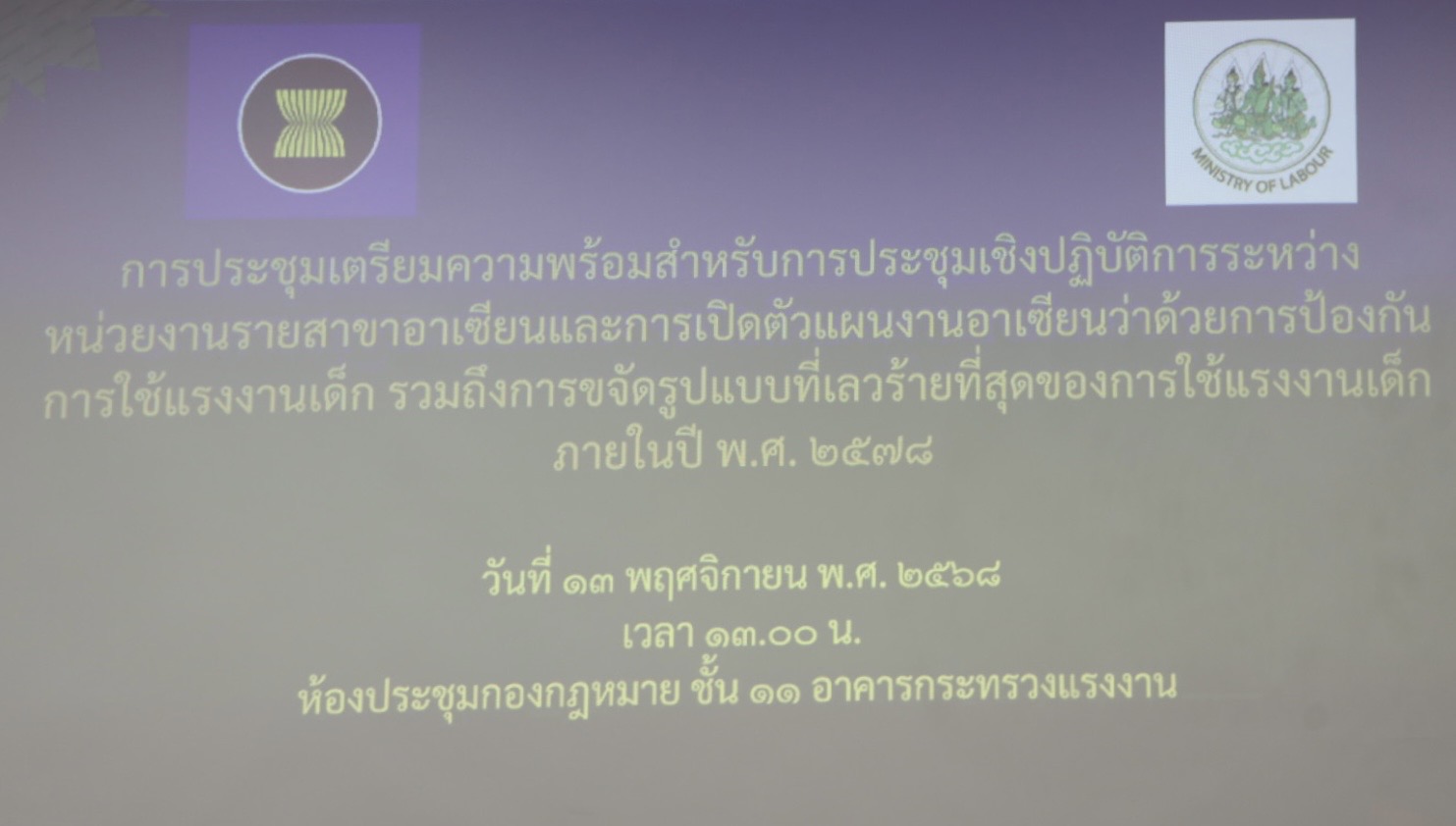 วันที่ 13 พฤศจิกายน 2568 เวลา 13.00 น. พันตำรวจโท วรรณพงษ์ คชรักษ์ ปลัดกระทรวงแรงงาน มอบหมายให้ นายศักดินาถ สนธิศักดิ์โยธิน ผู้ช่วยปลัดกระทรวงแรงงาน เป็นประธานการประชุมเตรียมความพร้อมสำหรับการประชุมเชิงปฏิบัติการระหว่างหน่วยงานรายสาขาอาเซียน และการเปิดตัวแผนงานอาเซียนว่าด้วยการป้องกันการใช้แรงงานเด็กรวมถึงการขจัดรูปแบบที่เลวร้ายที่สุดของการใช้แรงงานเด็กภายในปี พ.ศ.2578 ณ ห้องประชุมกองกฎหมาย ชั้น 11 อาคารกระทรวงแรงงาน