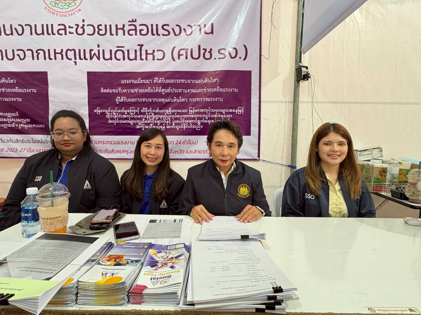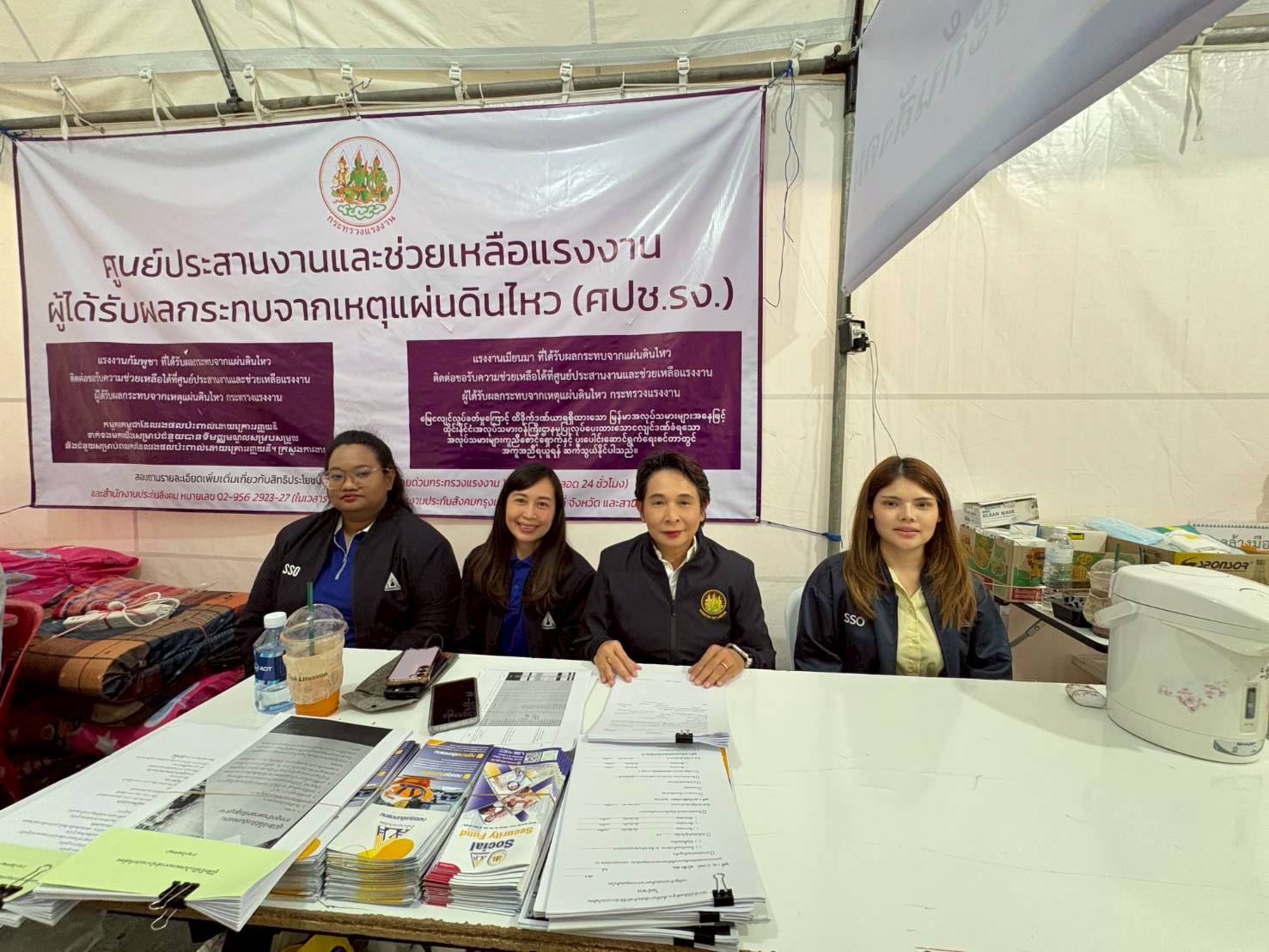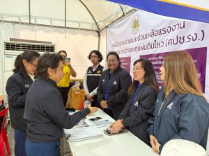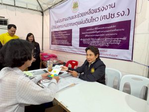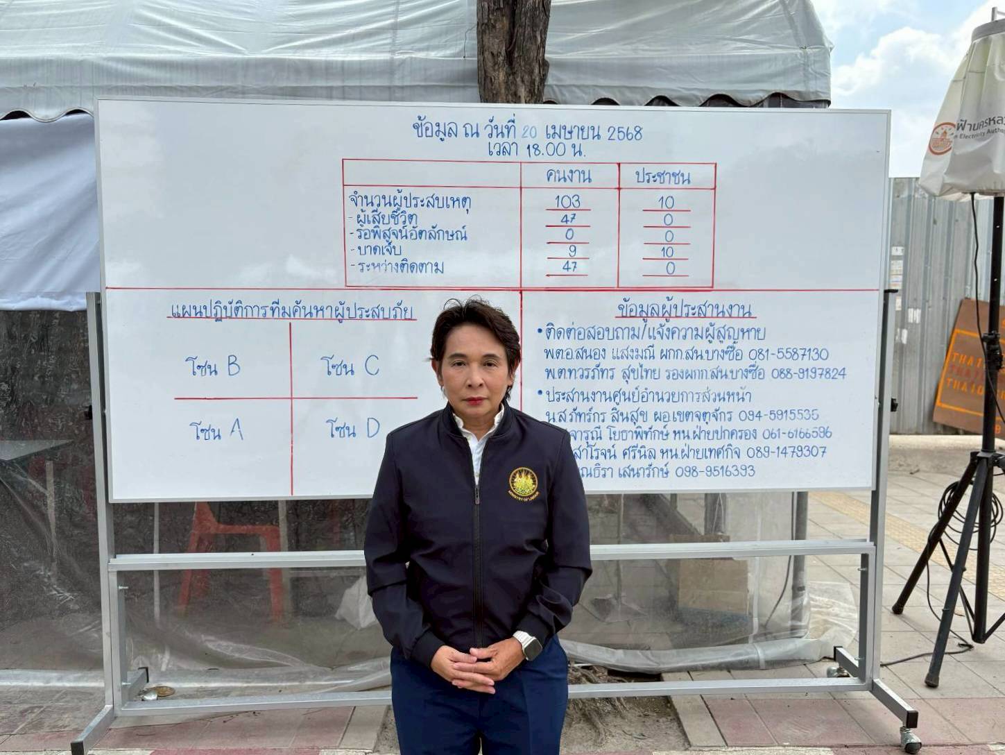 วันที่ 21 เมษายน 2568 เวลา 14.00 น. นายบุญสงค์ ทัพชัยยุทธ์ ปลัดกระทรวงแรงงาน มอบหมายให้ นางสาวจีระภา บุญรัตน์ ผู้ตรวจราชการกระทรวงแรงงาน ลงพื้นที่เยี่ยมให้กำลังใจเจ้าหน้าที่ผู้ปฏิบัติงาน เพื่อสร้างขวัญกำลังใจ และติดตามการให้ความช่วยเหลือด้านสิทธิประโยชน์แรงงาน บริเวณศูนย์ประสานงานและช่วยเหลือแรงงาน ผู้ได้รับผลกระทบจากเหตุแผ่นดินไหว (ศปช.รง.) และจุดรับแจ้งสิทธิประโยชน์ประกันสังคมผู้ได้รับผลกระทบจากเหตุโครงสร้างอาคารของโครงการก่อสร้างอาคารสำนักงานการตรวจเงินแผ่นดิน ถนนกำแพงเพชร 2 เขตจตุจักร กรุงเทพมหานคร ณ เต็นท์สำนักงานเขตจตุจักร กรุงเทพมหานคร ด้านข้างศูนย์การค้าเจเจมอลล์