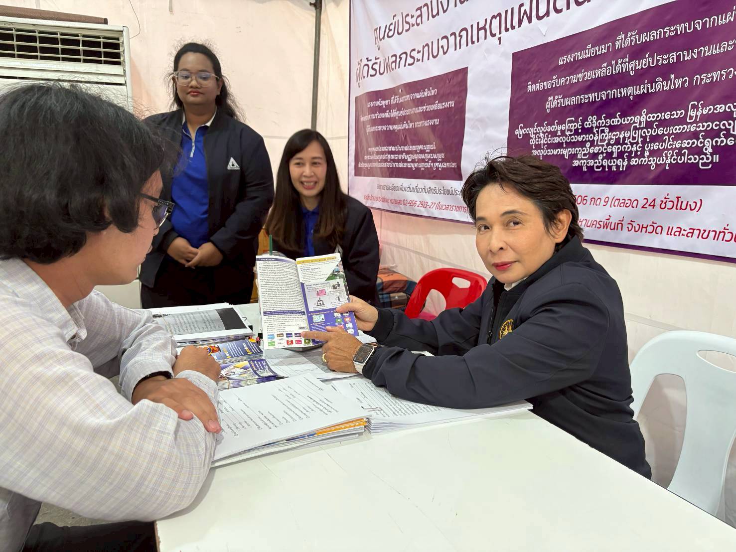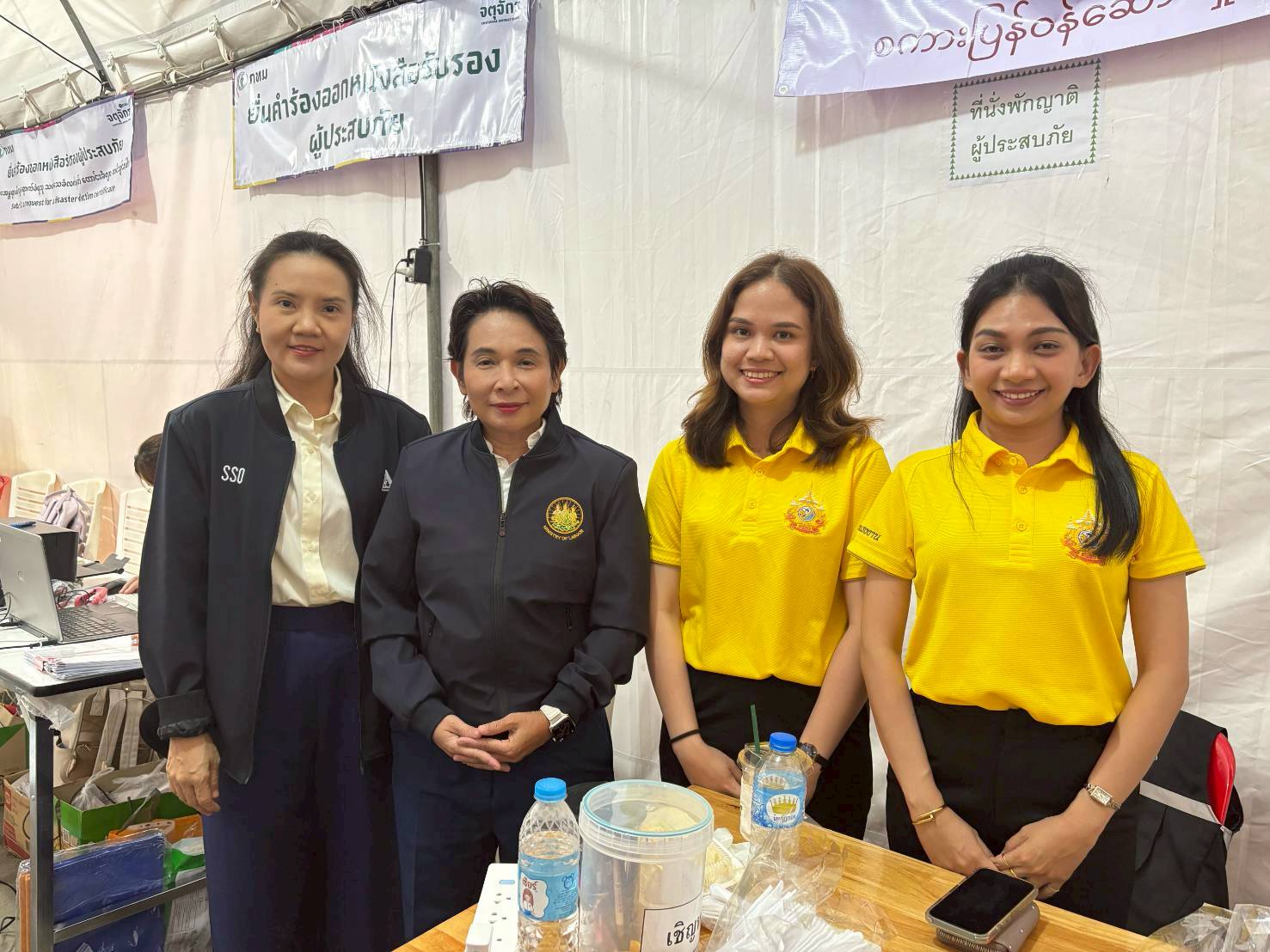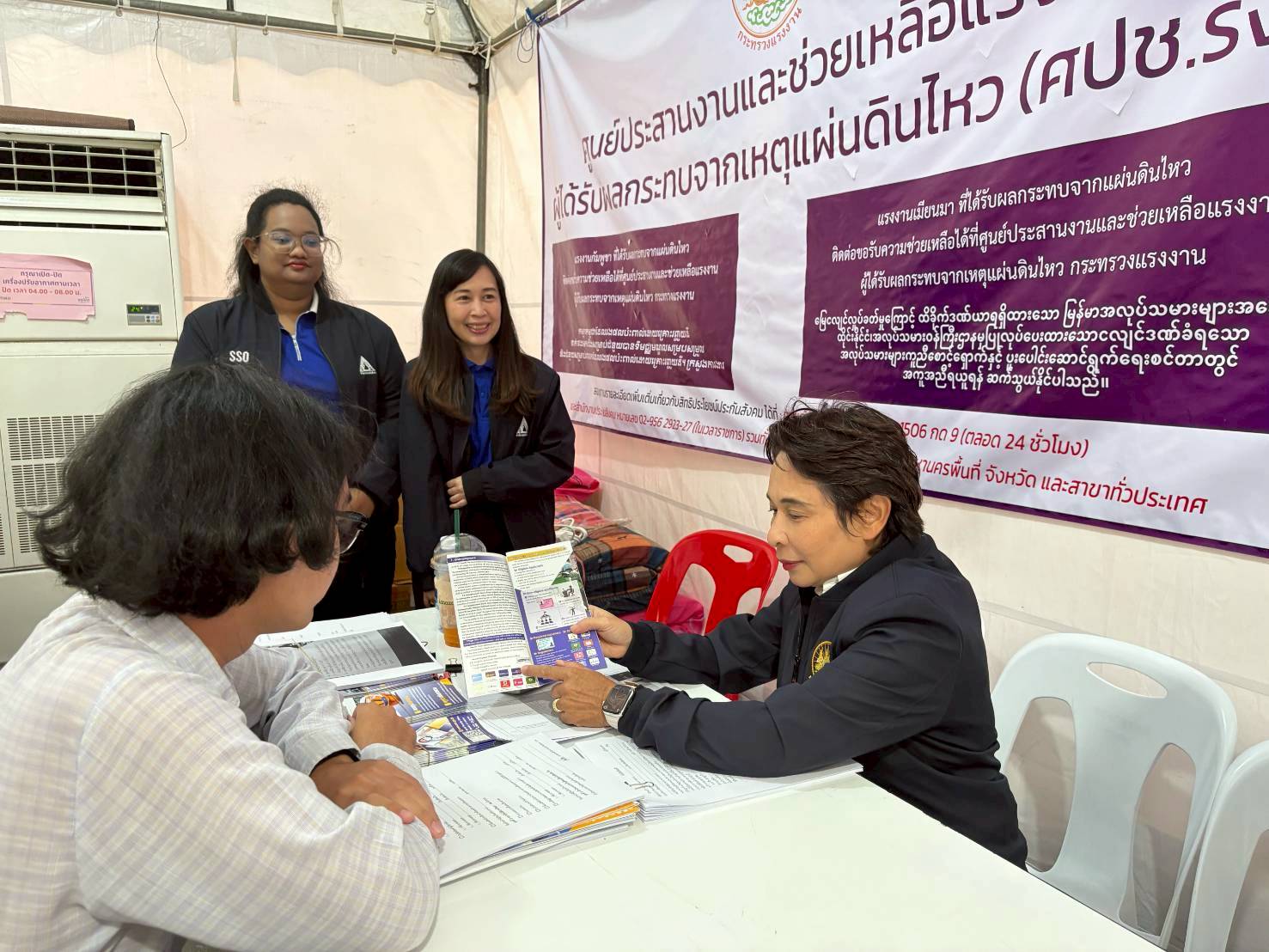 วันที่ 21 เมษายน 2568 เวลา 14.00 น. นายบุญสงค์ ทัพชัยยุทธ์ ปลัดกระทรวงแรงงาน มอบหมายให้ นางสาวจีระภา บุญรัตน์ ผู้ตรวจราชการกระทรวงแรงงาน ลงพื้นที่เยี่ยมให้กำลังใจเจ้าหน้าที่ผู้ปฏิบัติงาน เพื่อสร้างขวัญกำลังใจ และติดตามการให้ความช่วยเหลือด้านสิทธิประโยชน์แรงงาน บริเวณศูนย์ประสานงานและช่วยเหลือแรงงาน ผู้ได้รับผลกระทบจากเหตุแผ่นดินไหว (ศปช.รง.) และจุดรับแจ้งสิทธิประโยชน์ประกันสังคมผู้ได้รับผลกระทบจากเหตุโครงสร้างอาคารของโครงการก่อสร้างอาคารสำนักงานการตรวจเงินแผ่นดิน ถนนกำแพงเพชร 2 เขตจตุจักร กรุงเทพมหานคร ณ เต็นท์สำนักงานเขตจตุจักร กรุงเทพมหานคร ด้านข้างศูนย์การค้าเจเจมอลล์
