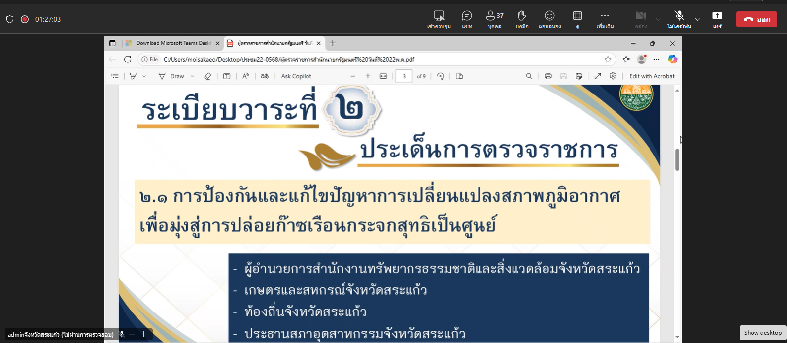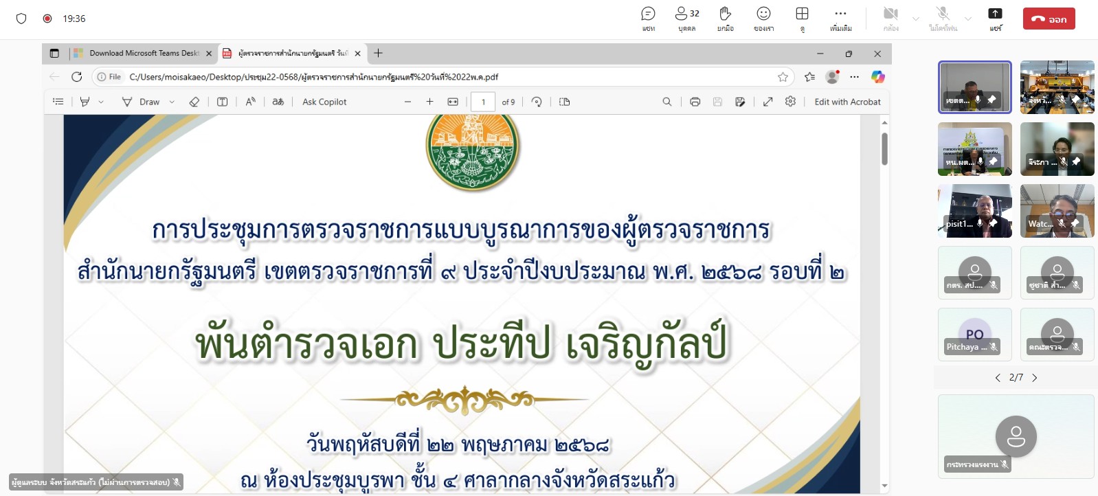 วันที่ 22 พฤษภาคม 2568 เวลา 09.00 น. นายบุญสงค์ ทัพชัยยุทธ์ ปลัดกระทรวงแรงงาน มอบหมายให้ นางสาวจีระภา บุญรัตน์ ผู้ตรวจราชการกระทรวงแรงงาน เข้าร่วมการประชุมการตรวจราชการตามแผนการตรวจราชการแบบบูรณาการของคณะผู้ตรวจราชการ เขตตรวจราชการที่ 9 ประจำปี พ.ศ. 2568 รอบที่ 2 (ผ่านสื่ออิเล็กทรอนิกส์ ระบบ Microsoft Teams) ณ ห้องปฏิบัติราชการผู้ตรวจราชการกระทรวงแรงงาน ชั้น 8 อาคารกระทรวงแรงงาน